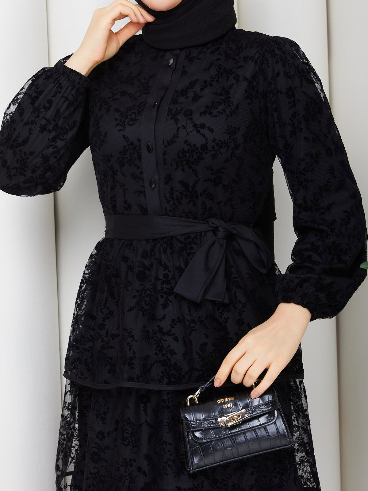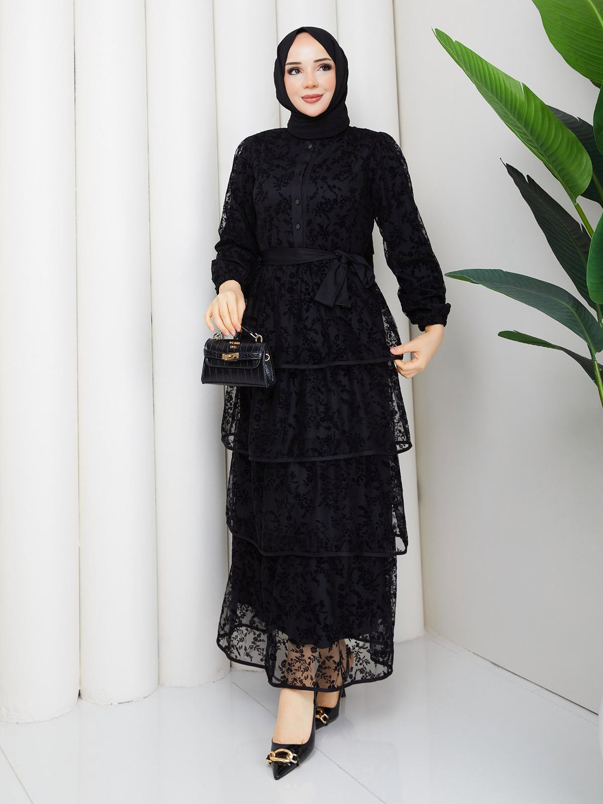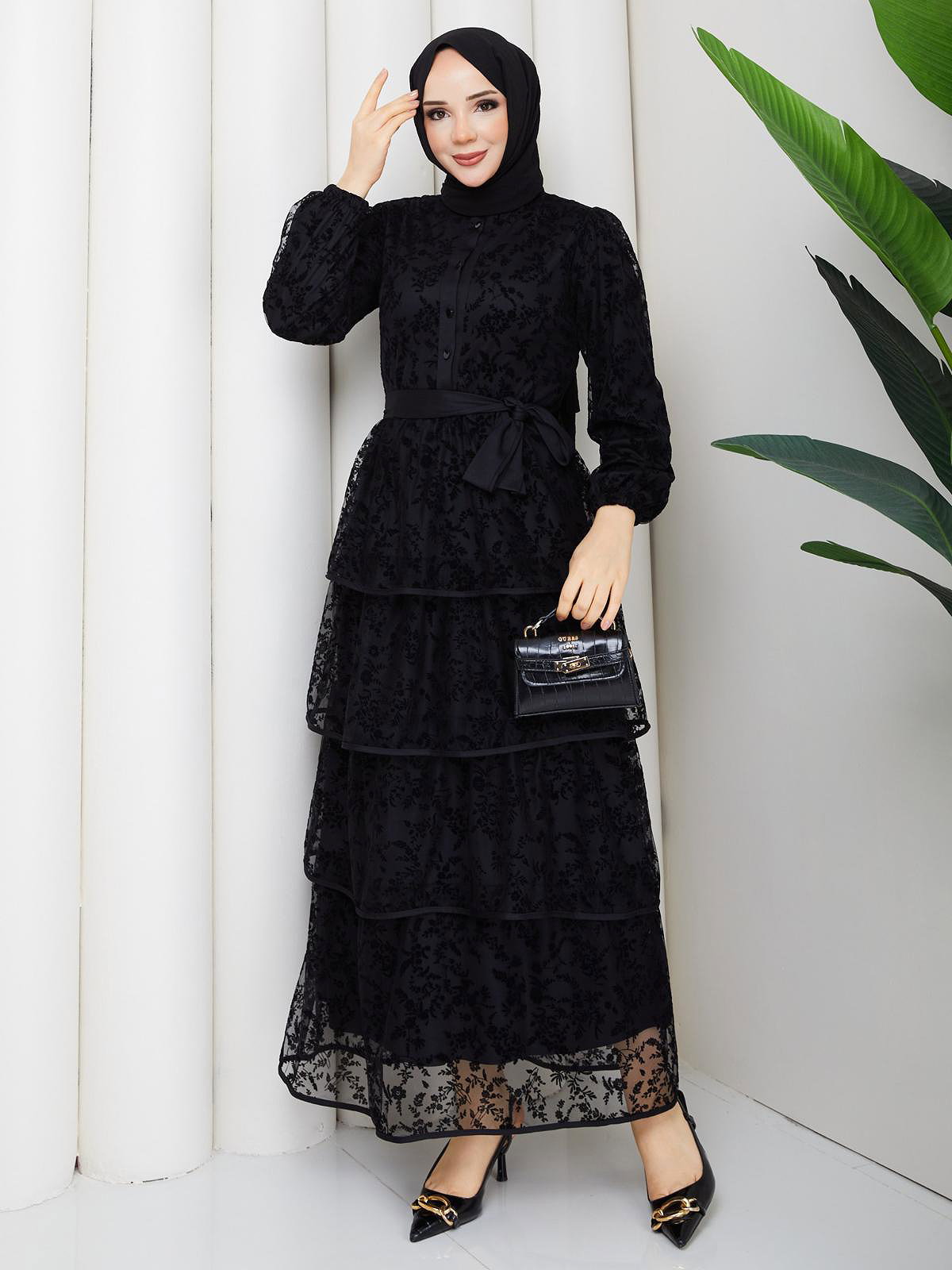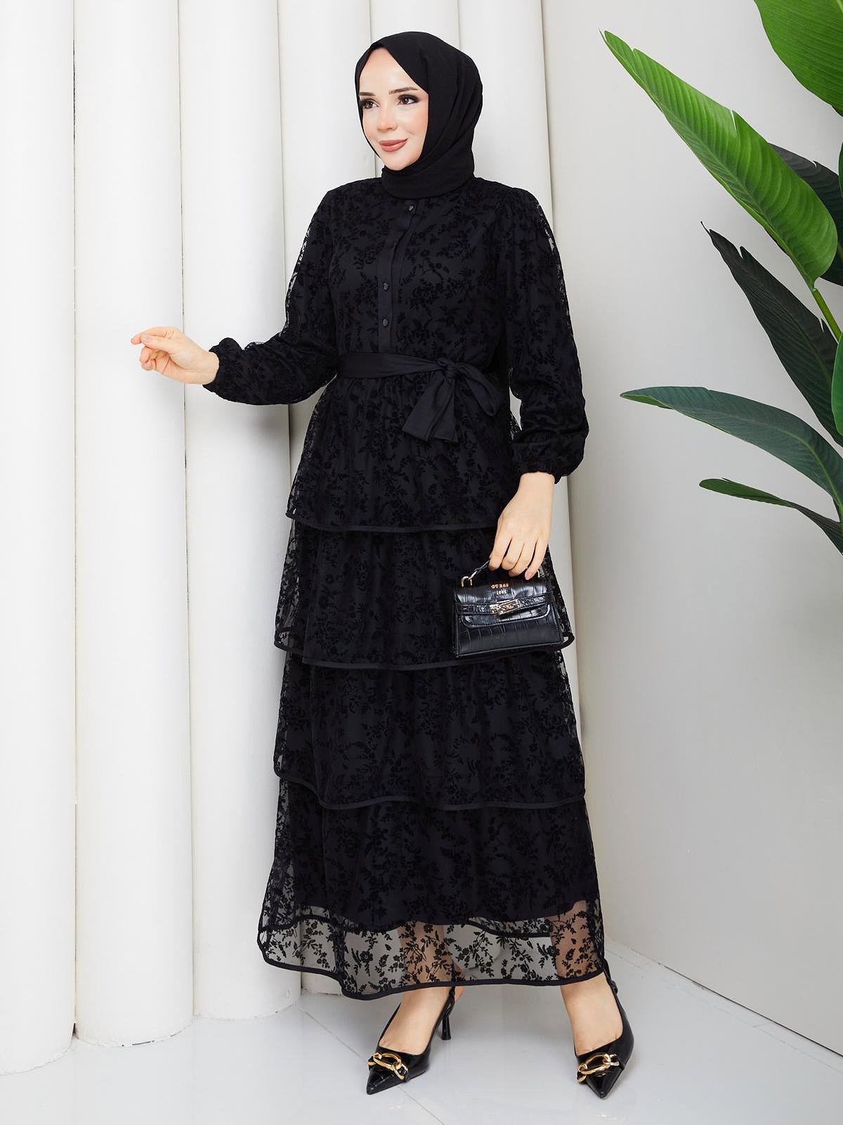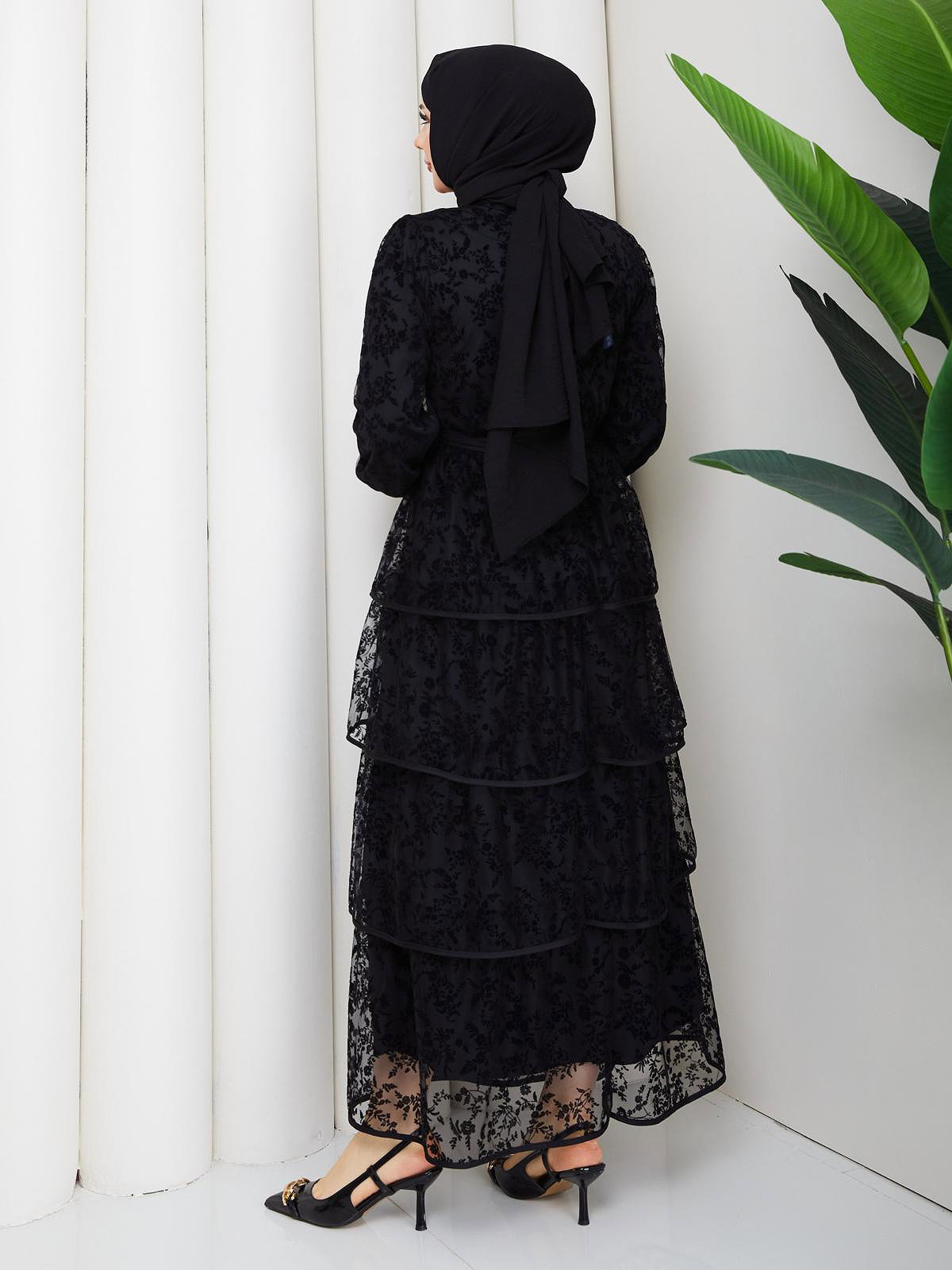 Flog Baskı Eteği Katlı Elbise- 5180 Siyah