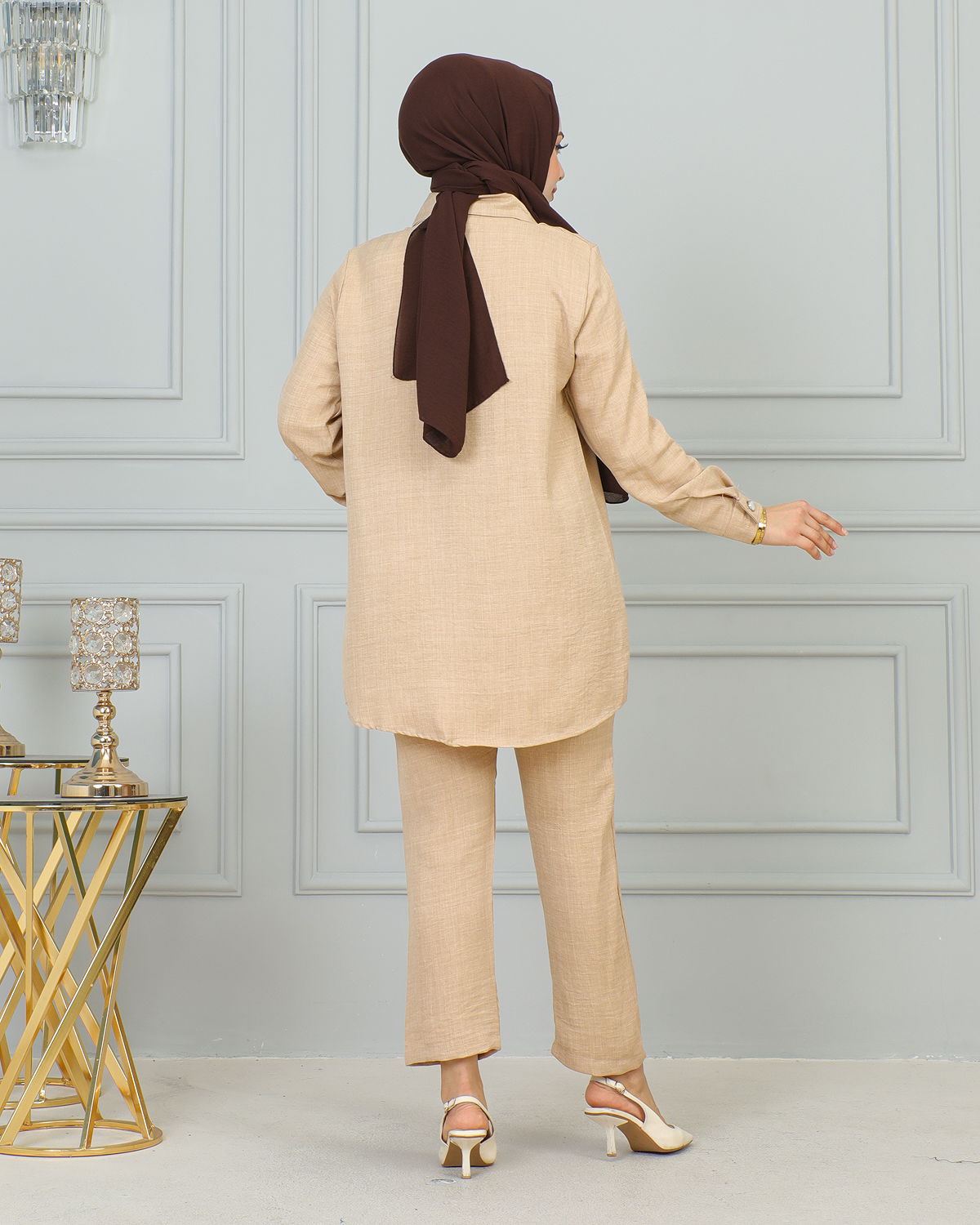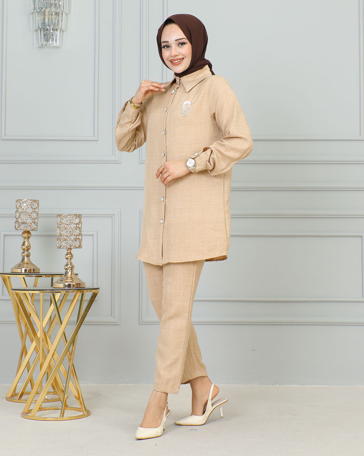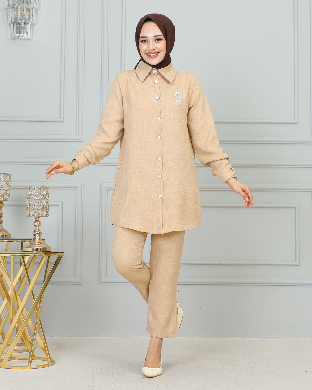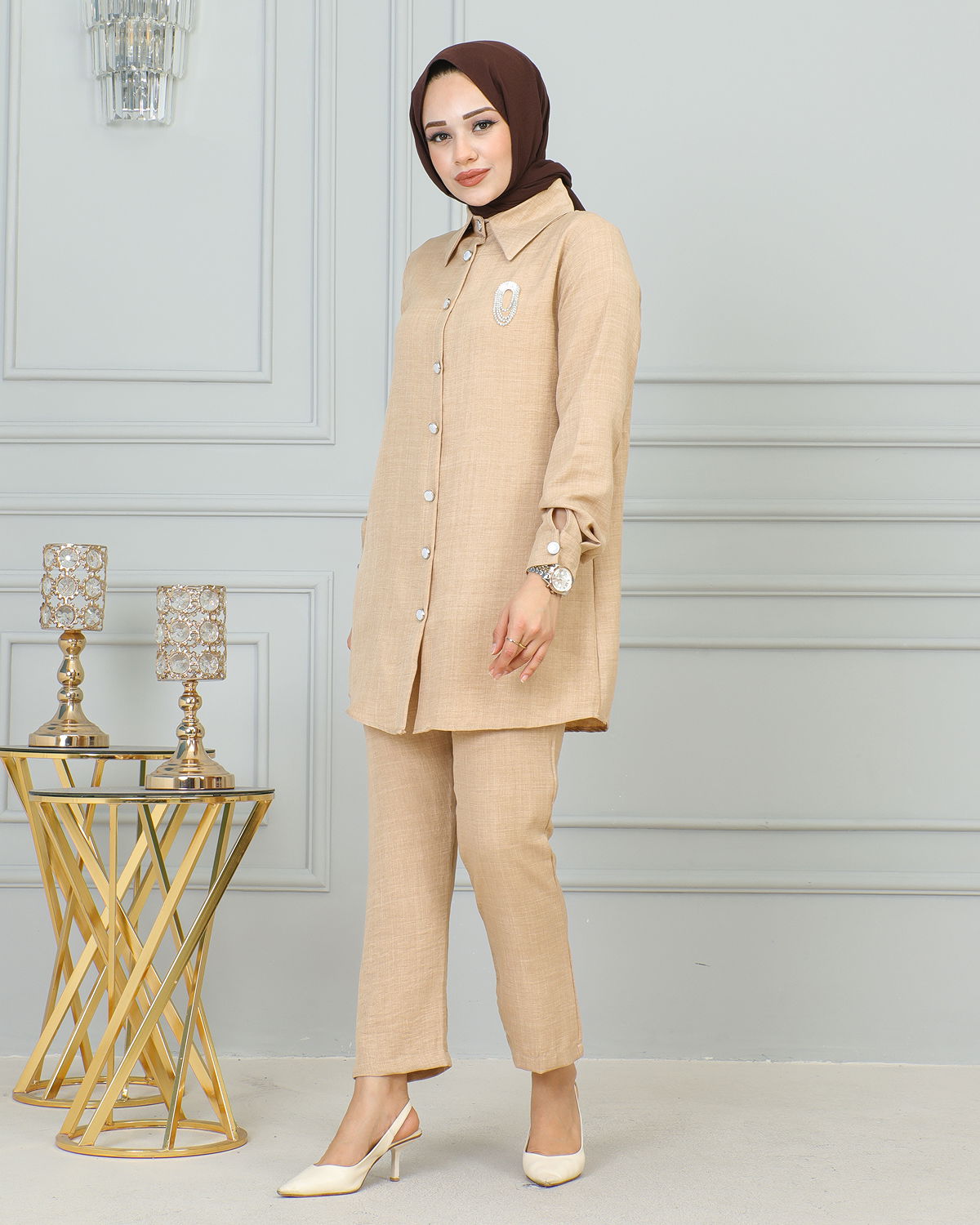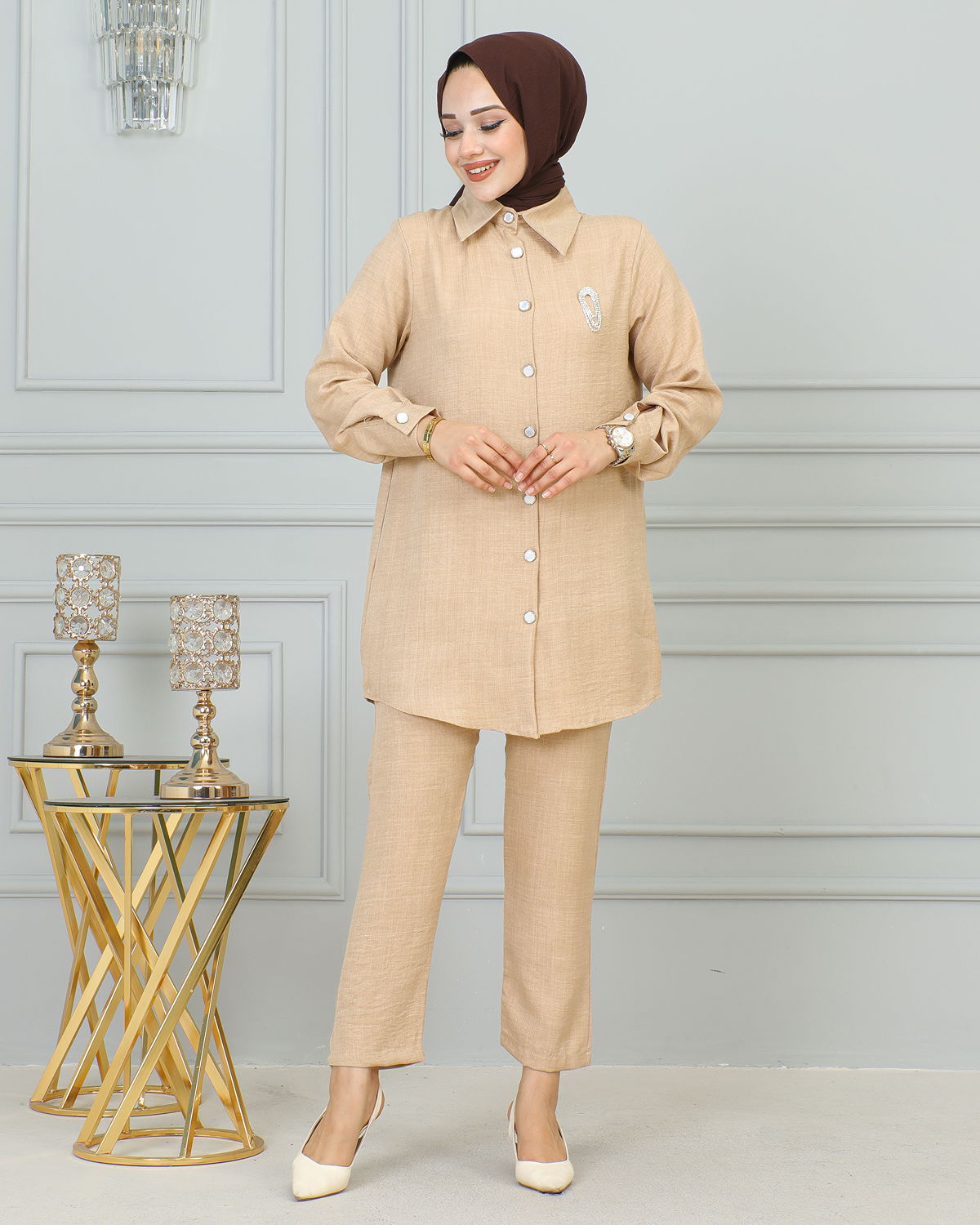 Gömlek Yakalı Broşlu İkili Takım-4010 Vizon