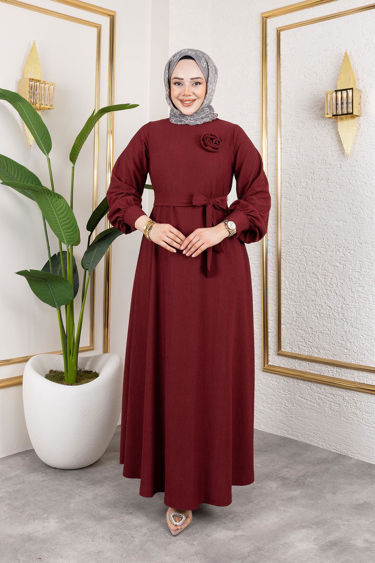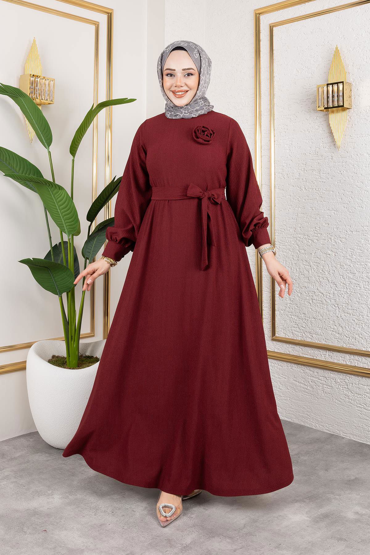 Gül Detaylı Tesettür Elbise-5028 Bordo