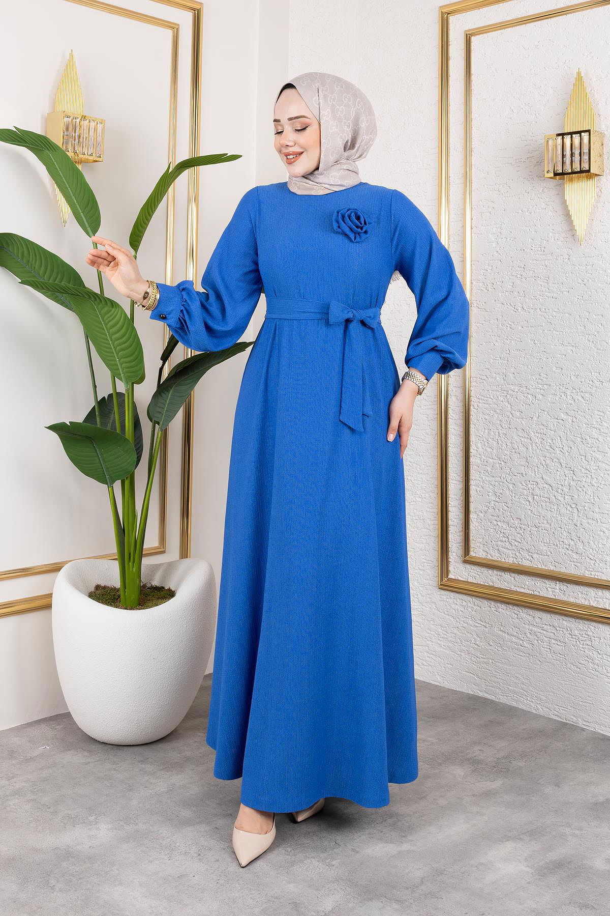 Gül Detaylı Tesettür Elbise-5028 Saks mavisi