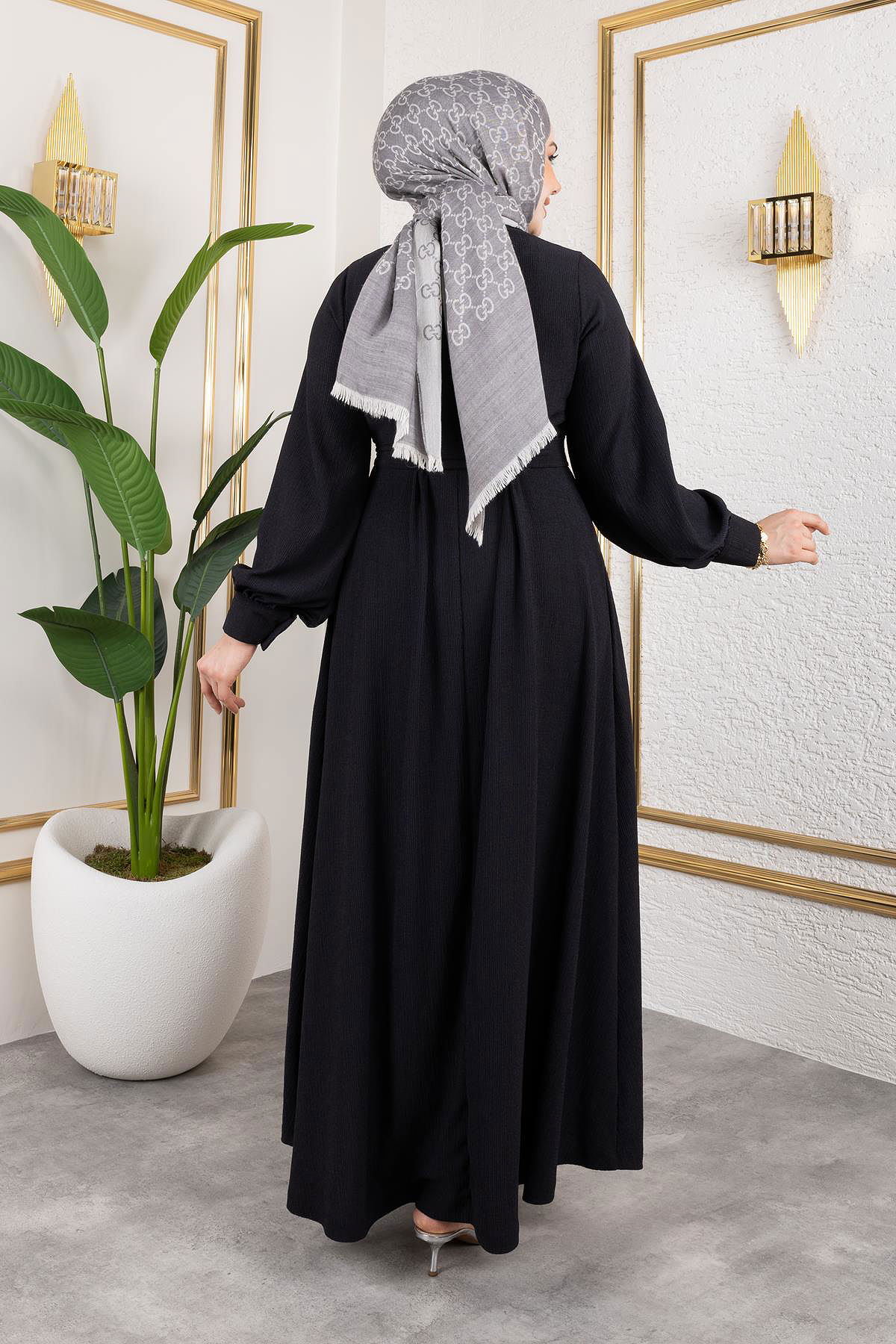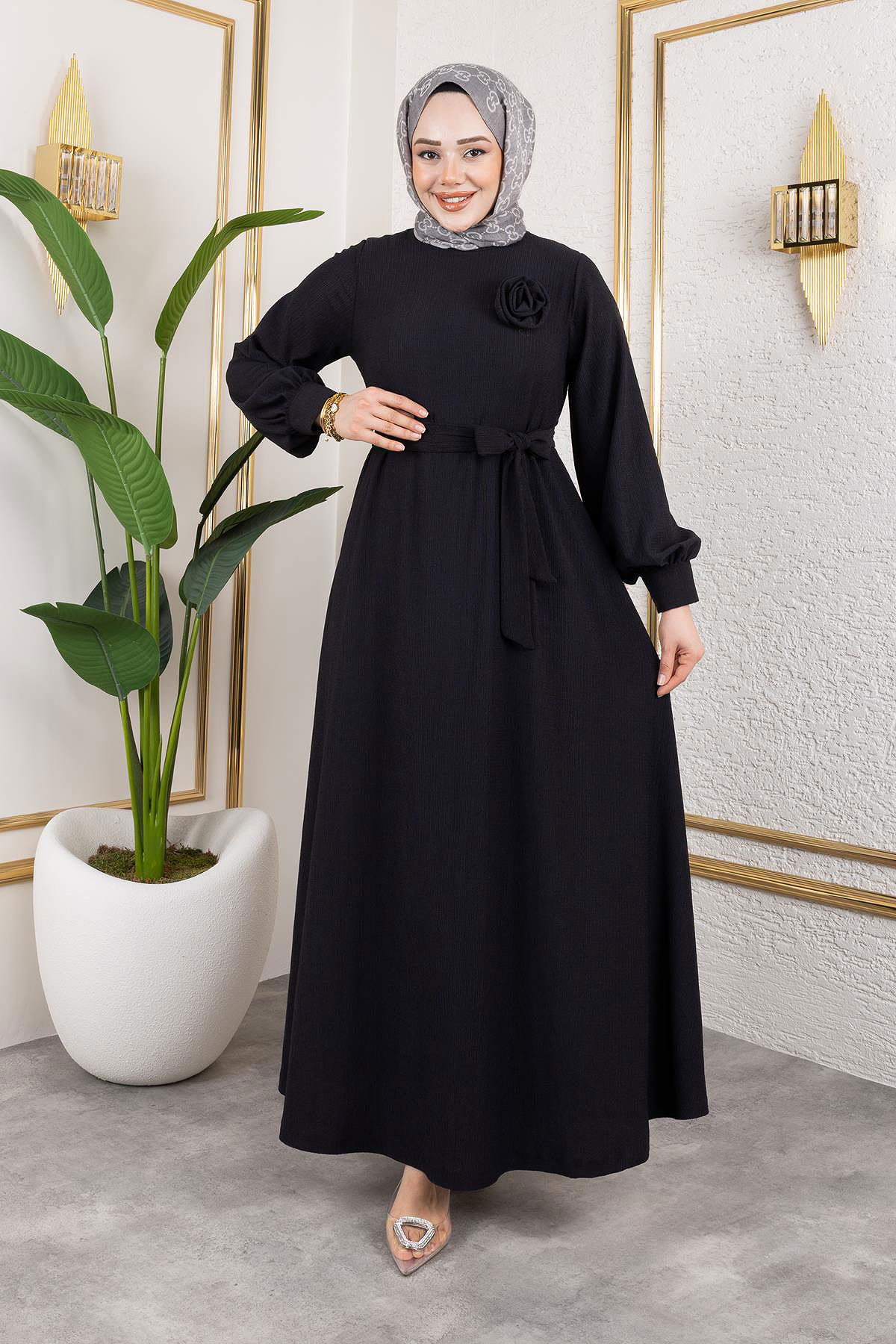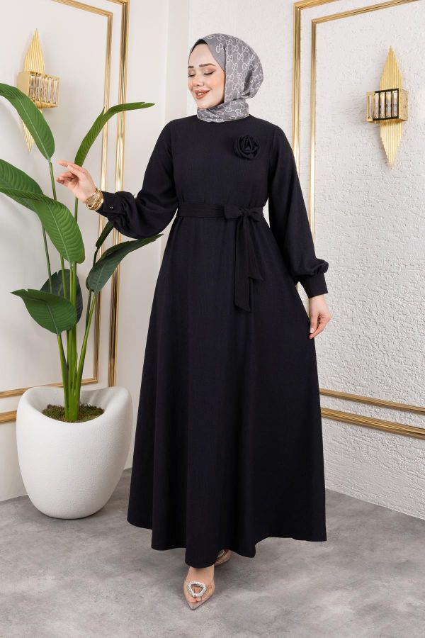 Gül Detaylı Tesettür Elbise-5028 Siyah