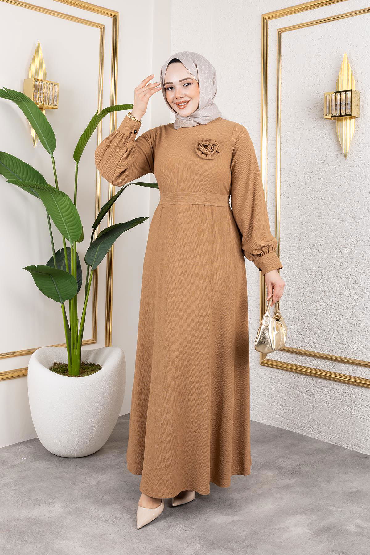 Gül Detaylı Tesettür Elbise-5028 Vizon