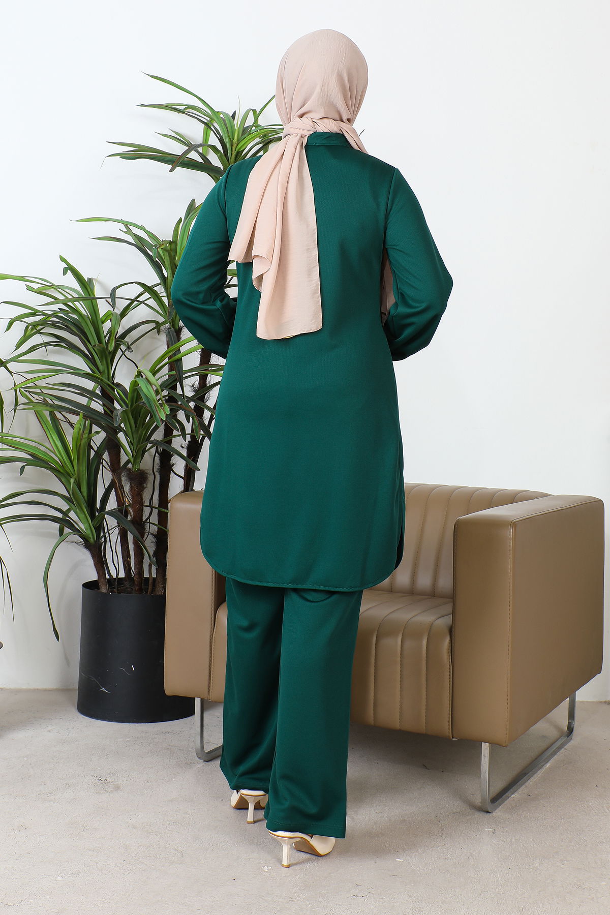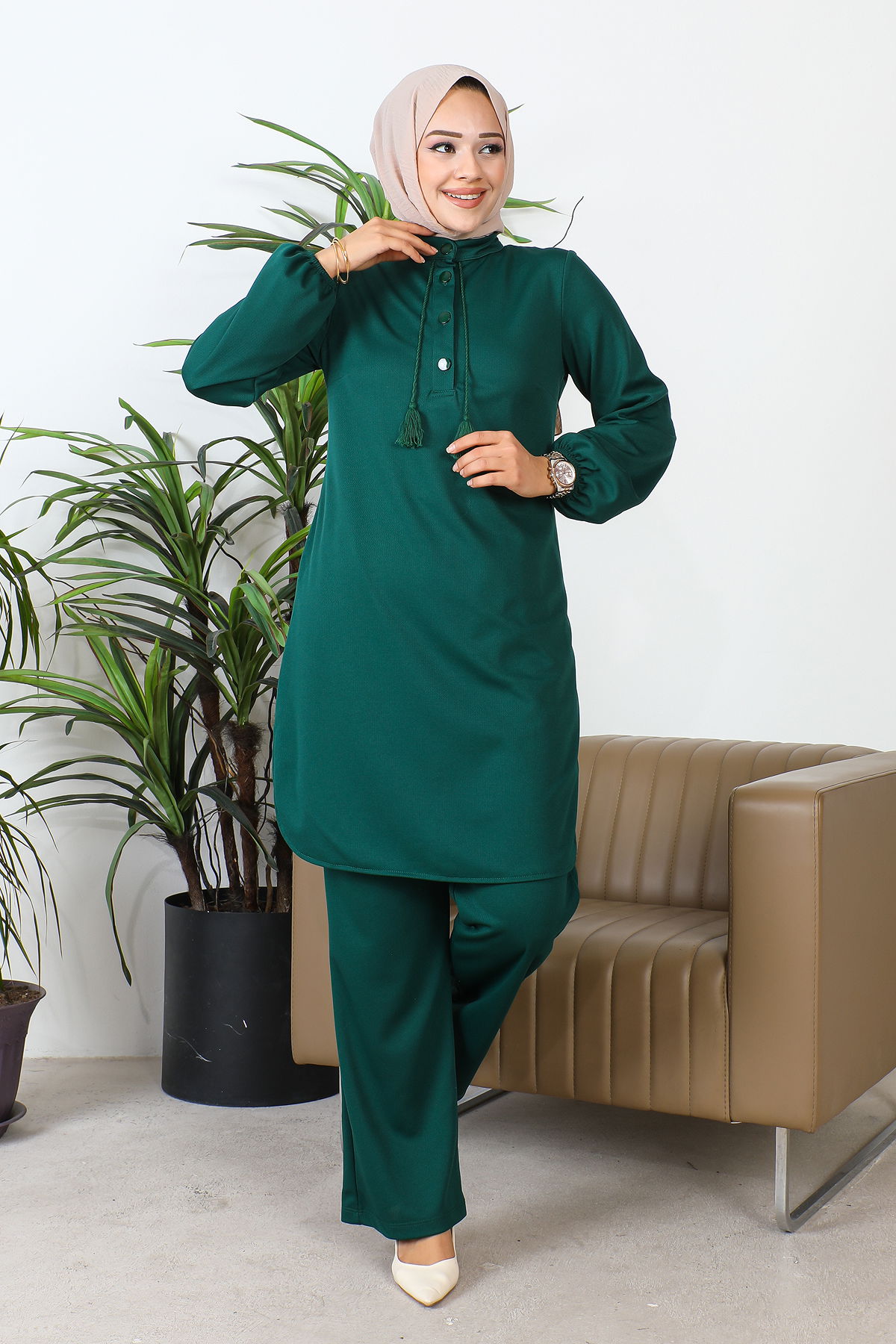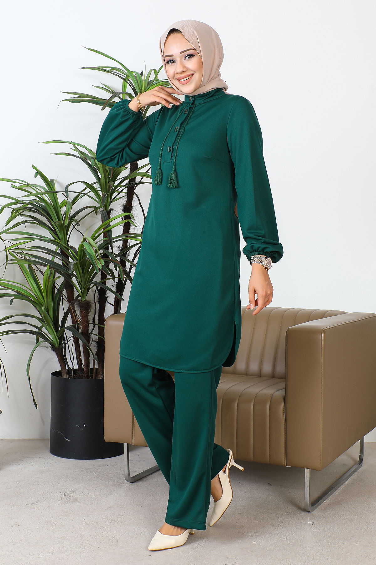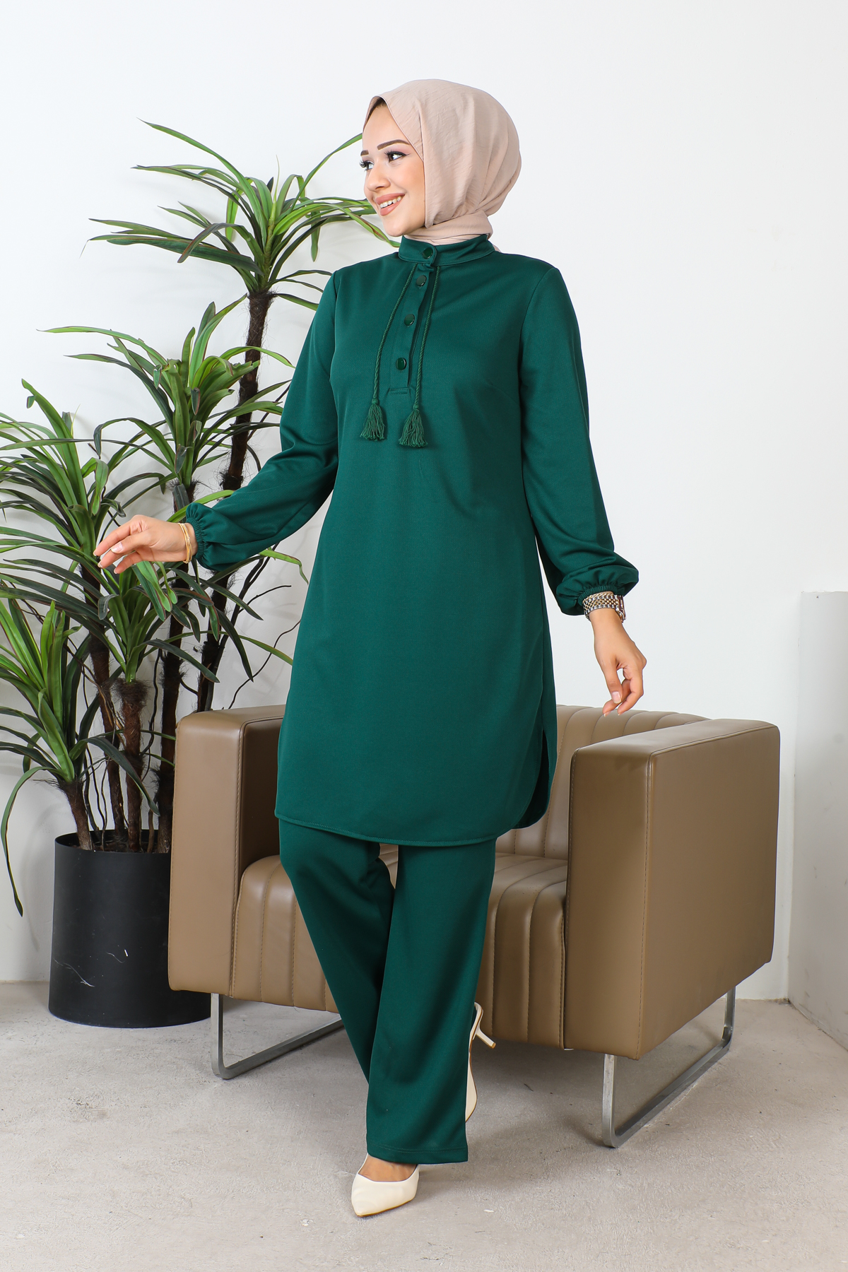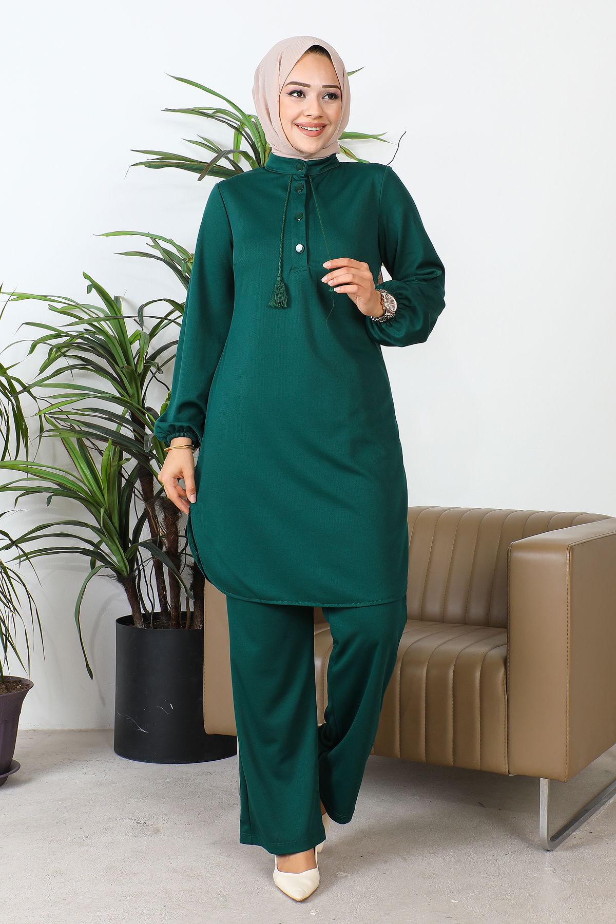 Hakim Yaka Düğmeli Tesettür Takım-3156 Zümrütyeşili