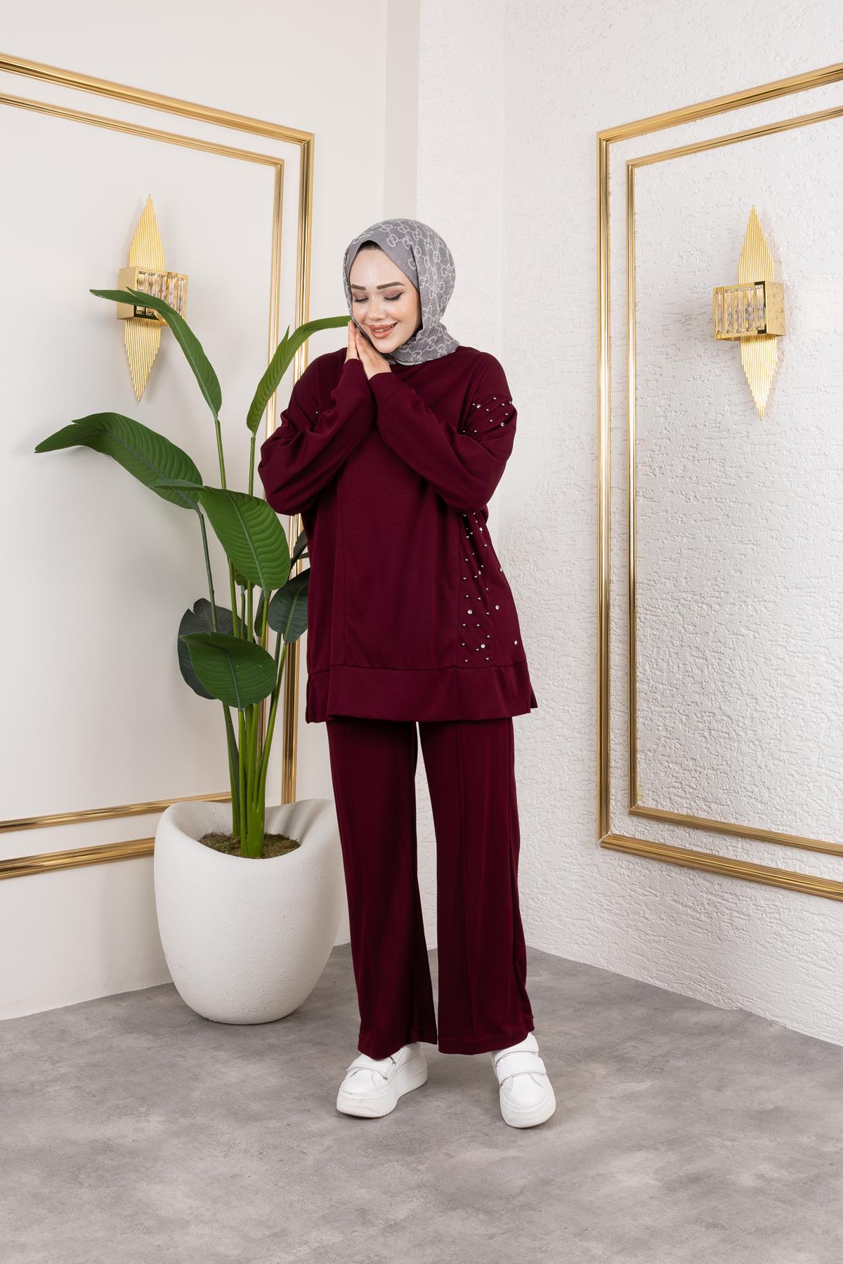 İnci Ve Taş Detaylı Oyşo İkili Takım-5060 Bordo