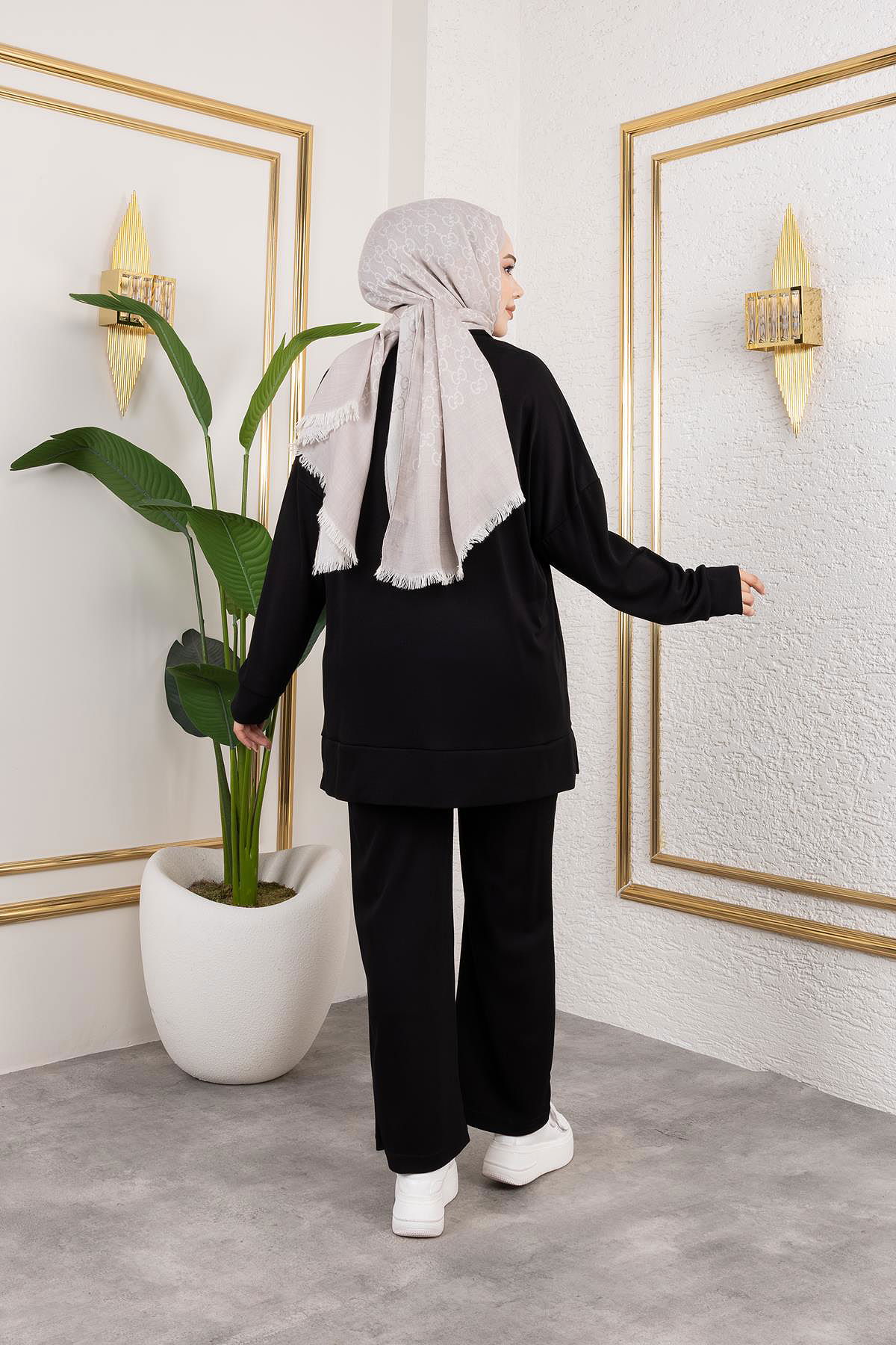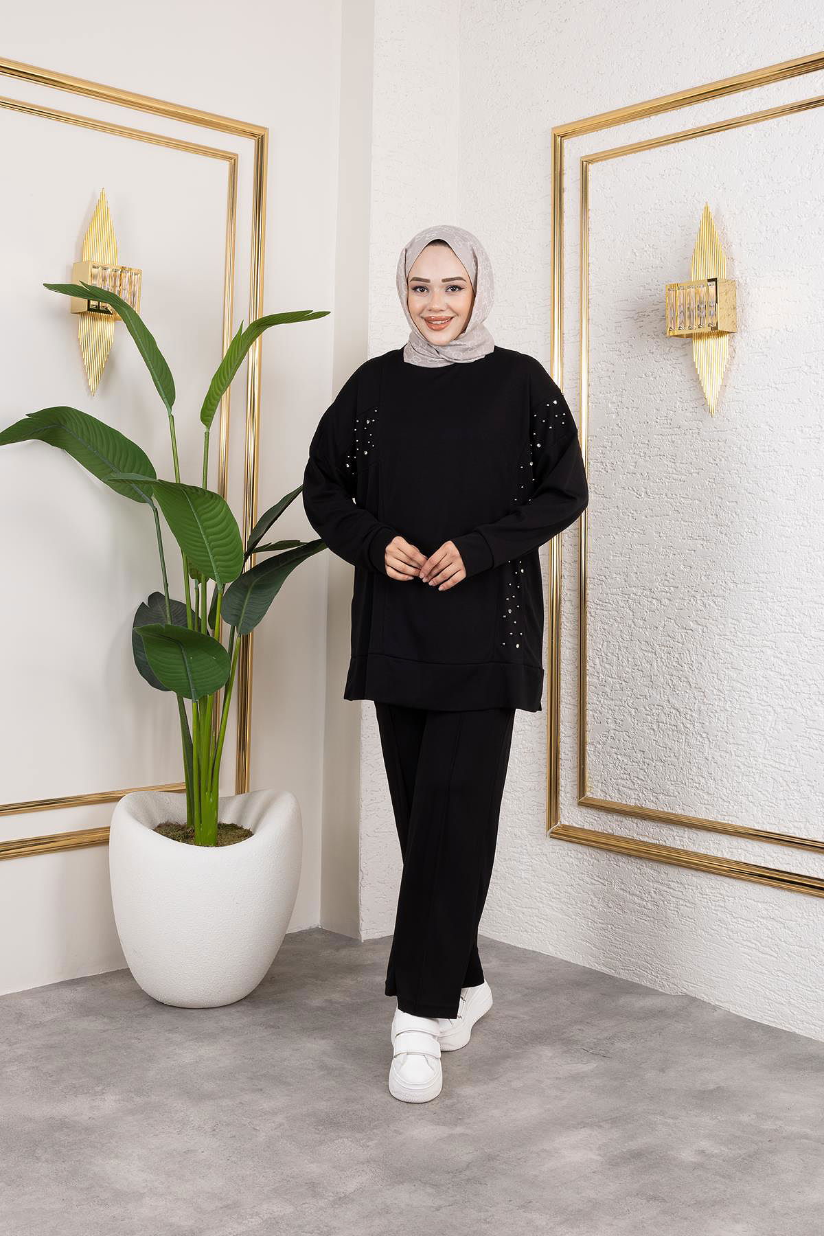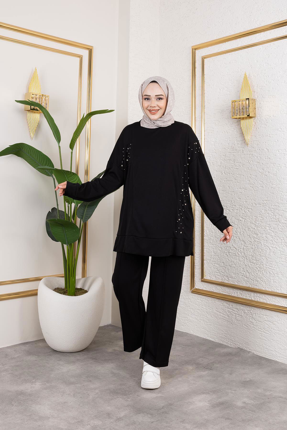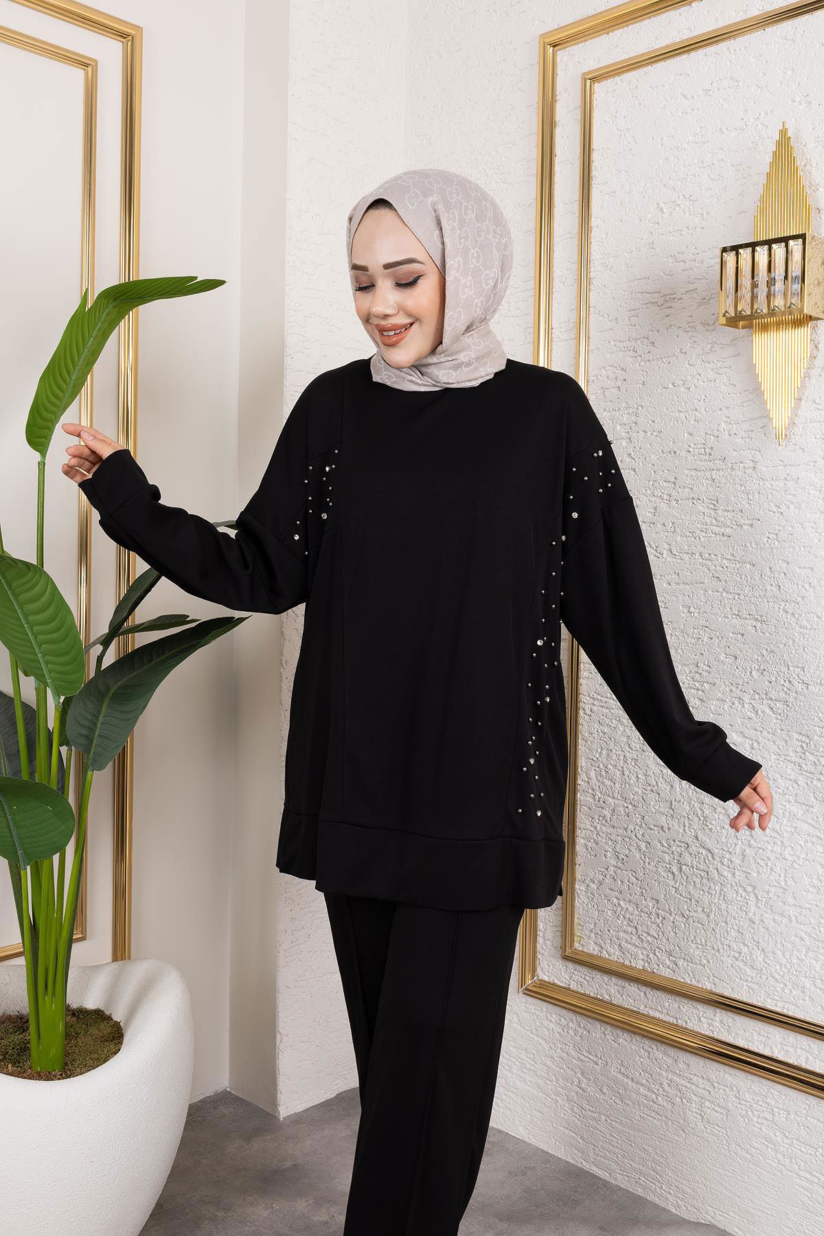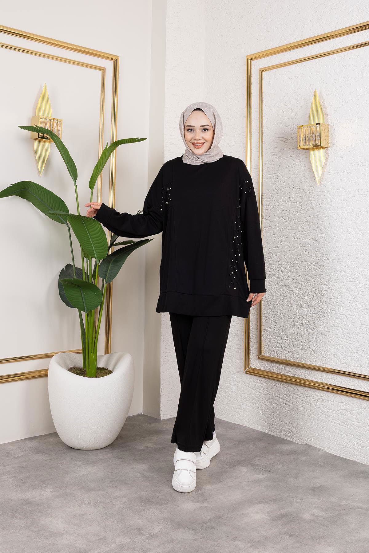 İnci Ve Taş Detaylı Oyşo İkili Takım-5060 Siyah