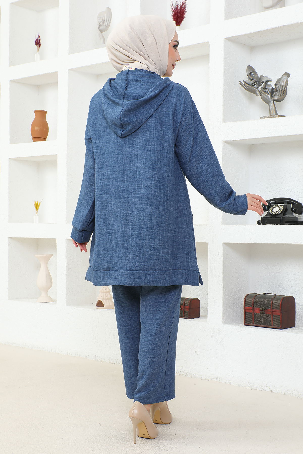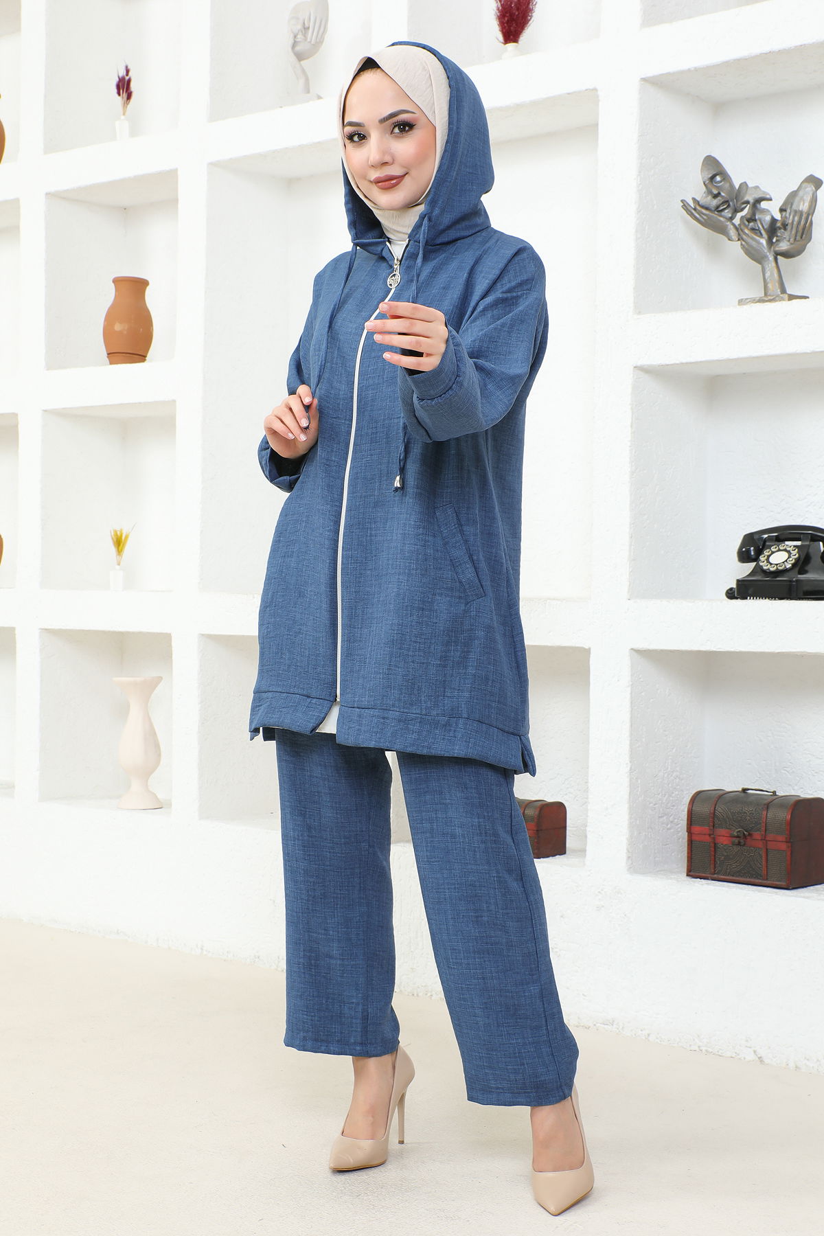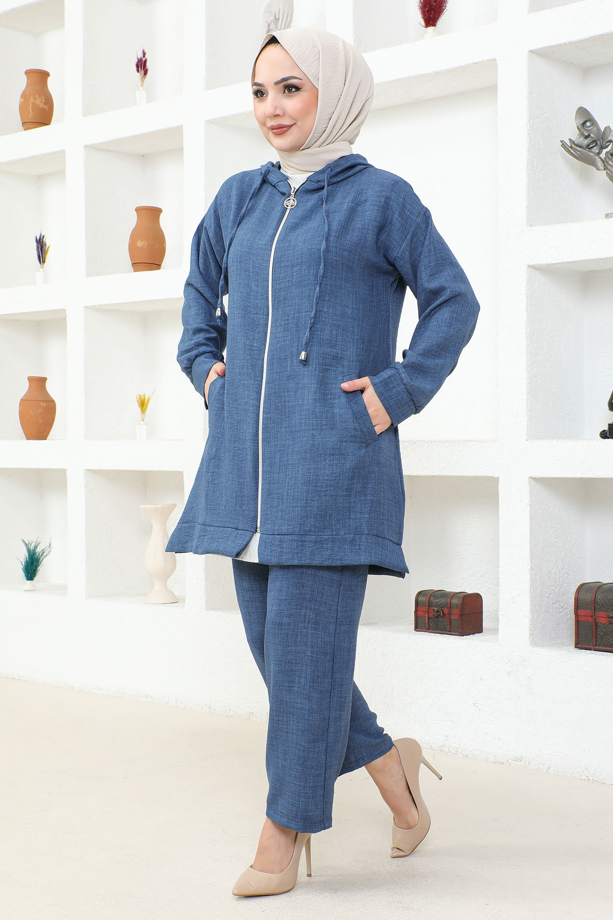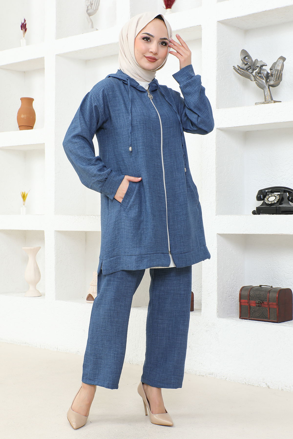 Kapşonlu Fermuarlı İkili Tesettür Takım-3933 İndigo