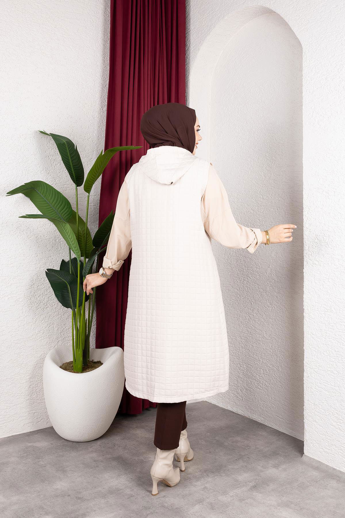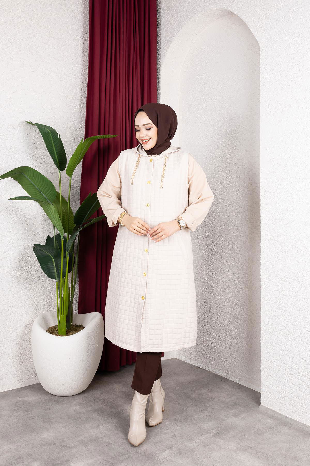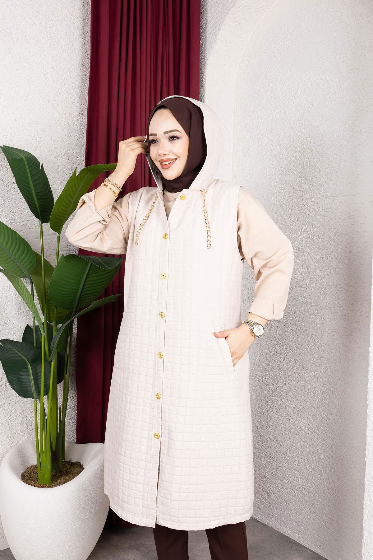 Kapşonlu Kapitone Yelek-5080 Bej