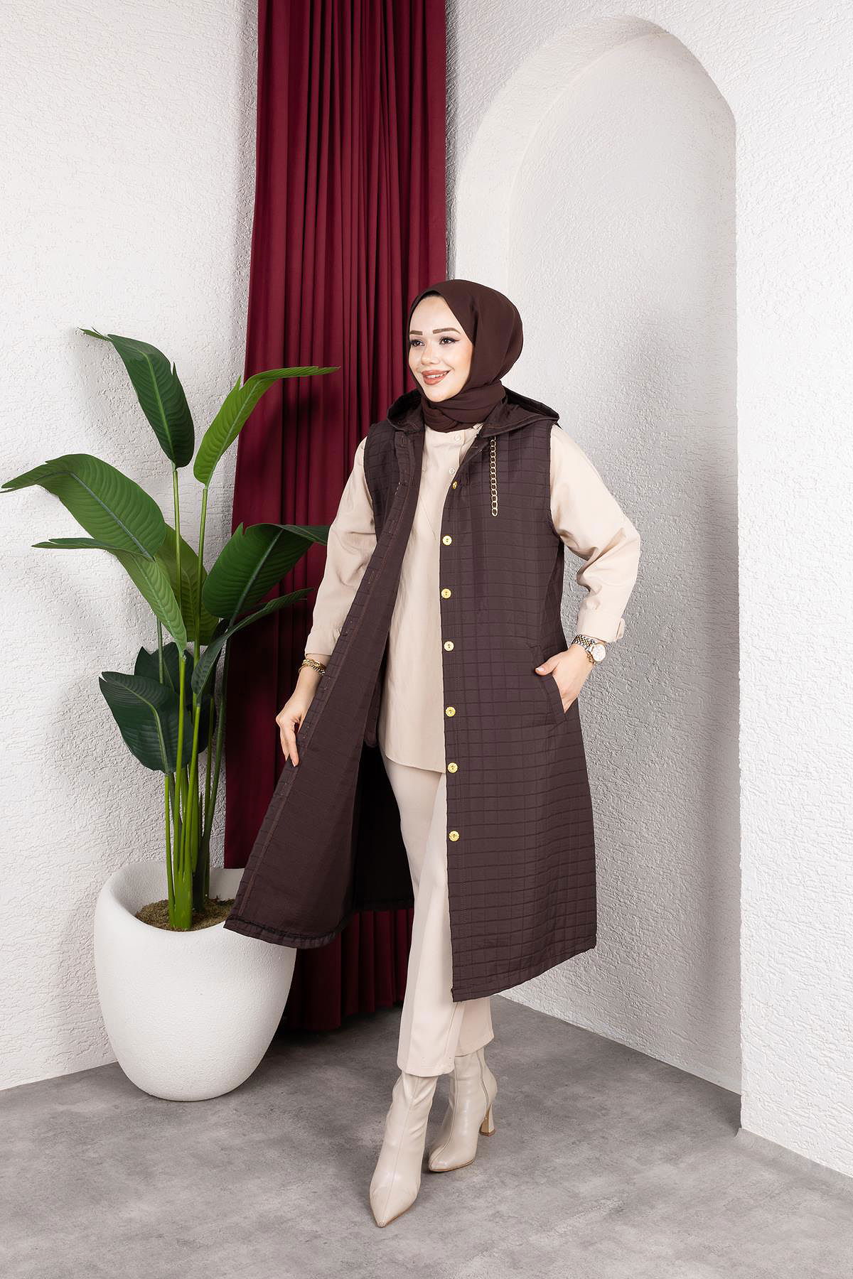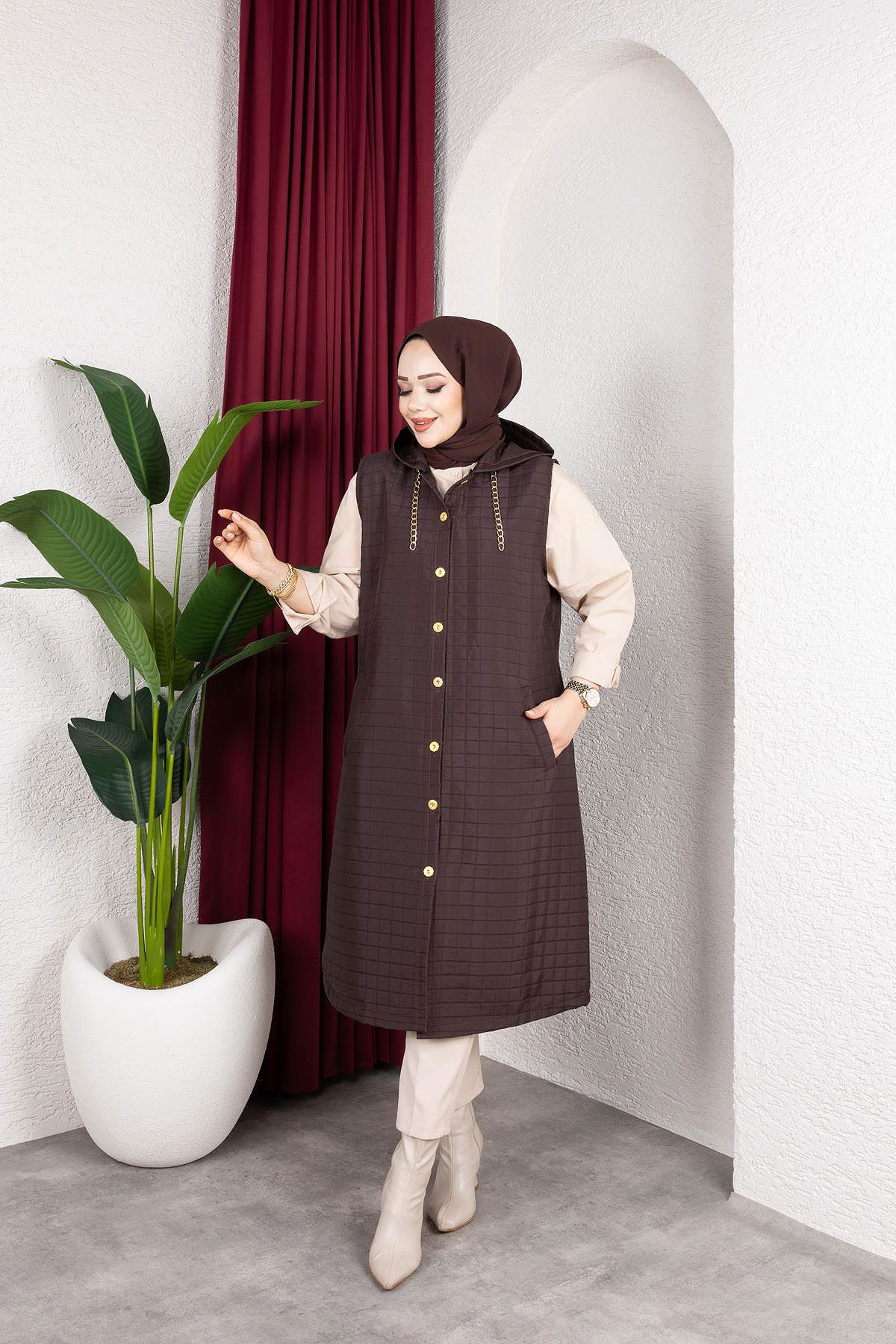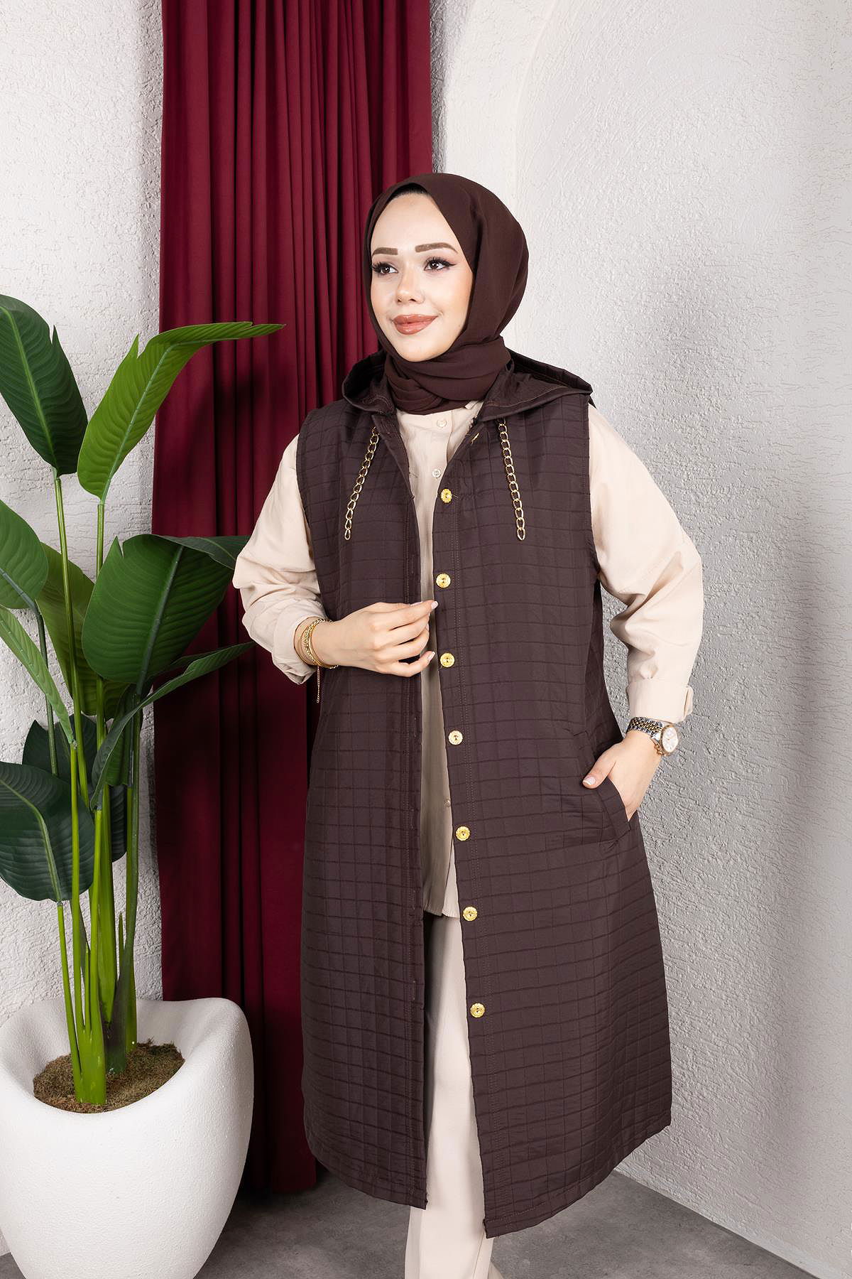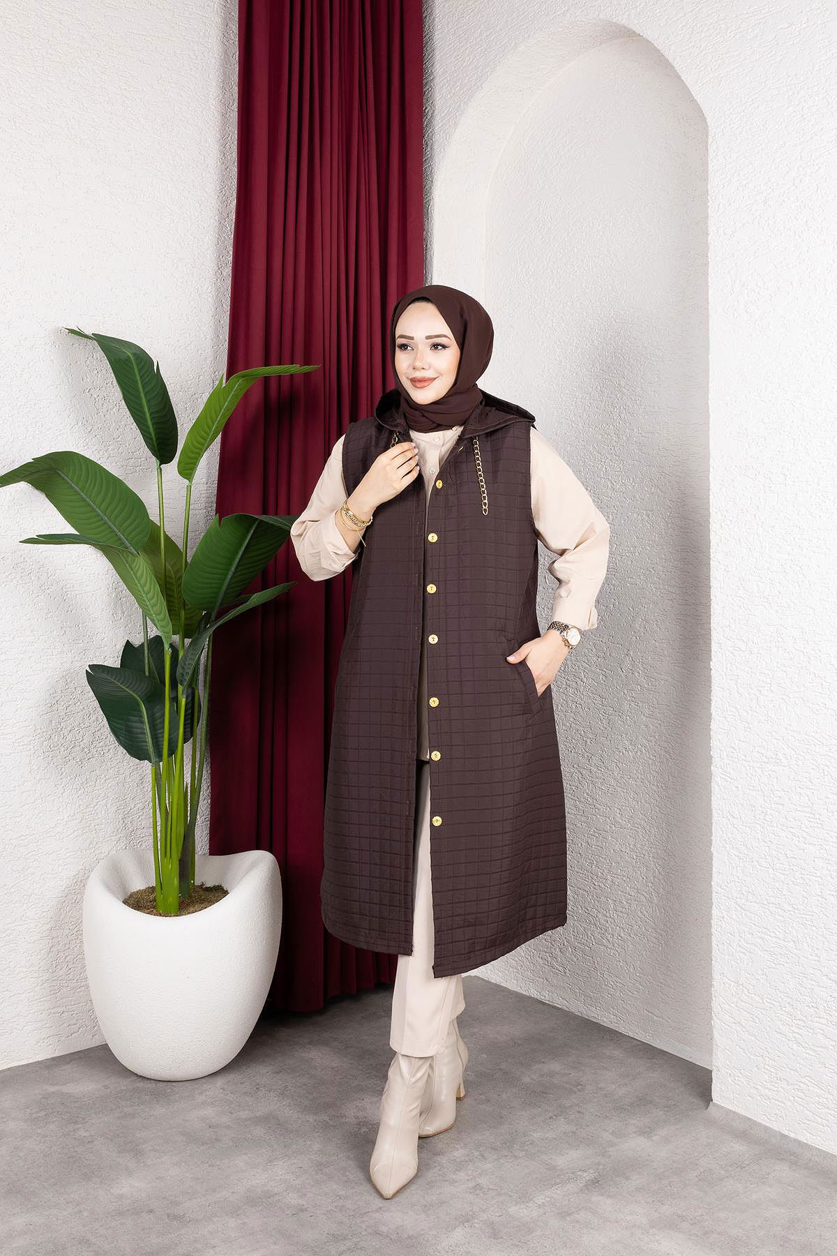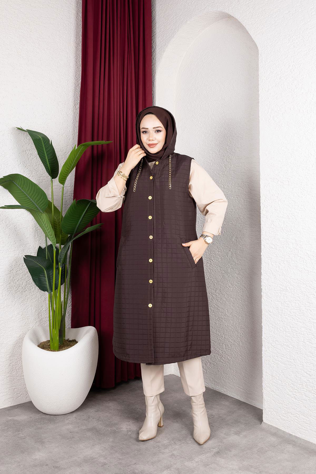 Kapşonlu Kapitone Yelek-5080 Kahverengi