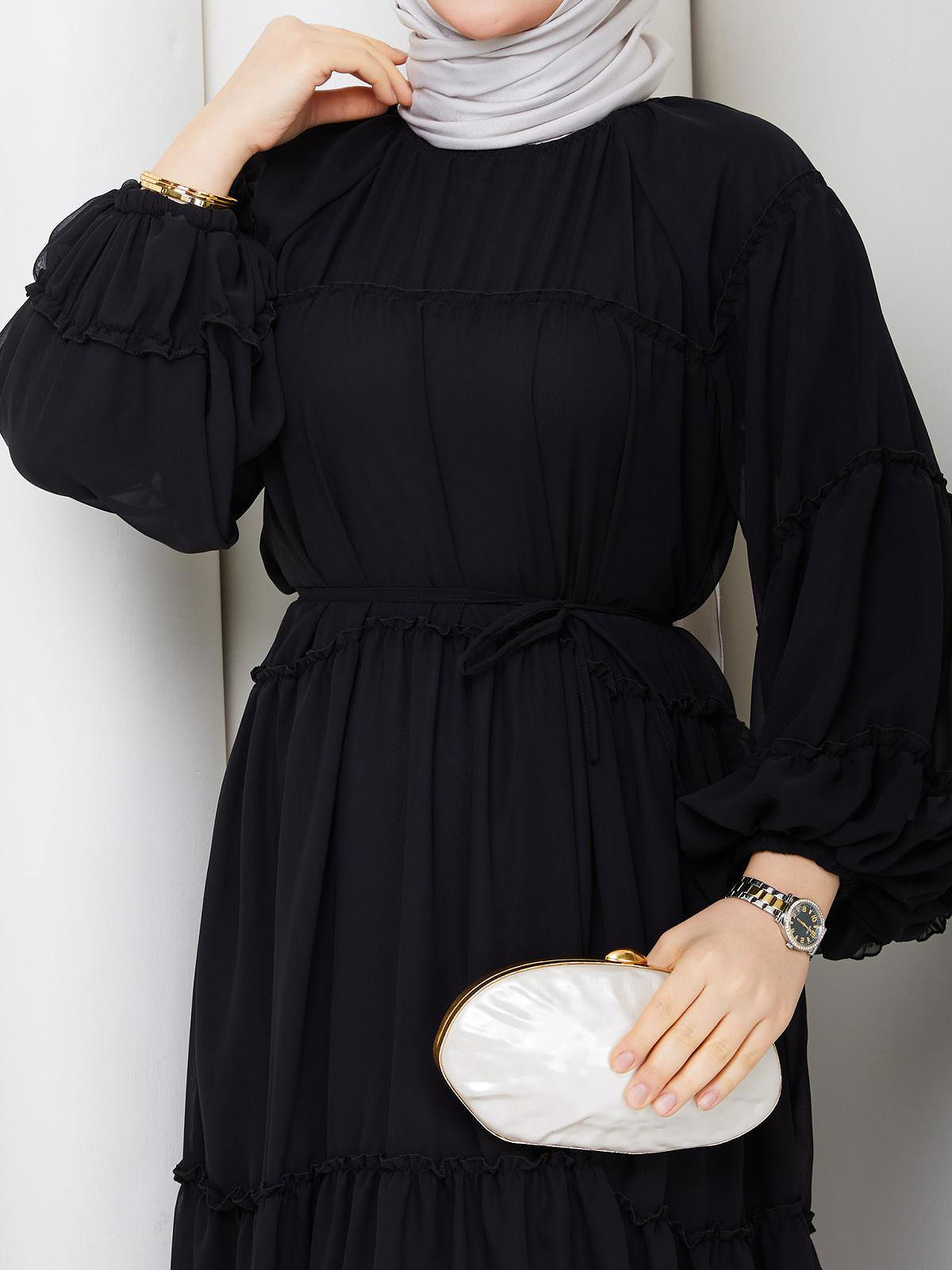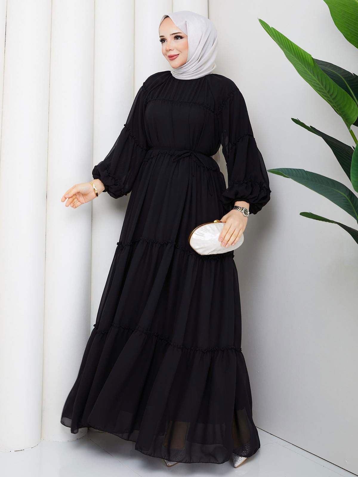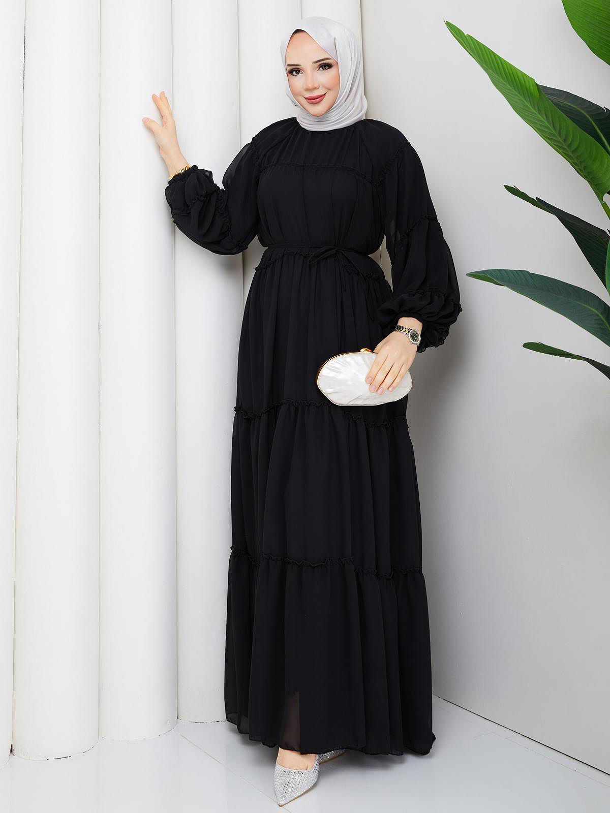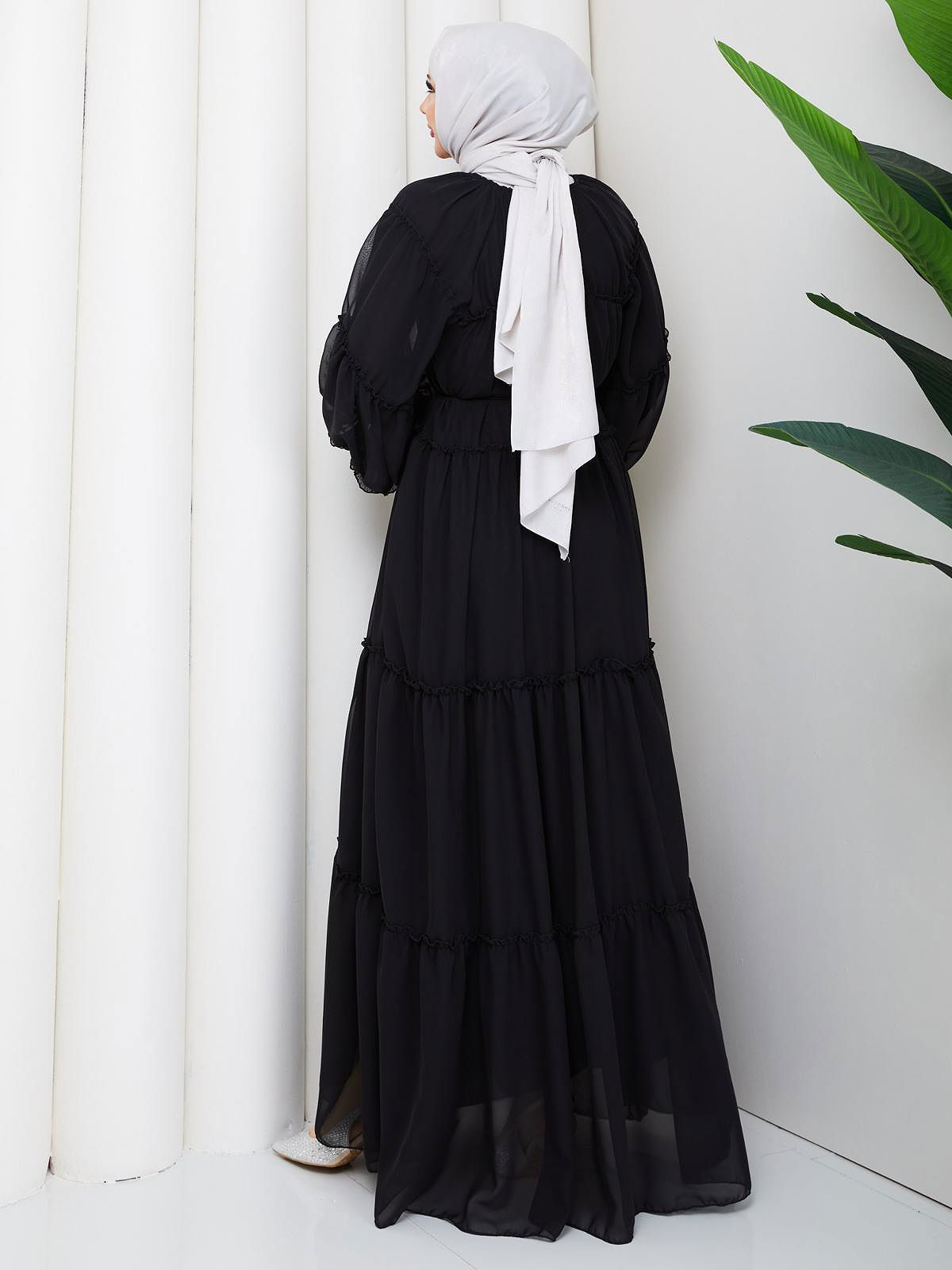 Kat Kat Şifon Tesettür Elbise-5105 Siyah