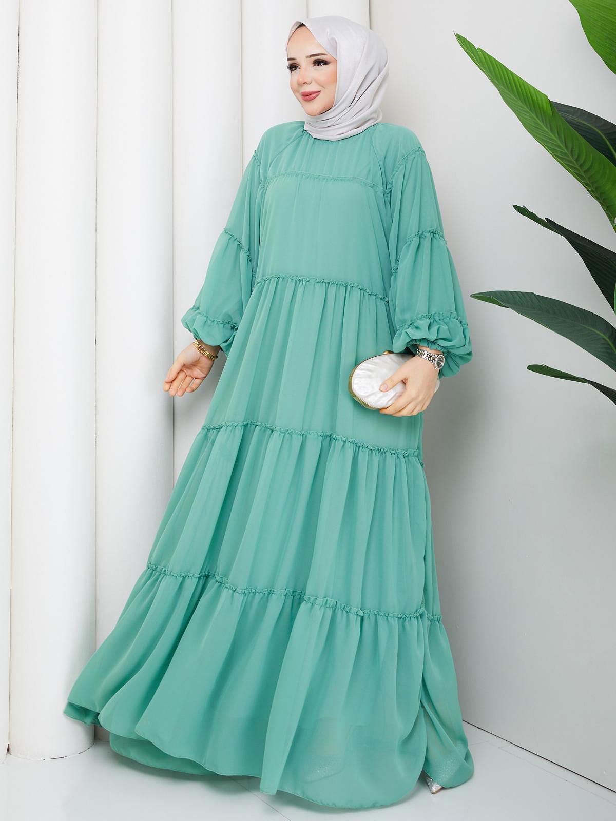 Kat Kat Şifon Tesettür Elbise-5105 Suyeşili