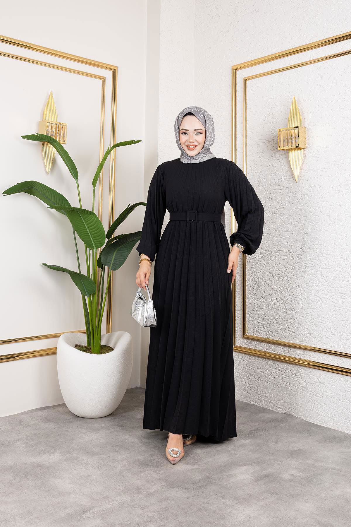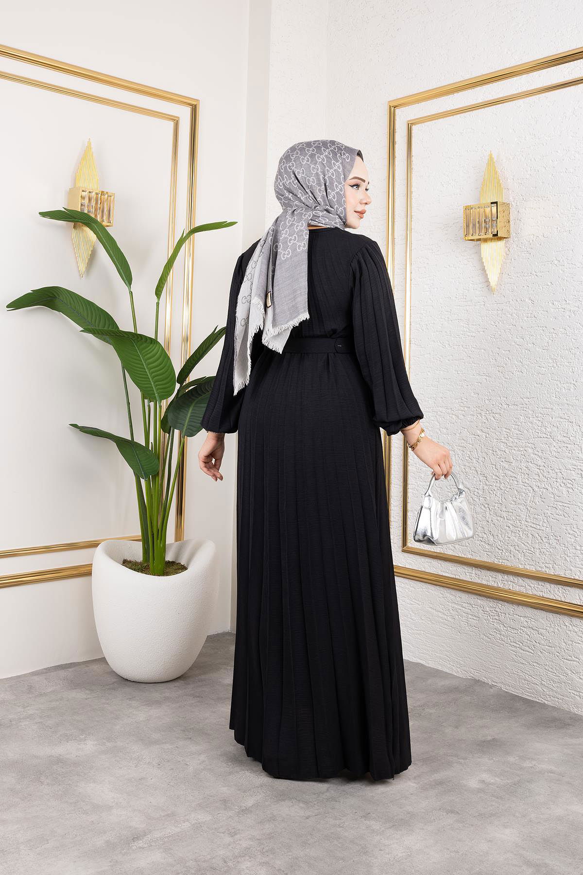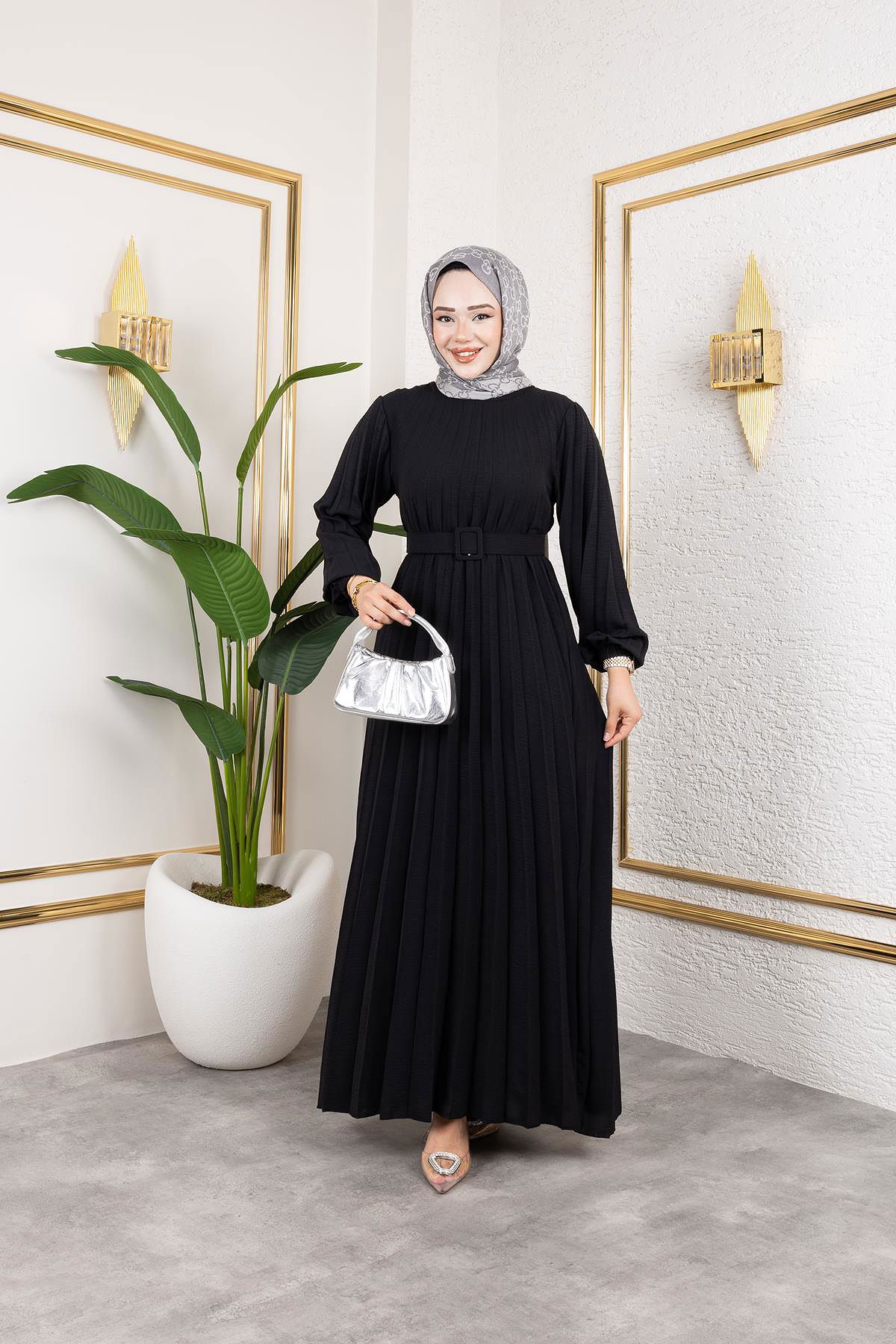 Kemerli Pliseli Tesettür Elbise-3042 Siyah