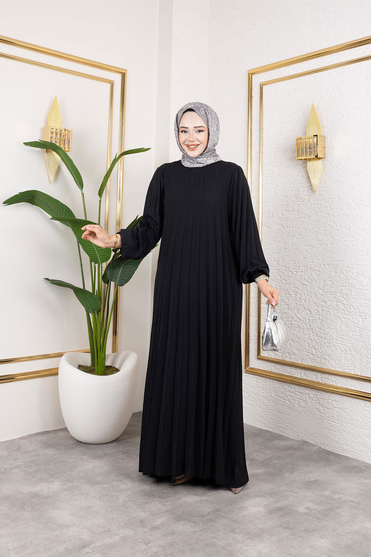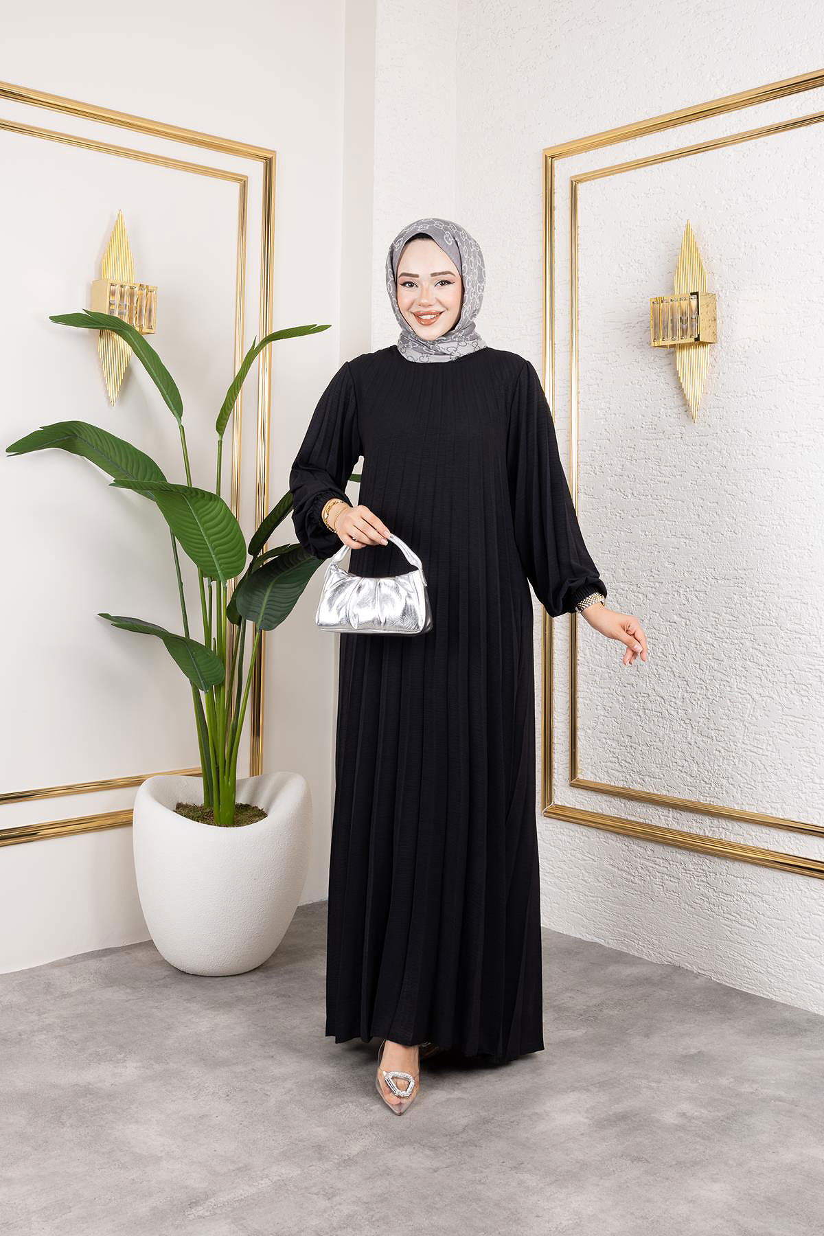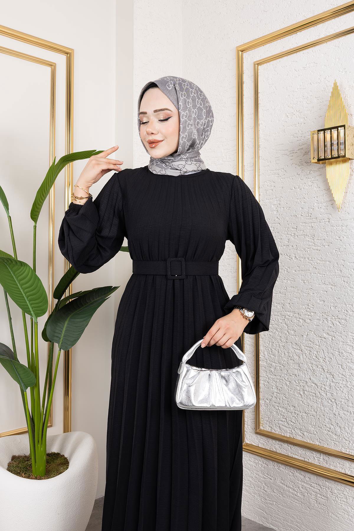 Kemerli Pliseli Tesettür Elbise-3042 Siyah