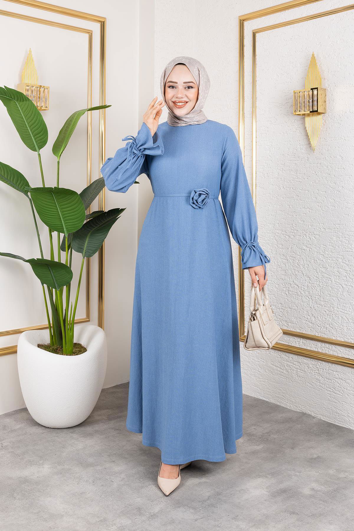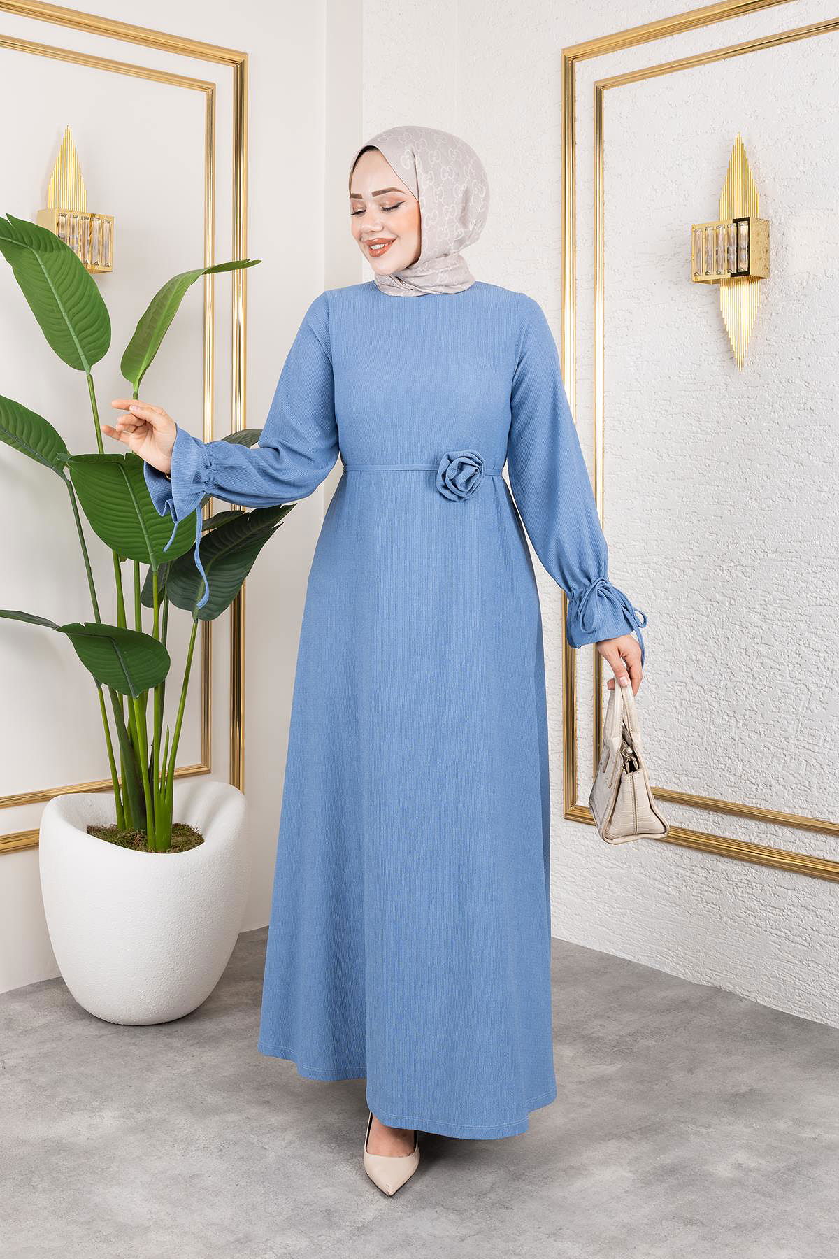 Kol Büzgülü Gül Detaylı Elbise-5030 Bebe mavisi