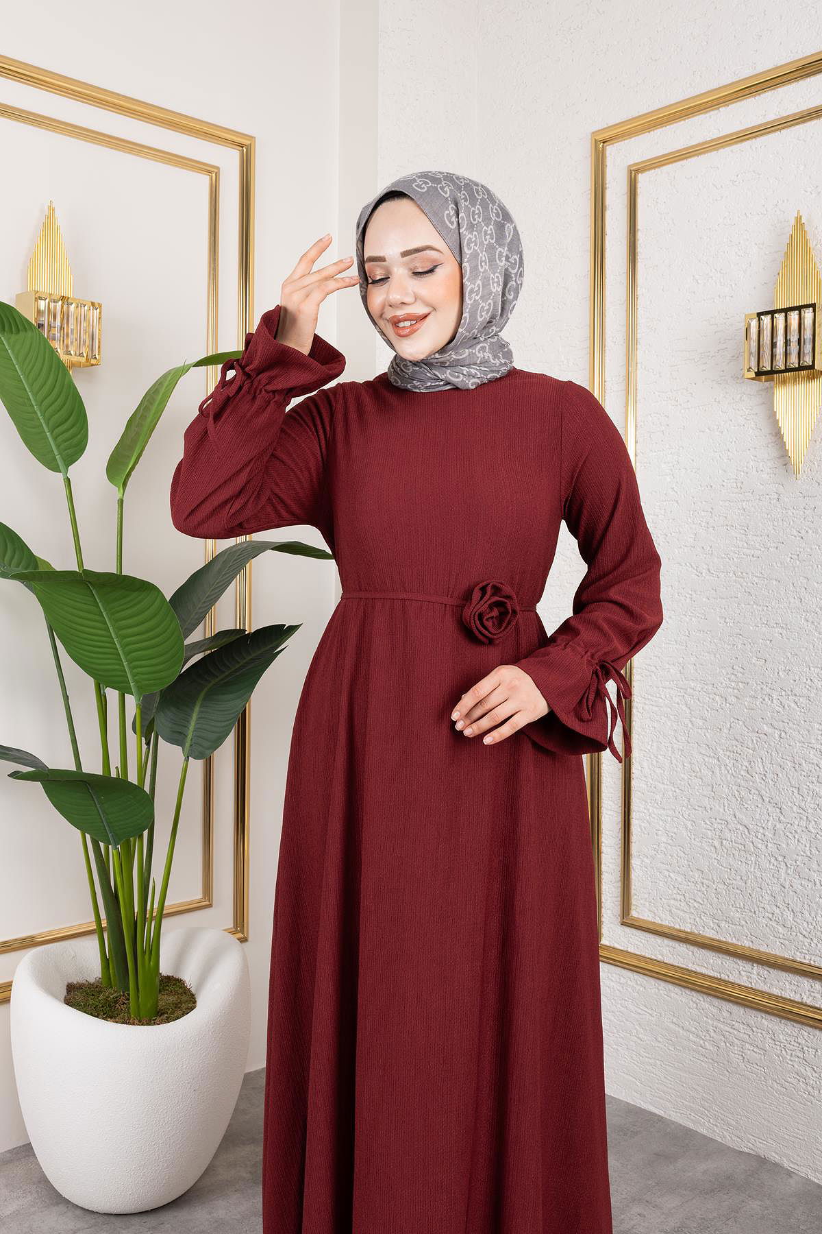 Kol Büzgülü Gül Detaylı Elbise-5030 Bordo