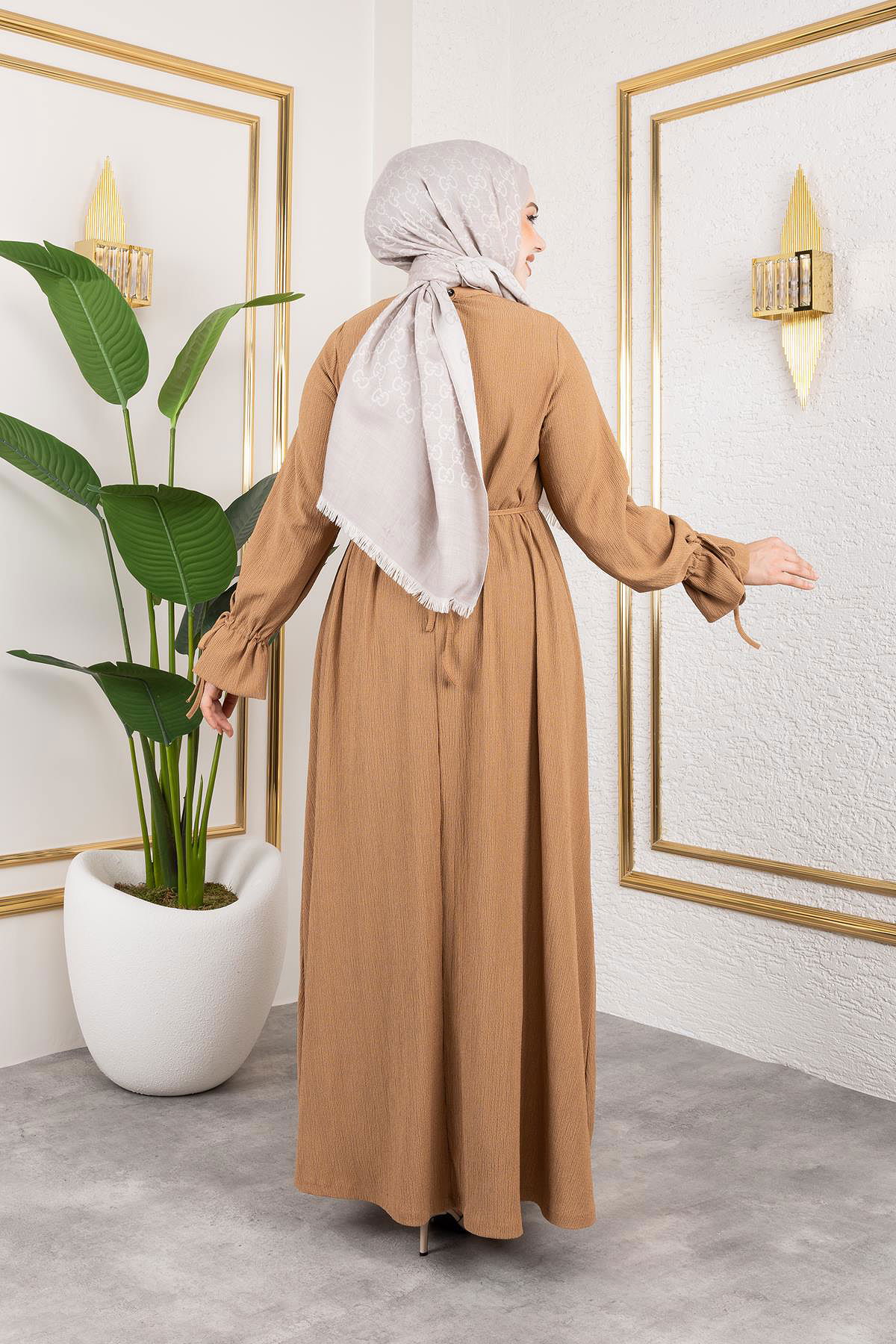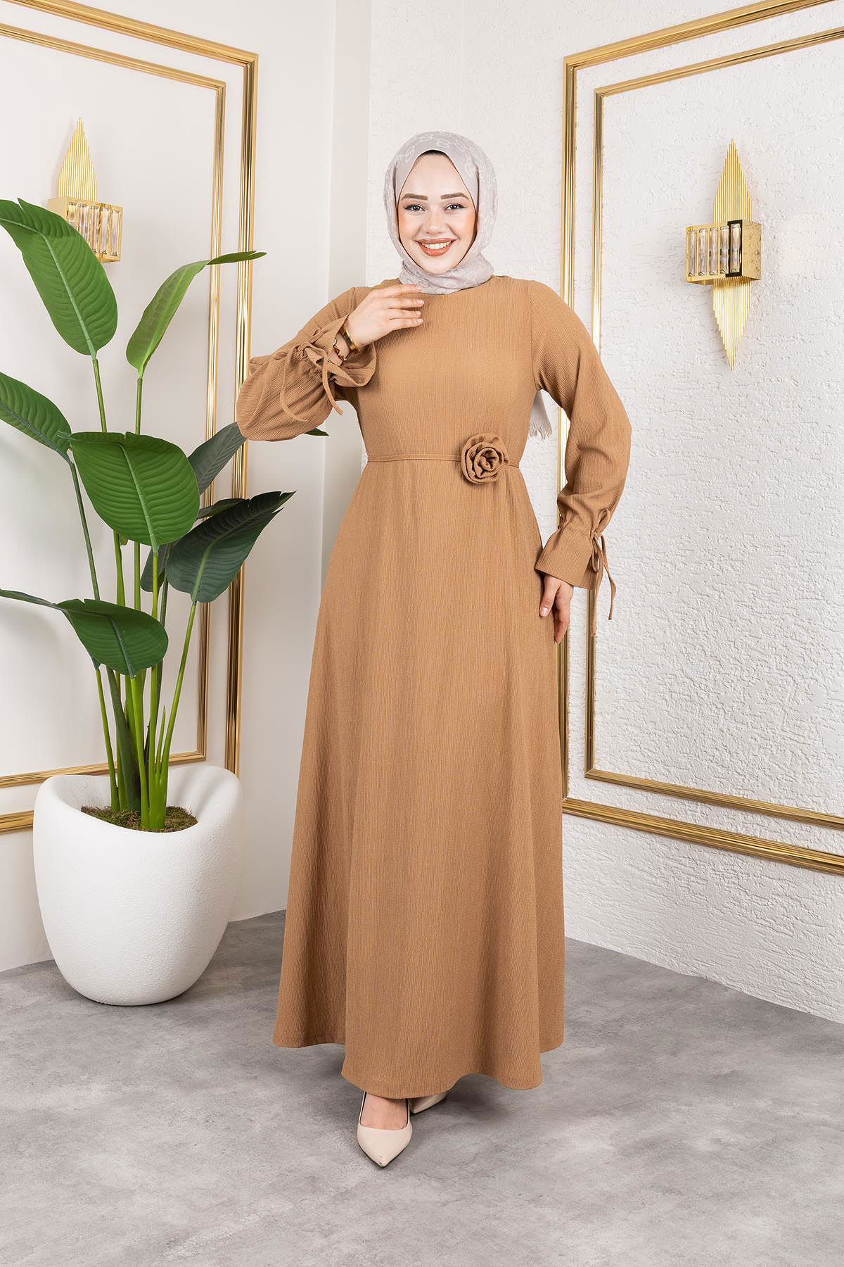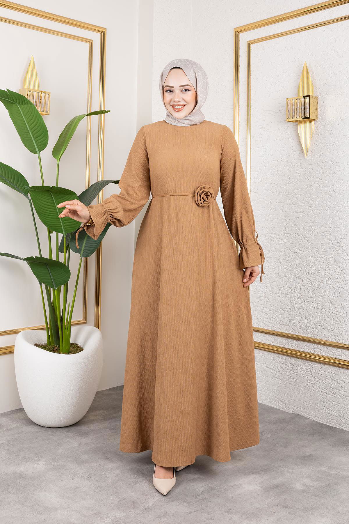 Kol Büzgülü Gül Detaylı Elbise-5030 Latte