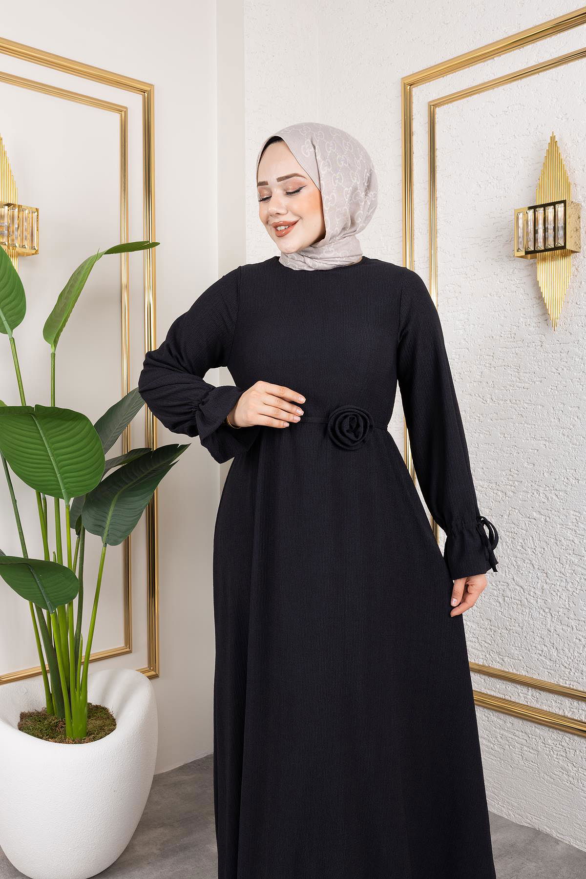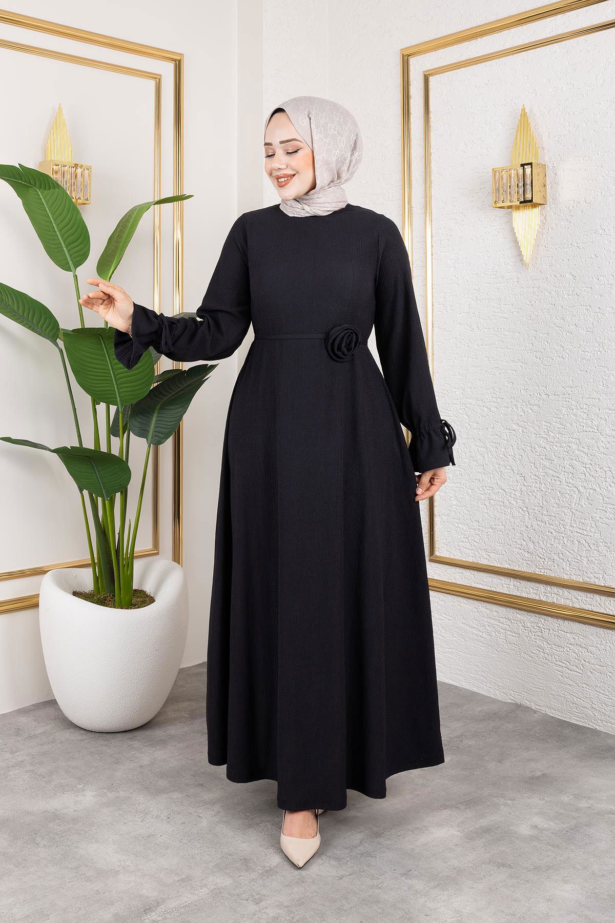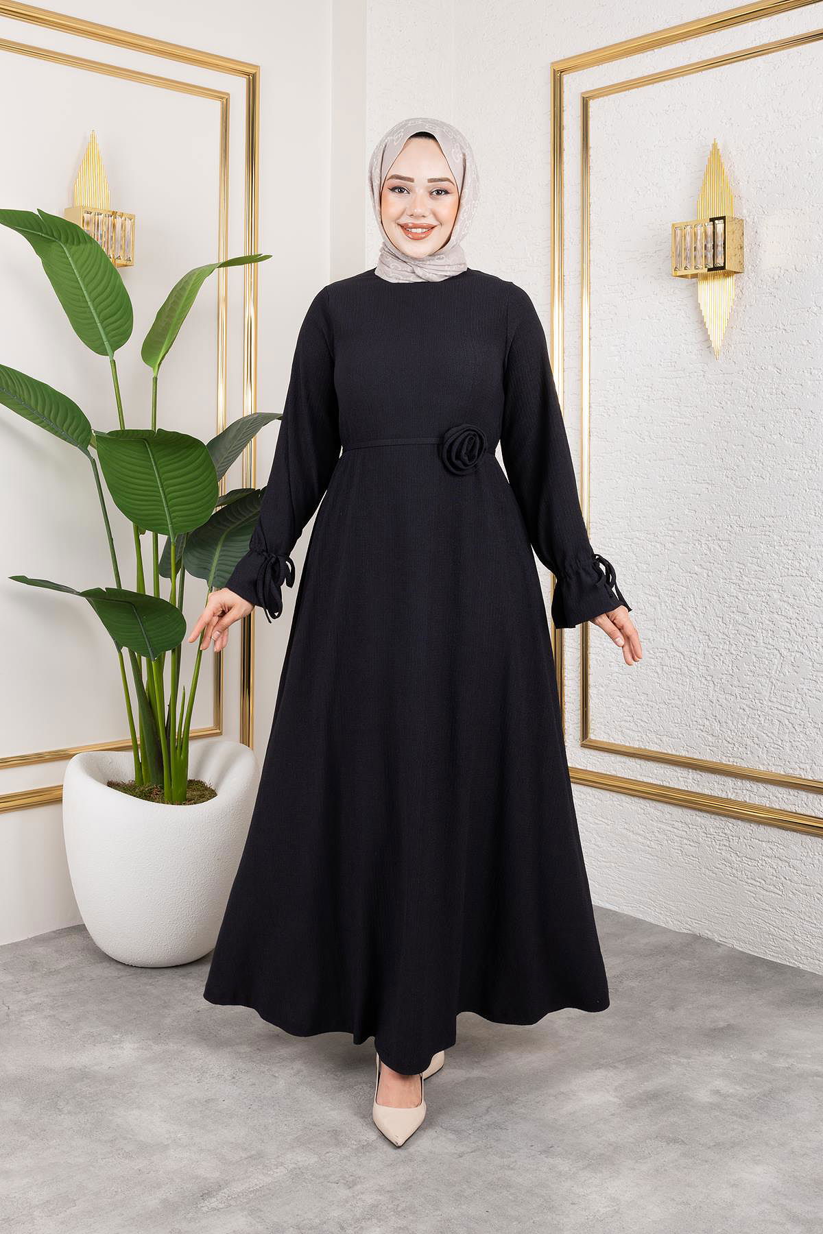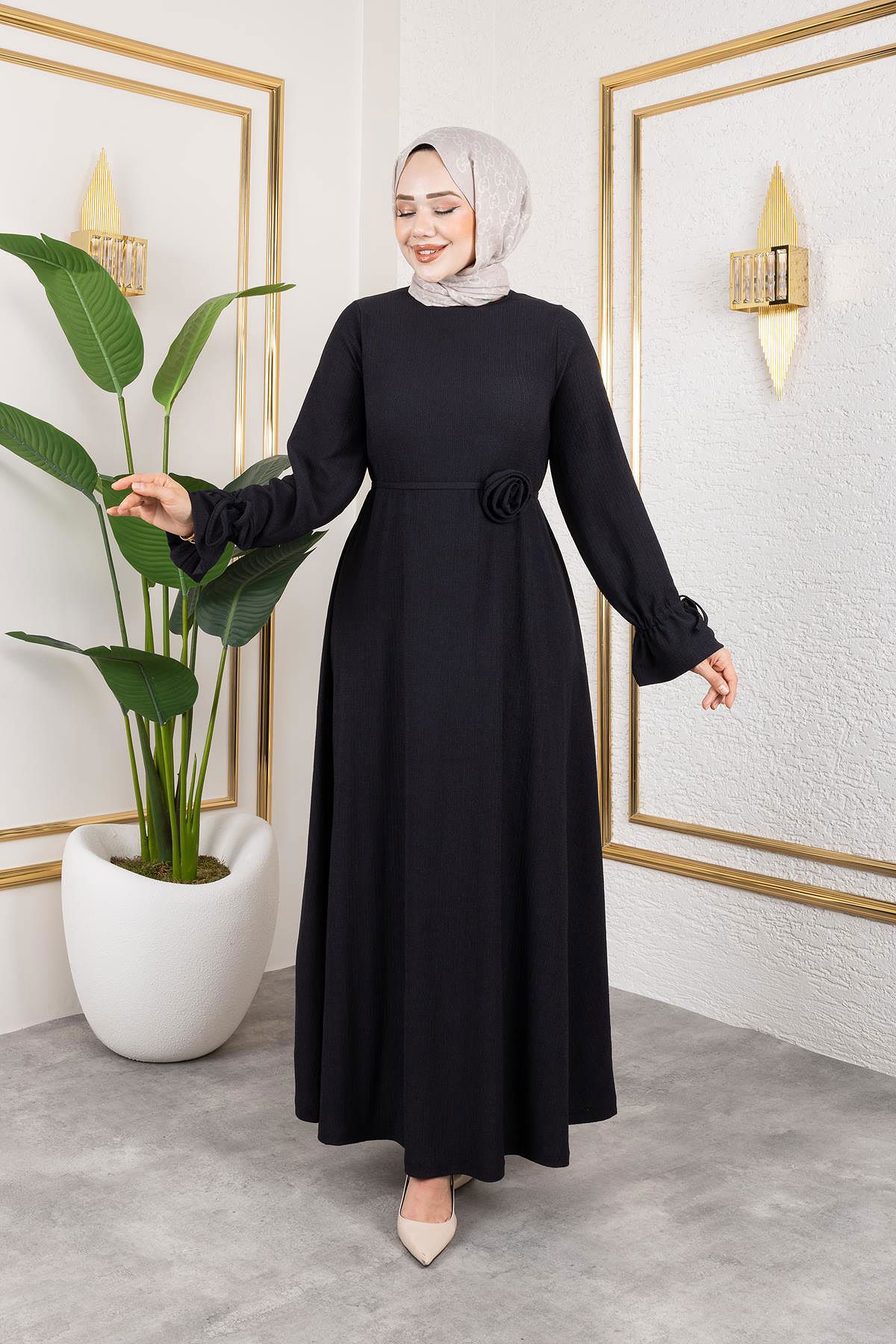 Kol Büzgülü Gül Detaylı Elbise-5030 Siyah