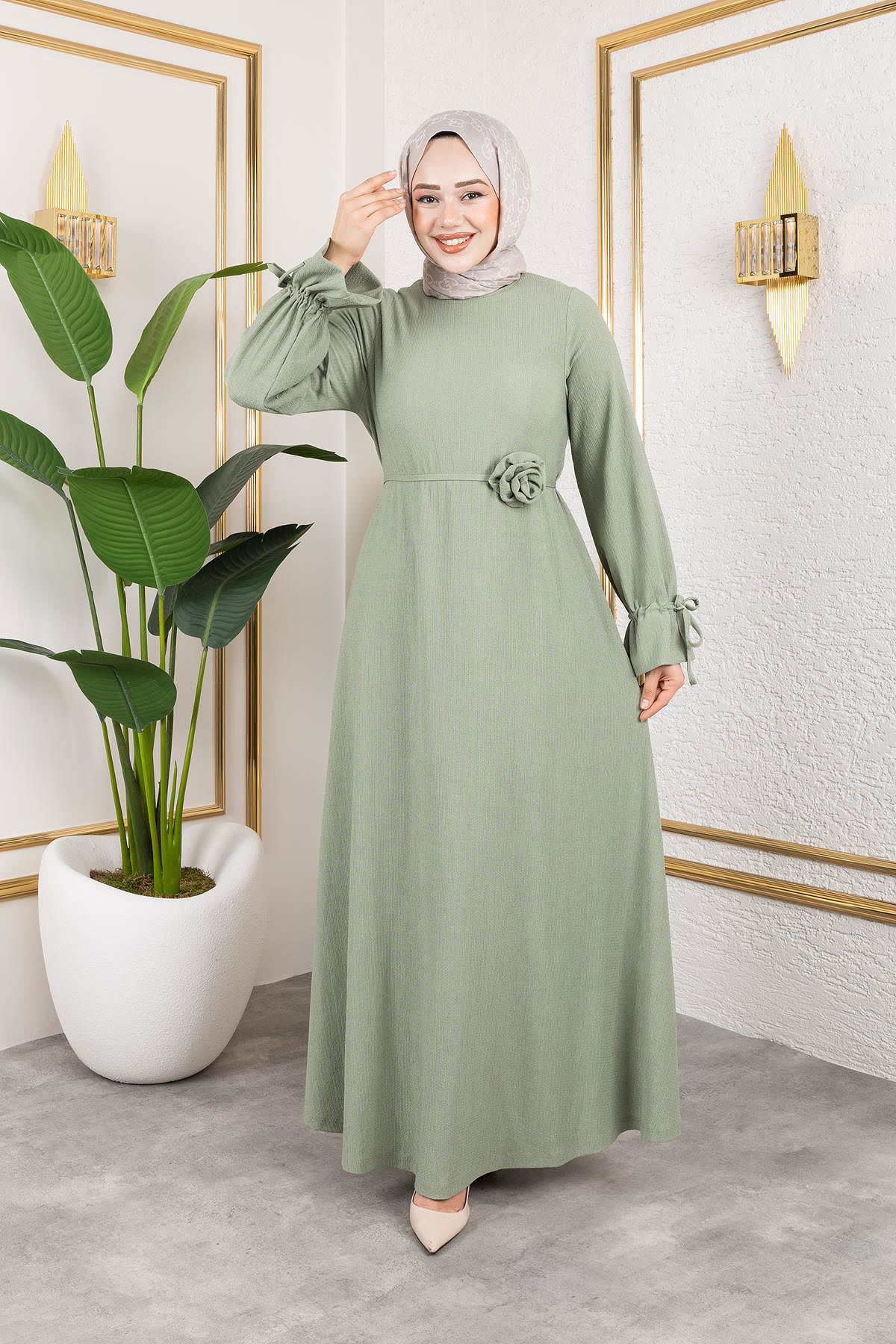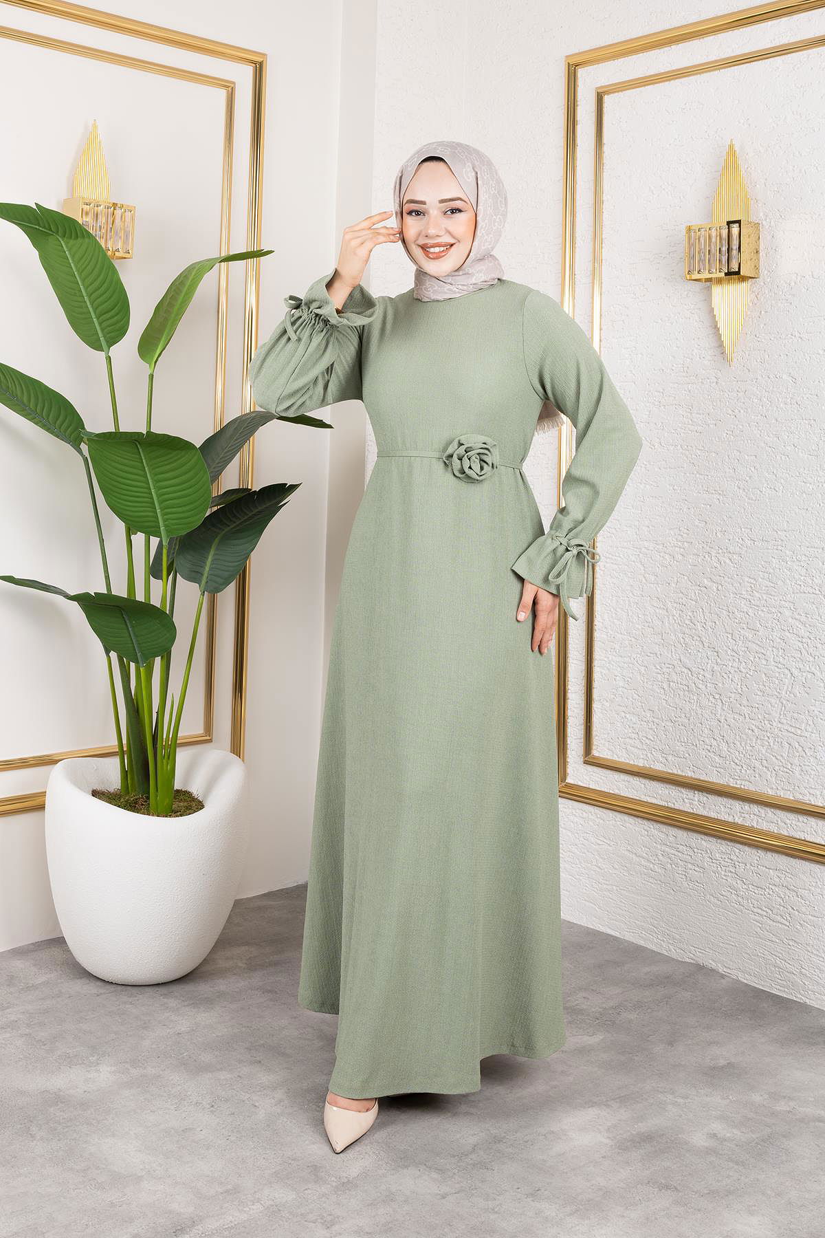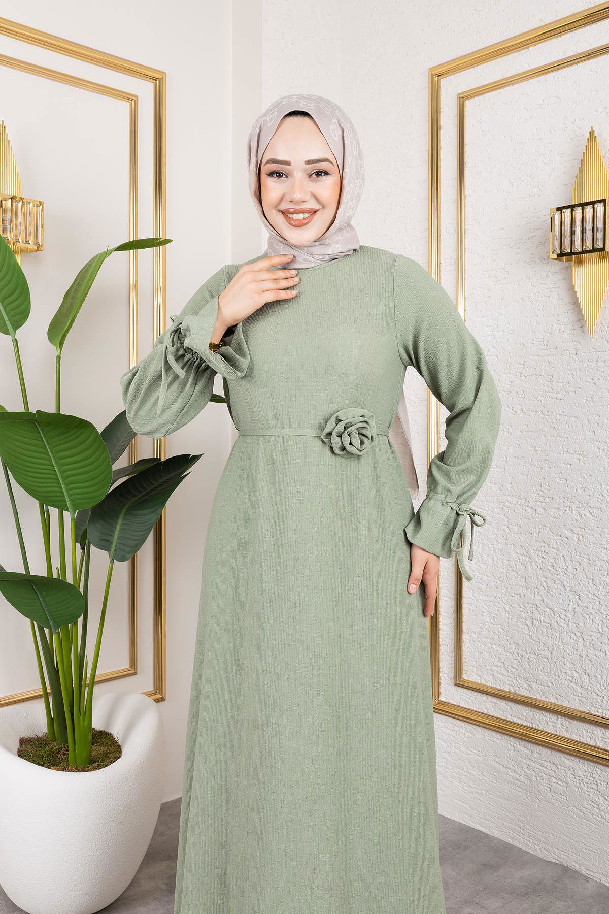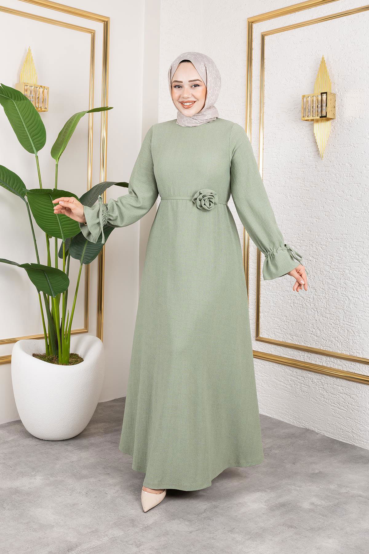 Kol Büzgülü Gül Detaylı Elbise-5030 Su yeşili