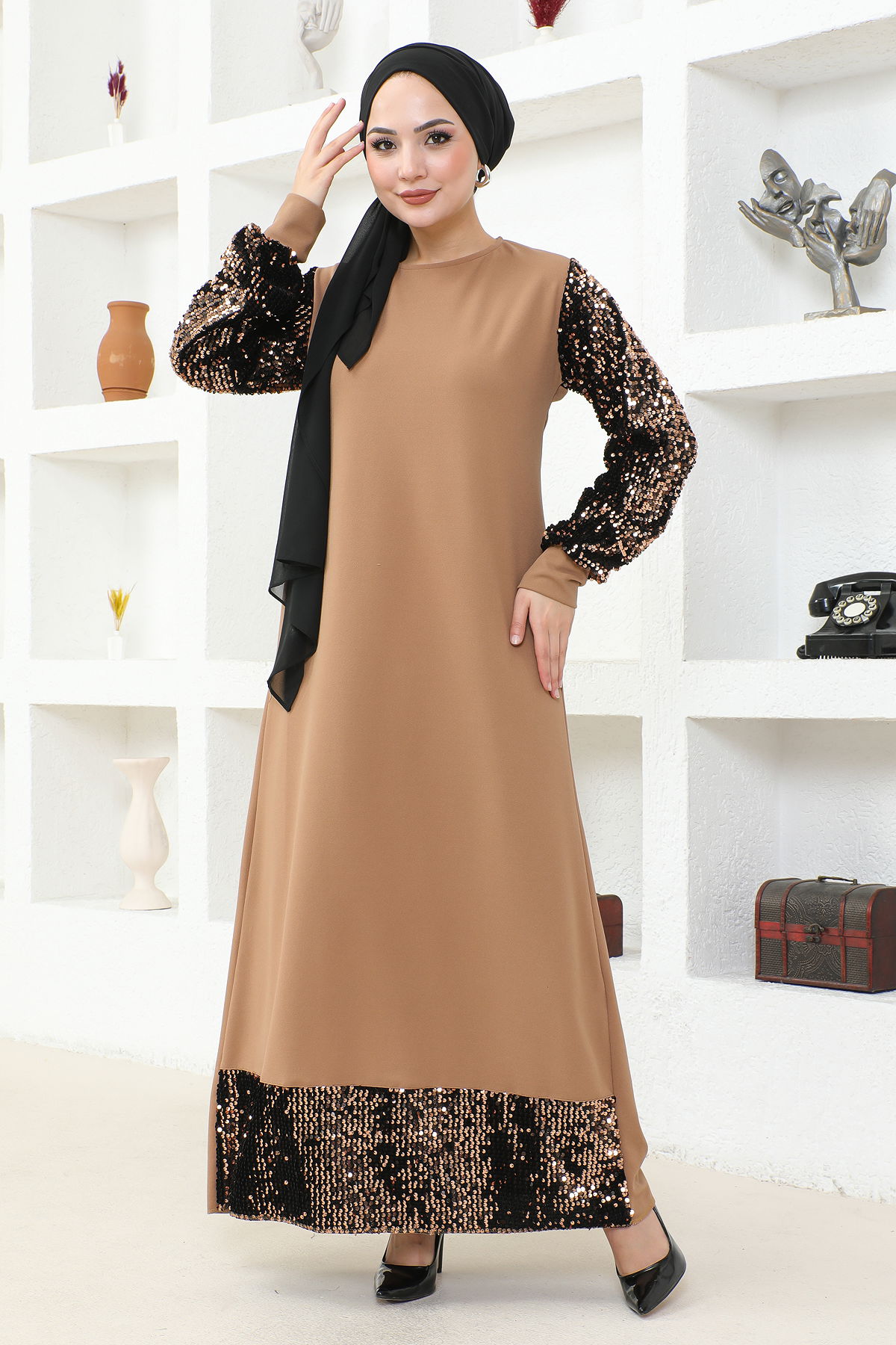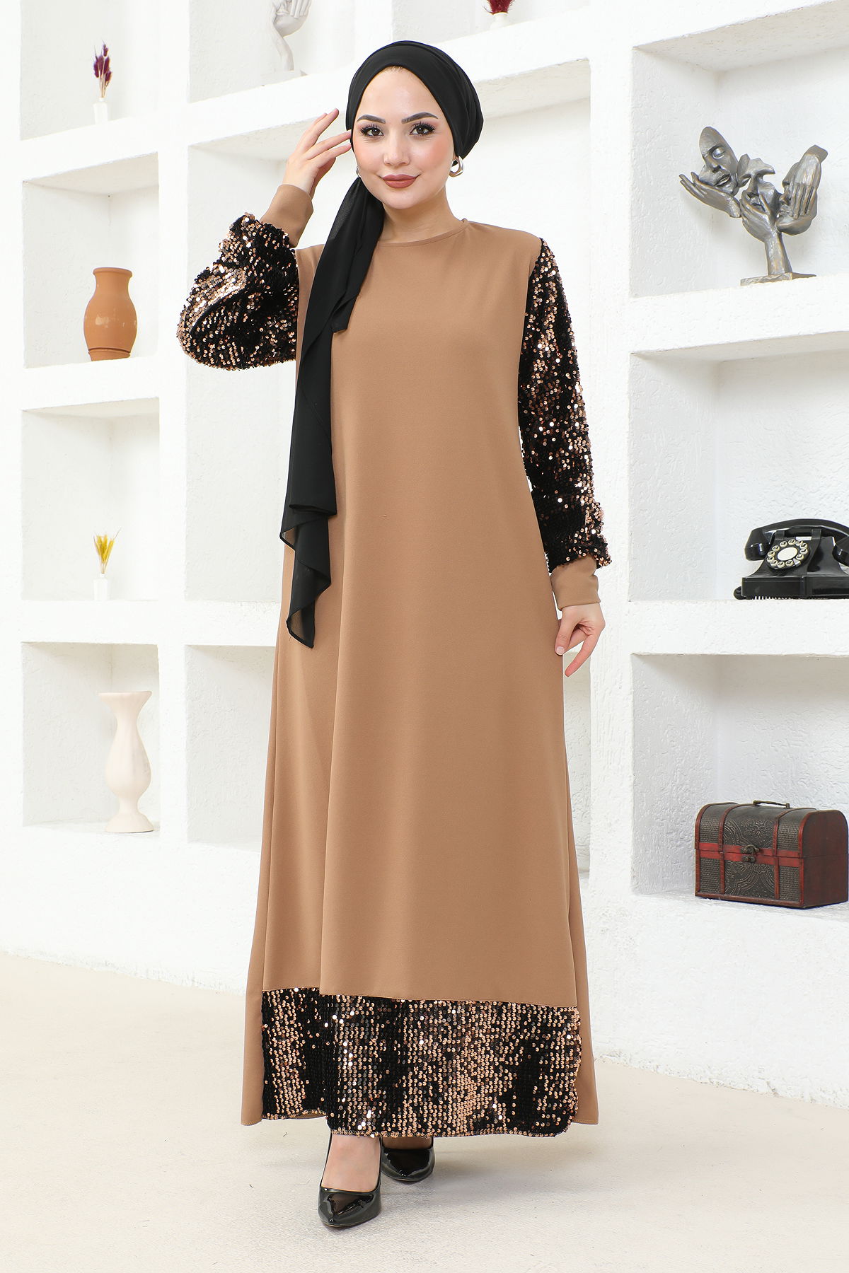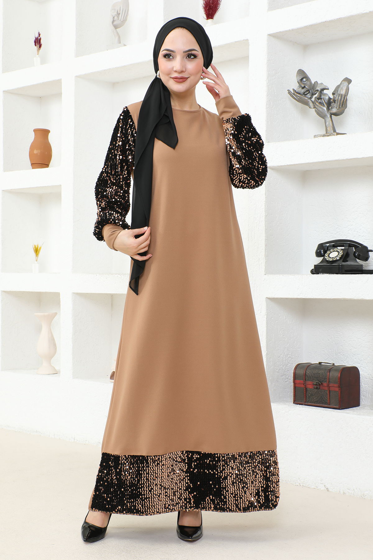Kol Ve Etek Ucu Pulpayetli Tesettür Elbise-3181 Taba
