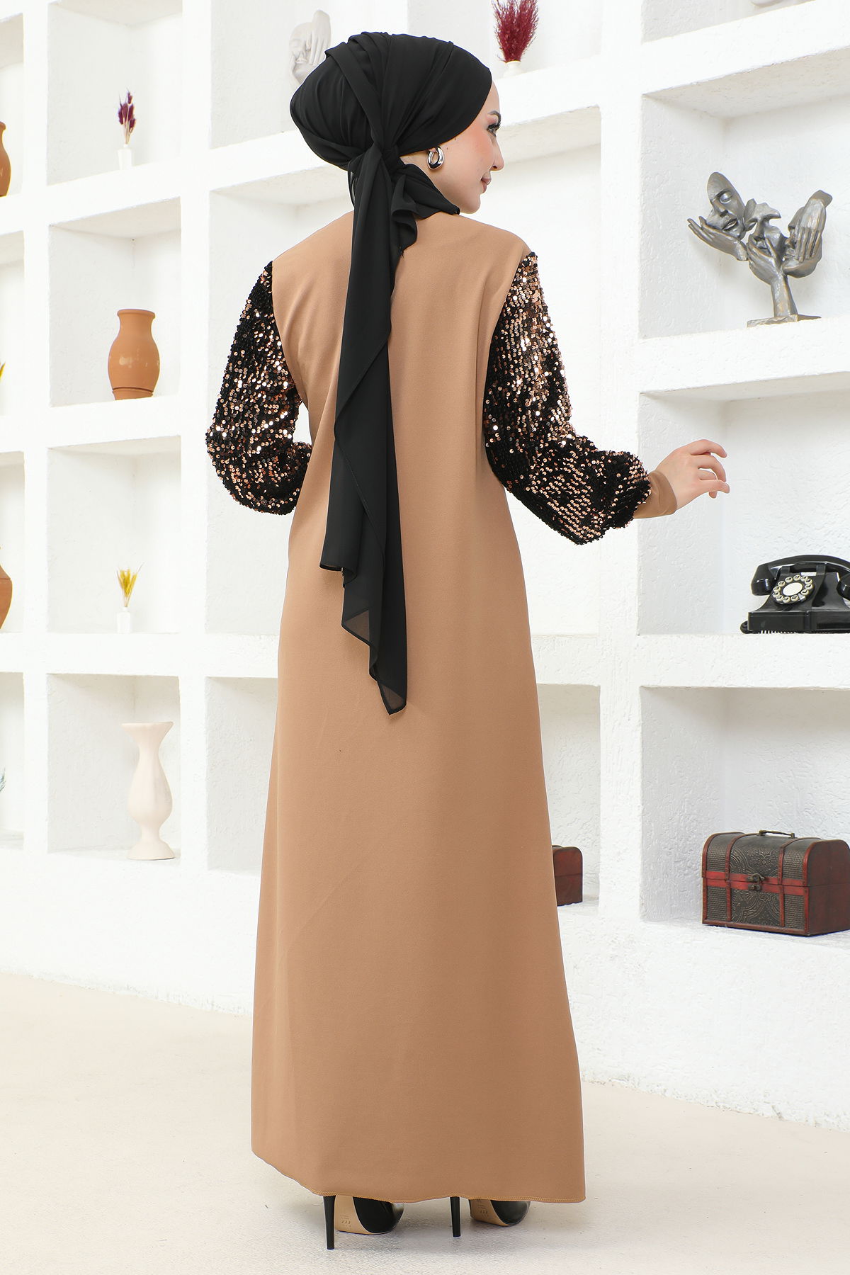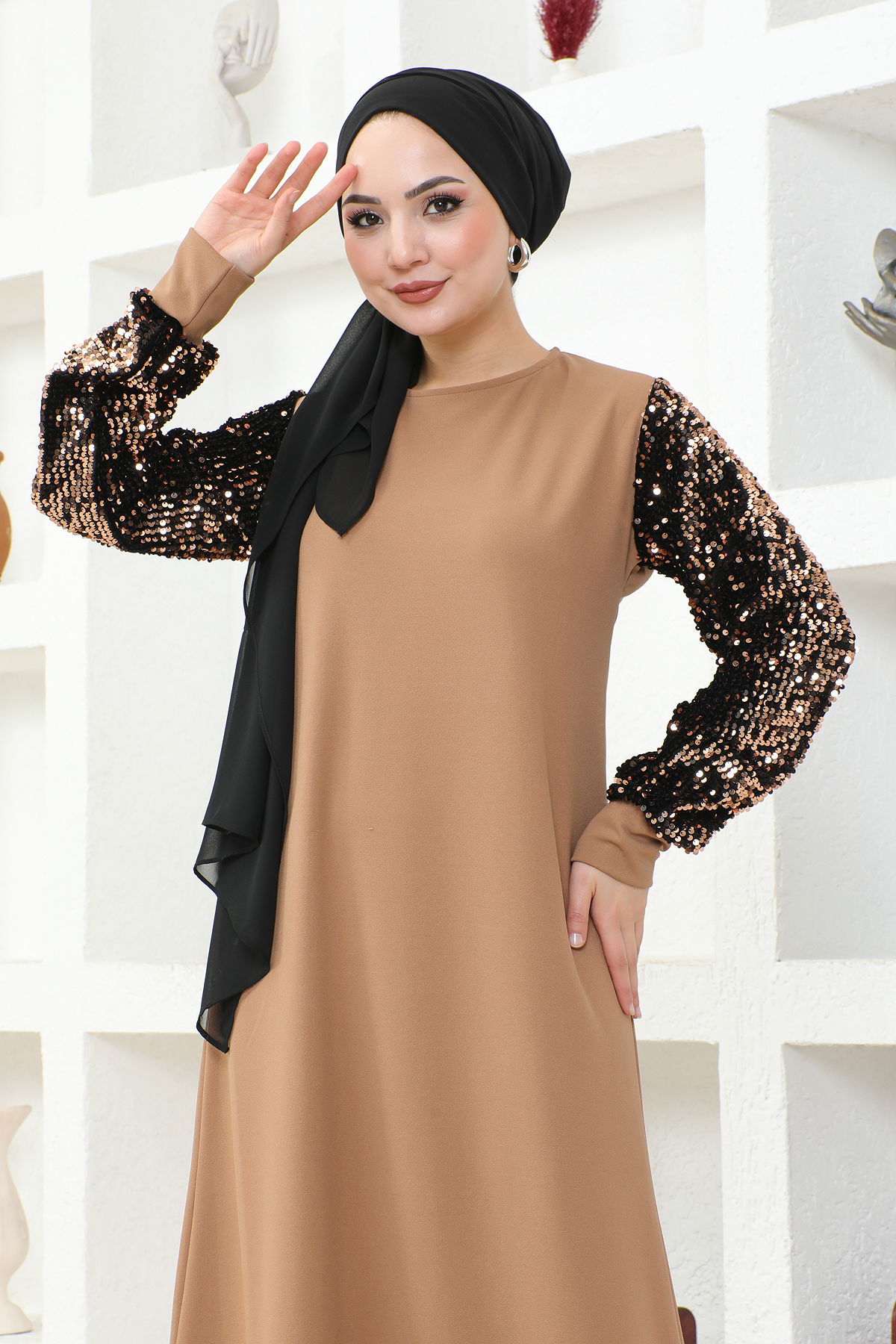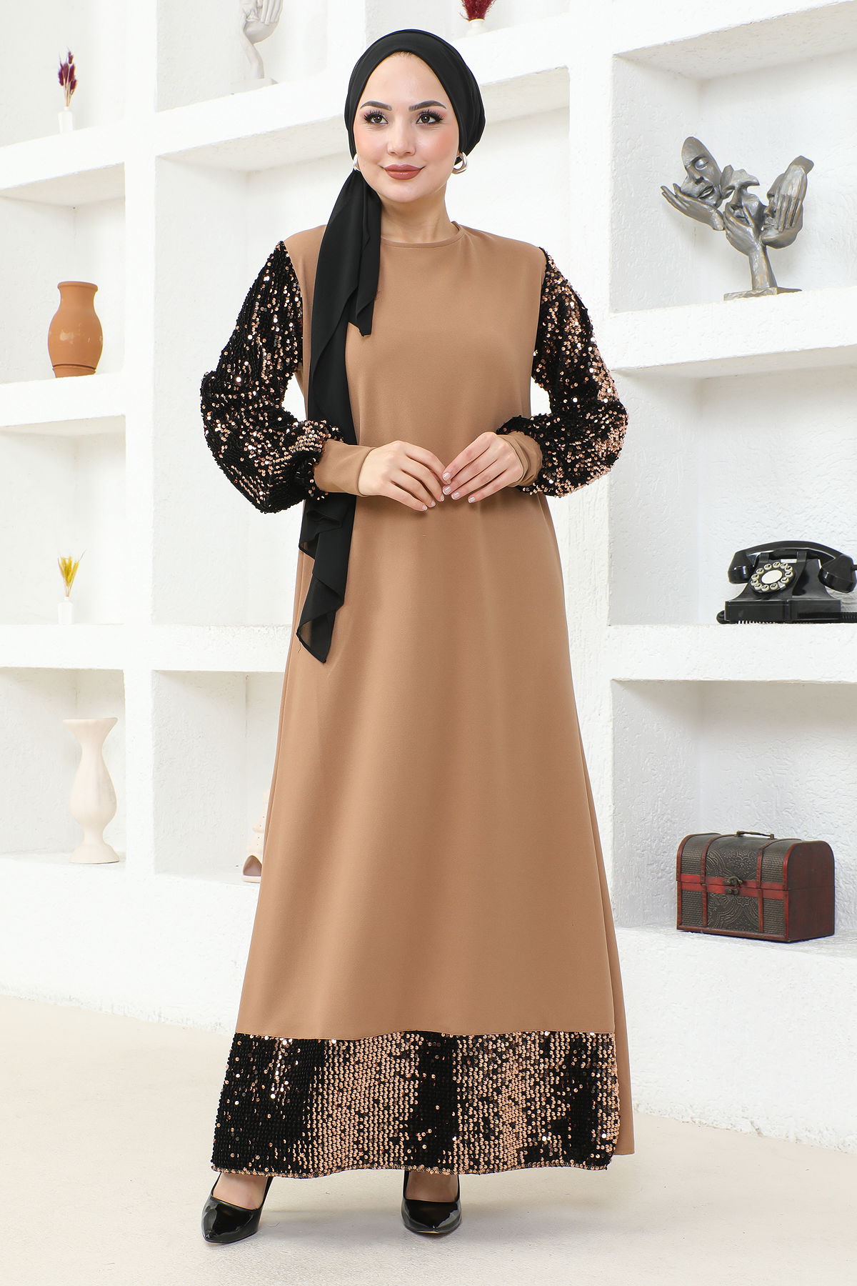 Kol Ve Etek Ucu Pulpayetli Tesettür Elbise-3181 Taba
