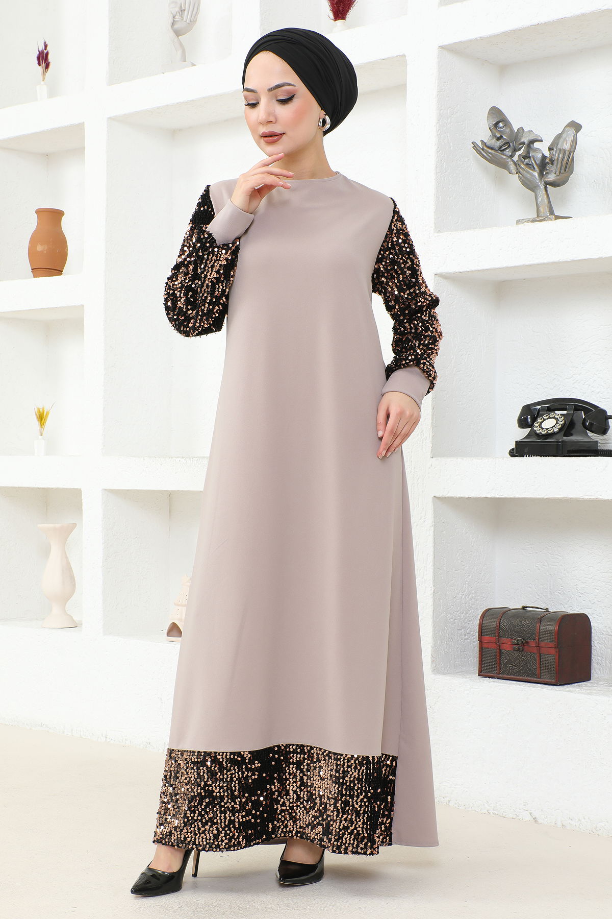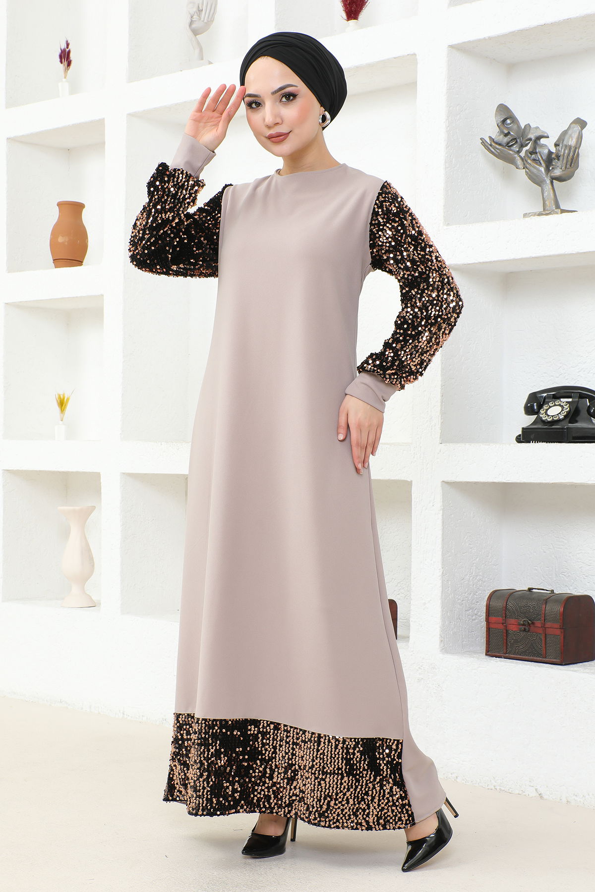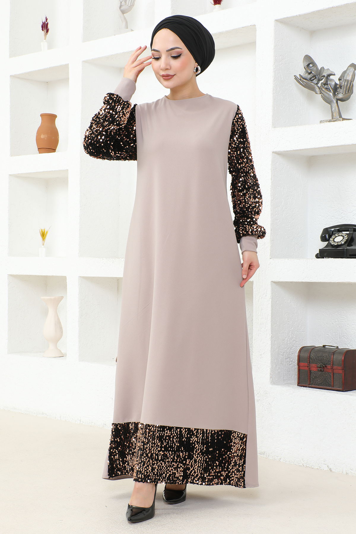 Kol Ve Etek Ucu Pulpayetli Tesettür Elbise-3181 Vizon
