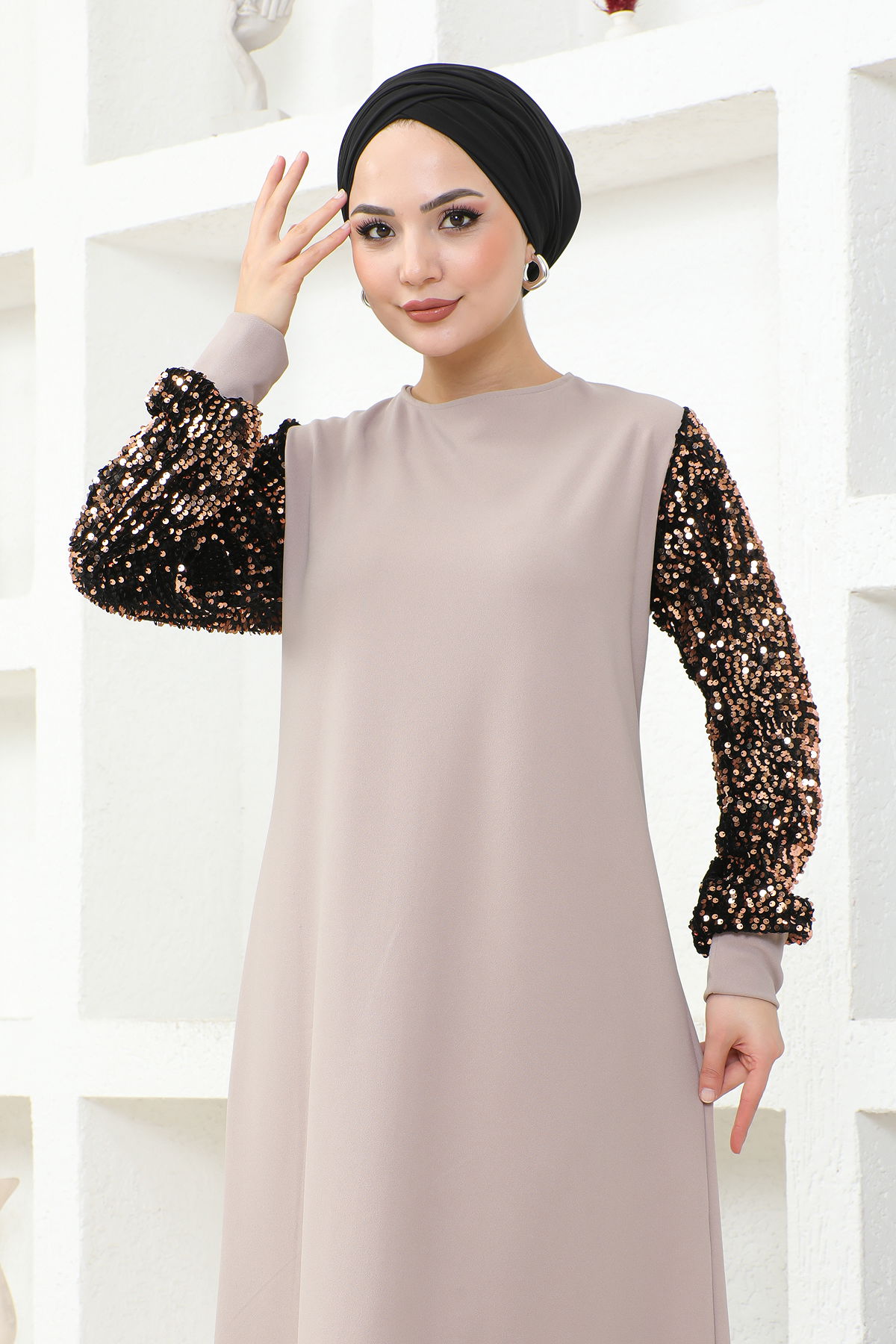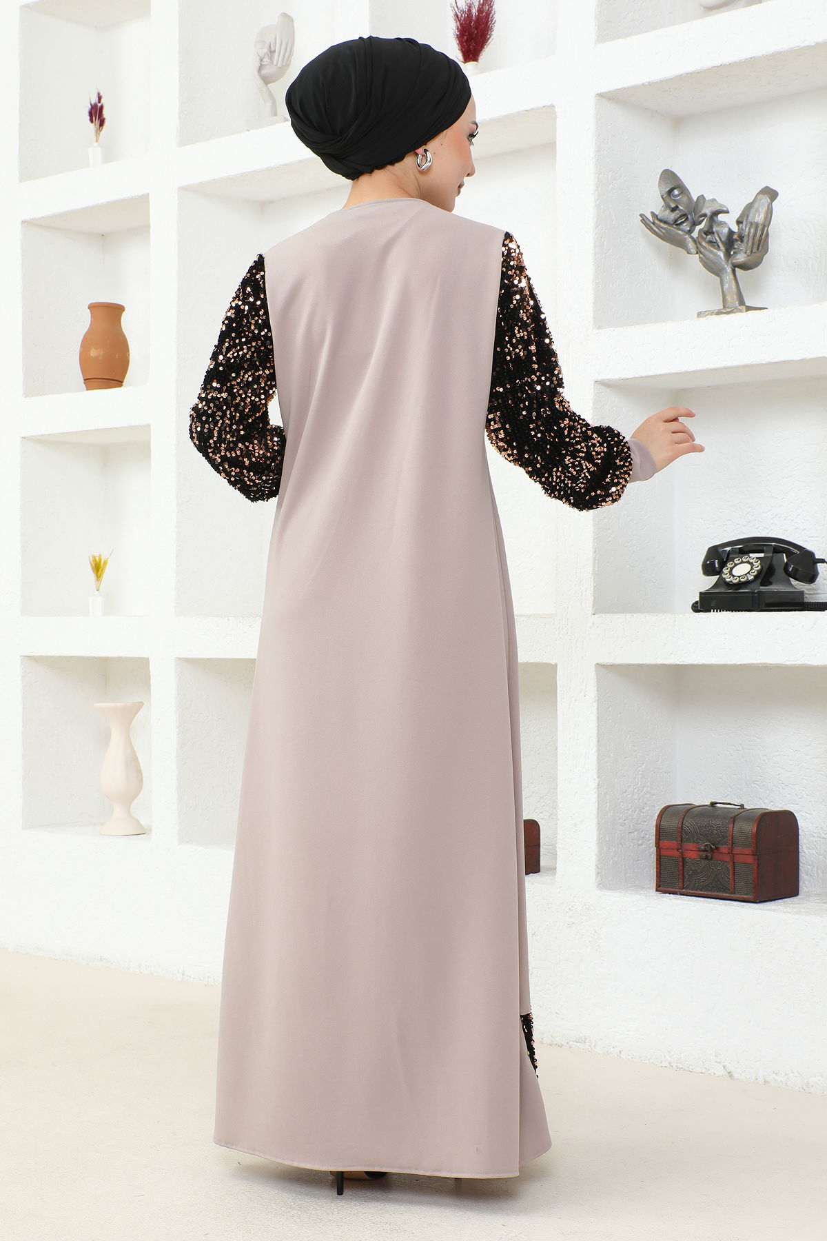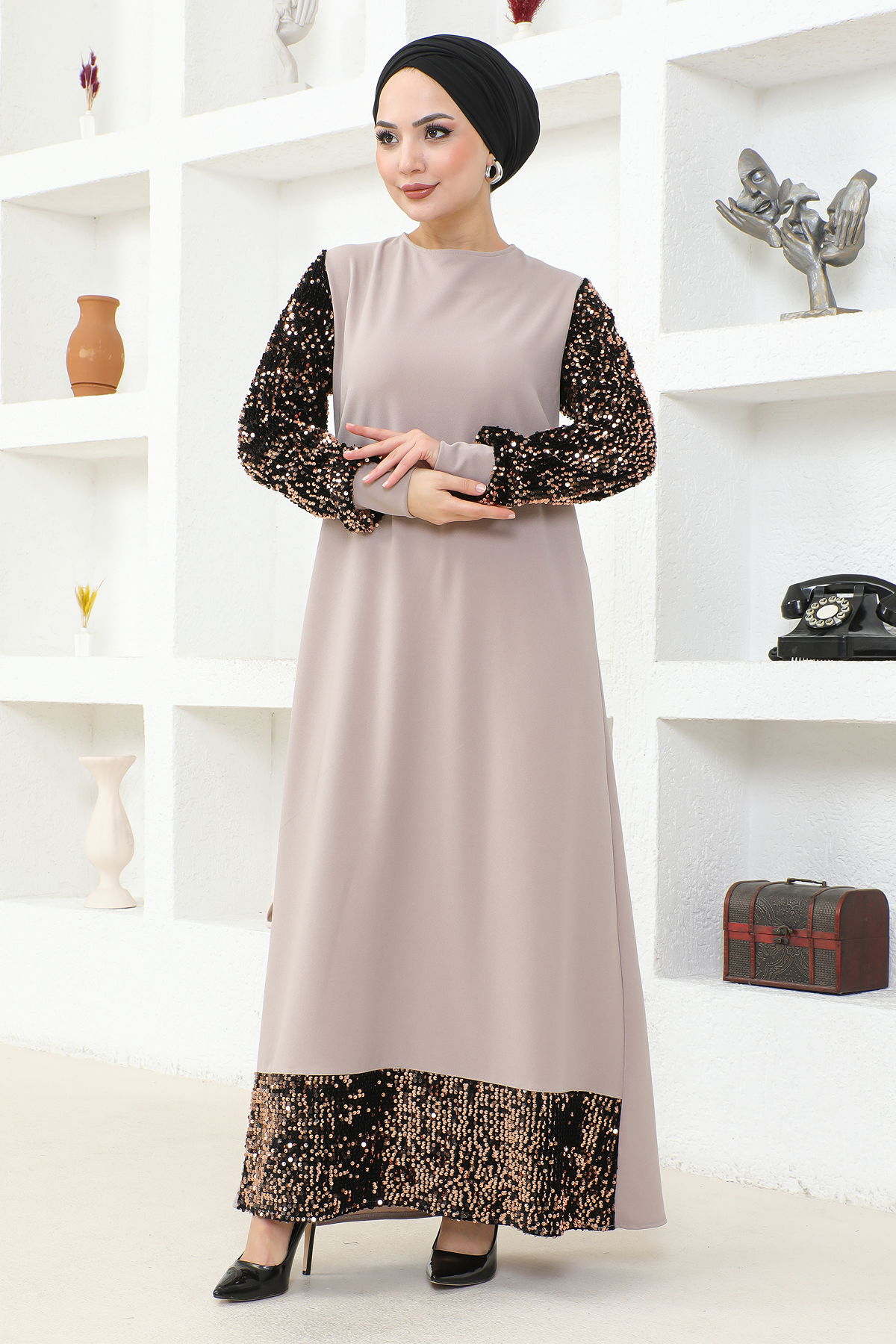 Kol Ve Etek Ucu Pulpayetli Tesettür Elbise-3181 Vizon