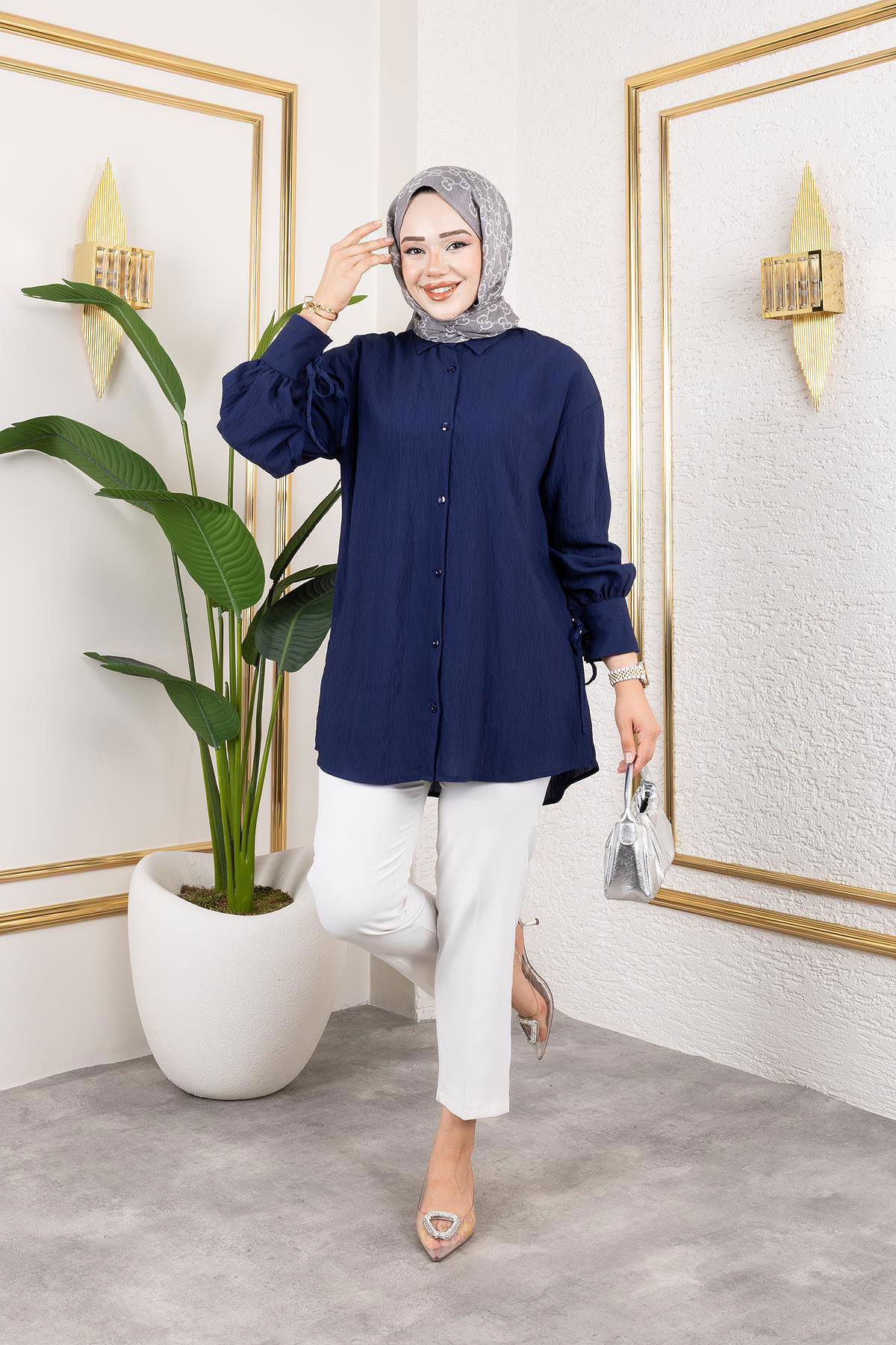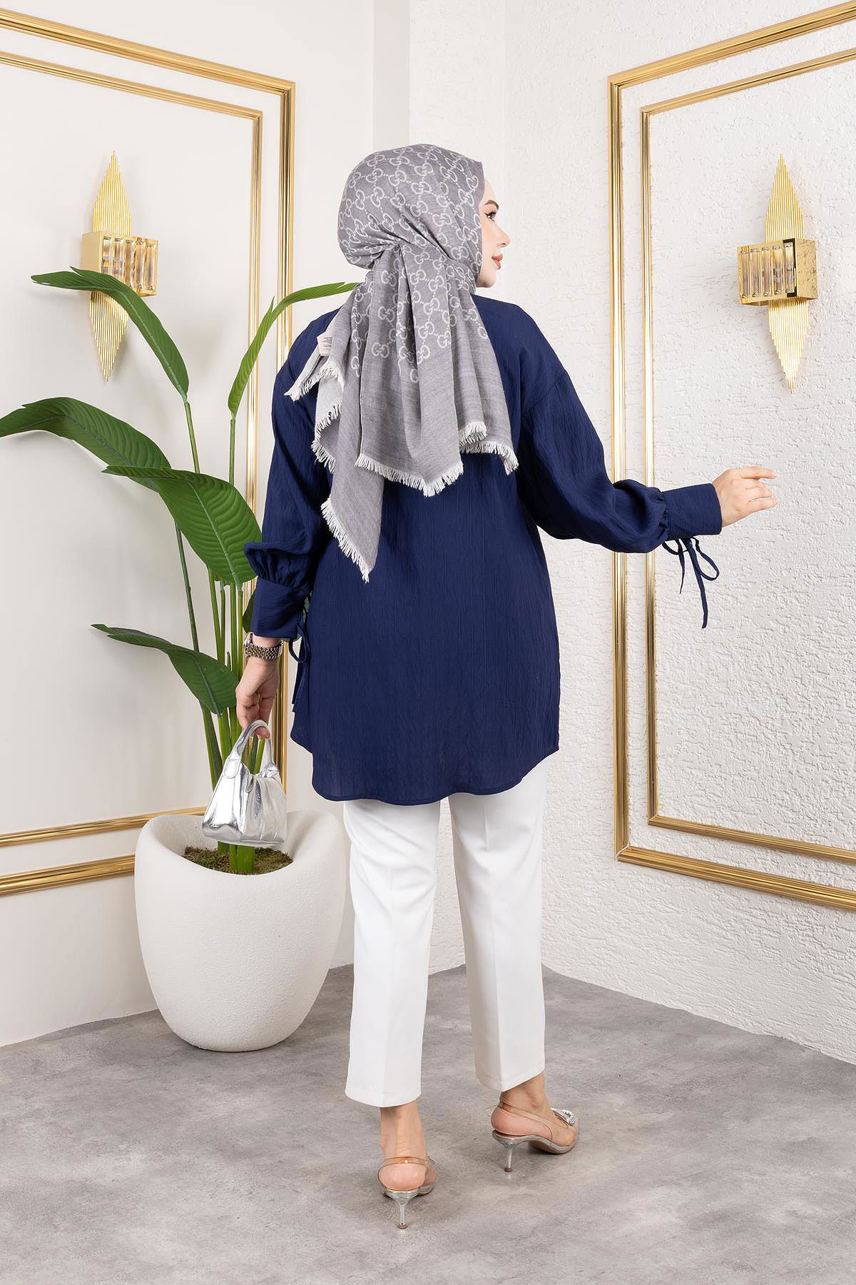Kolları Bağcık Detaylı Tesettür Tunik-5218 Lacivert