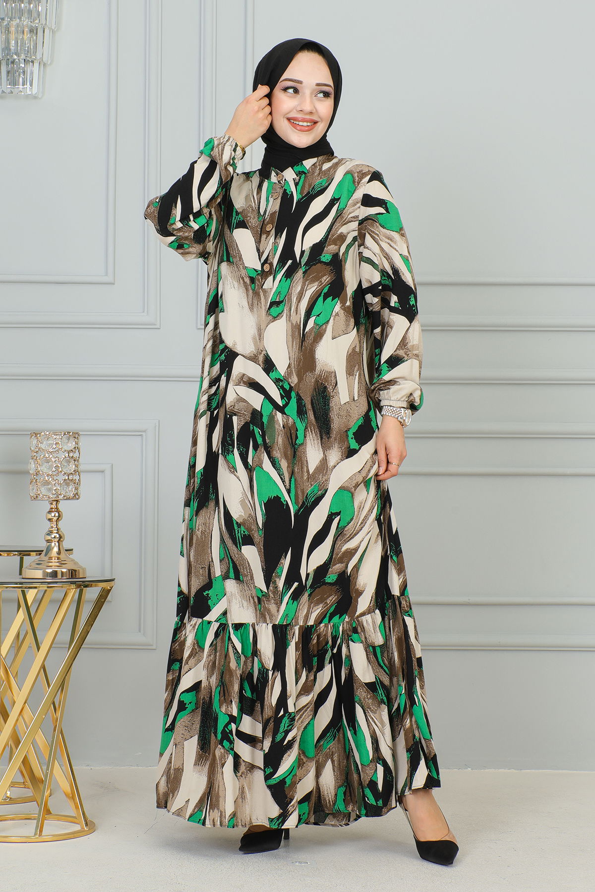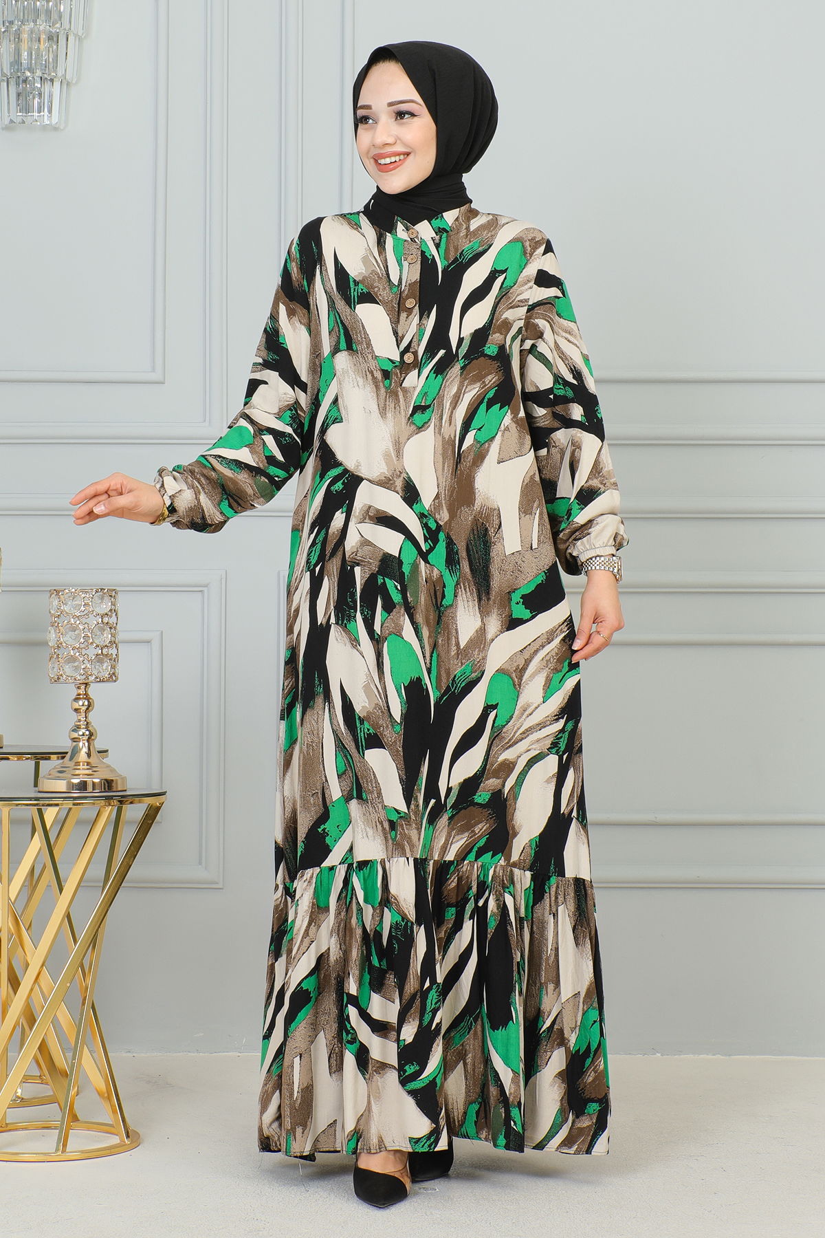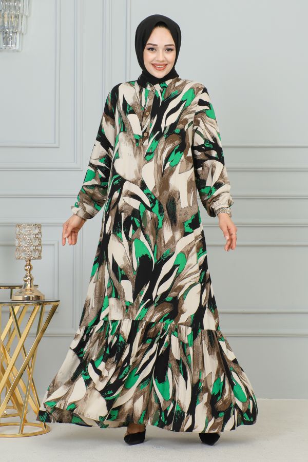 Kolu Lastikli Düğmeli Tesettür Elbise-3176 Kahve Yeşil