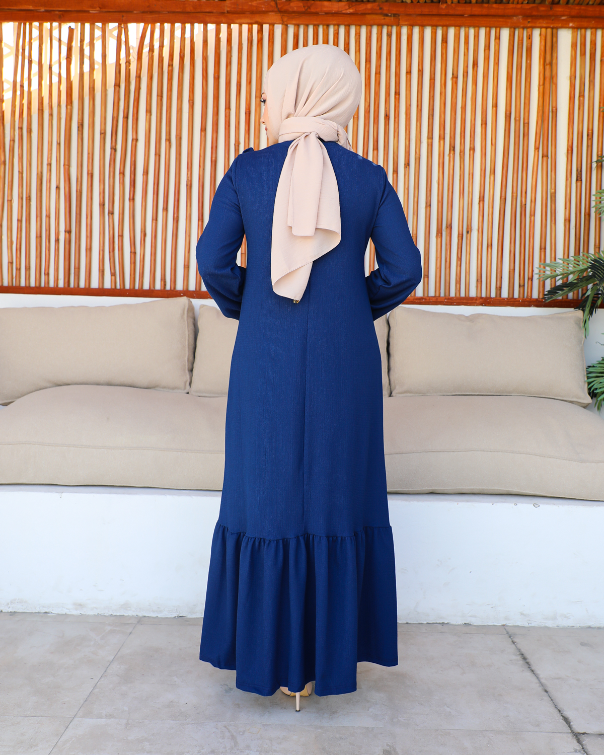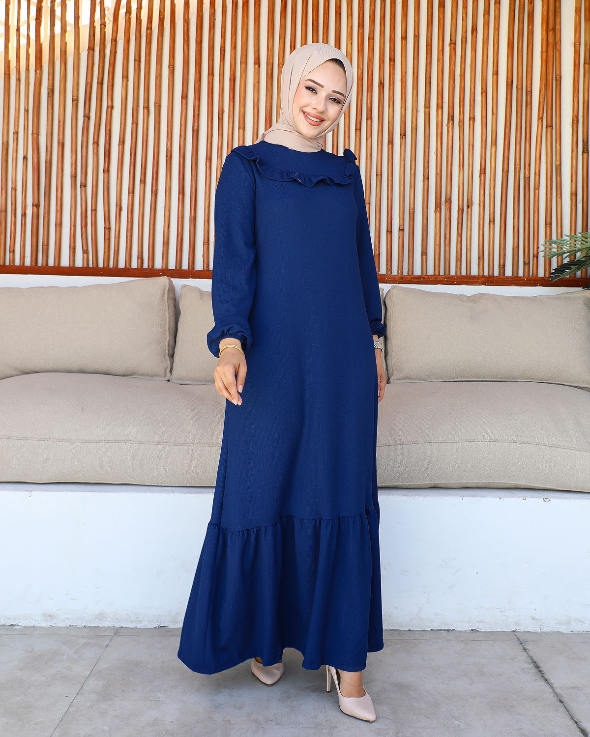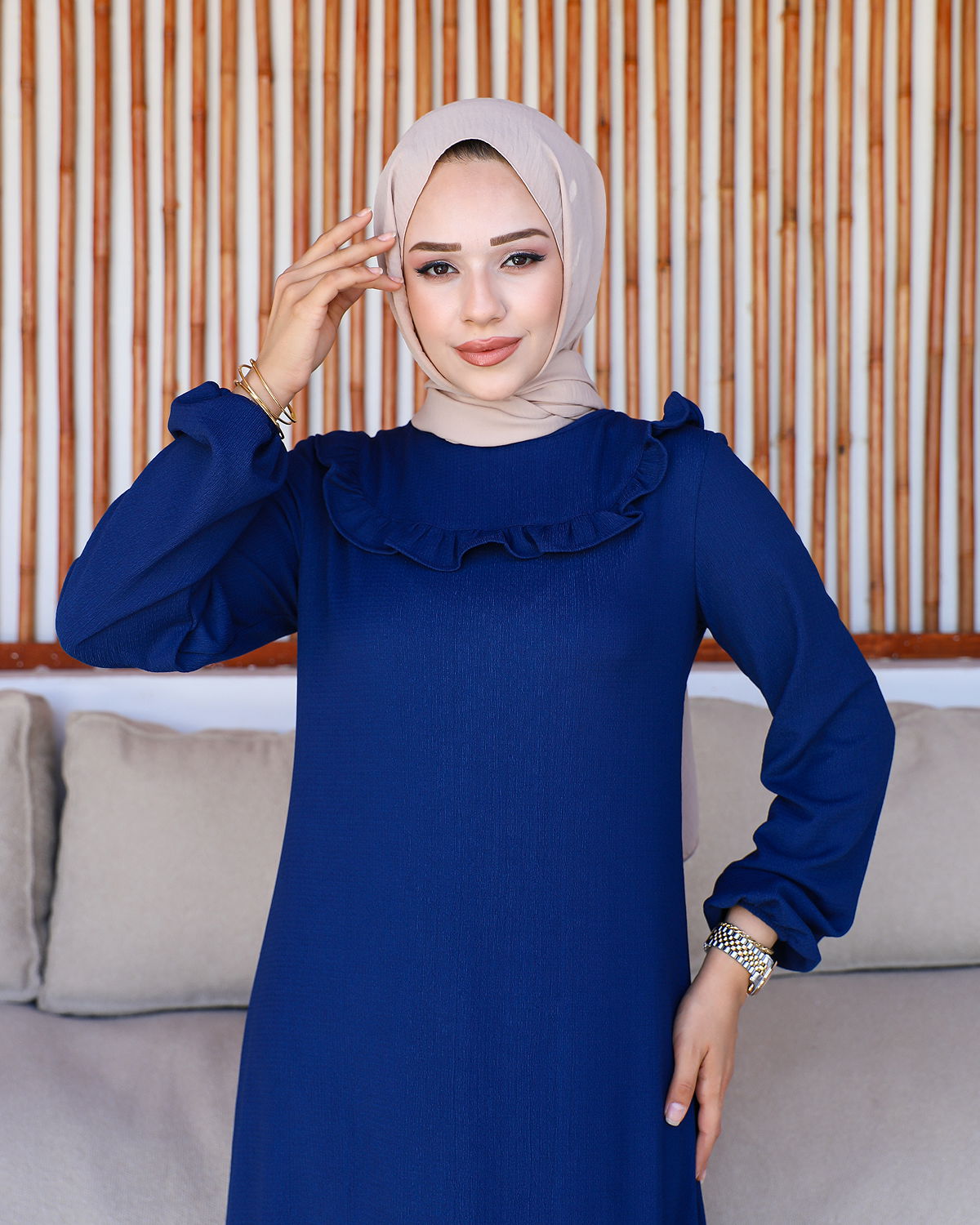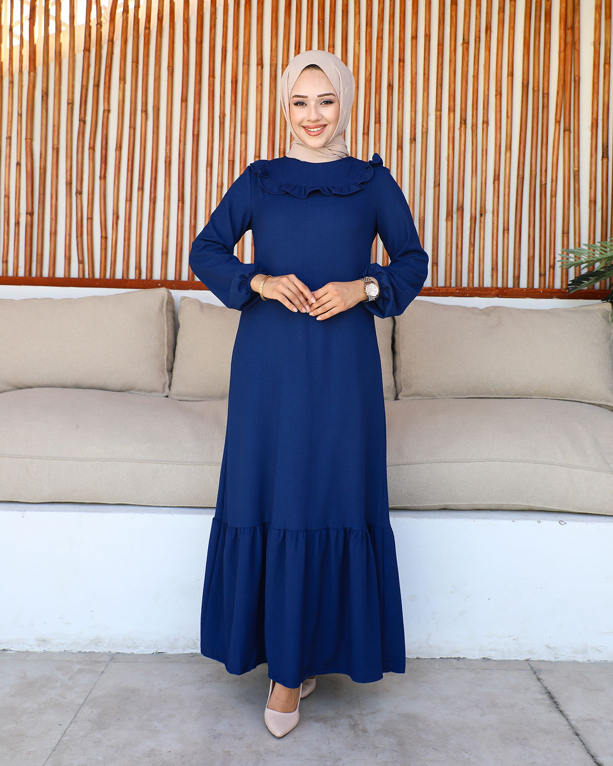 Kolu Lastikli Fırfır Detay Tesettür elbise-3161 Lacivert