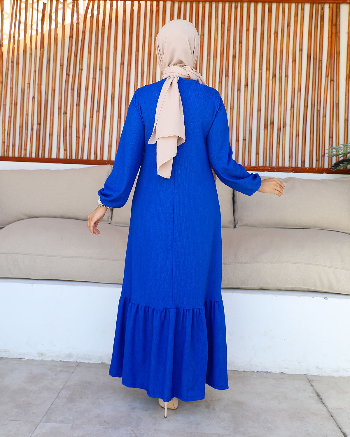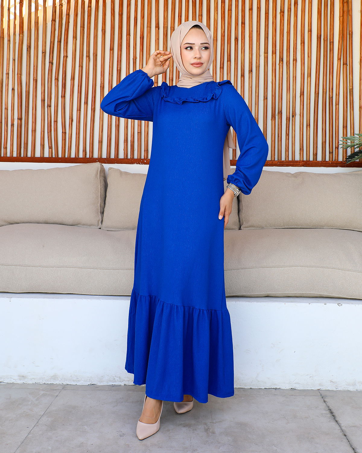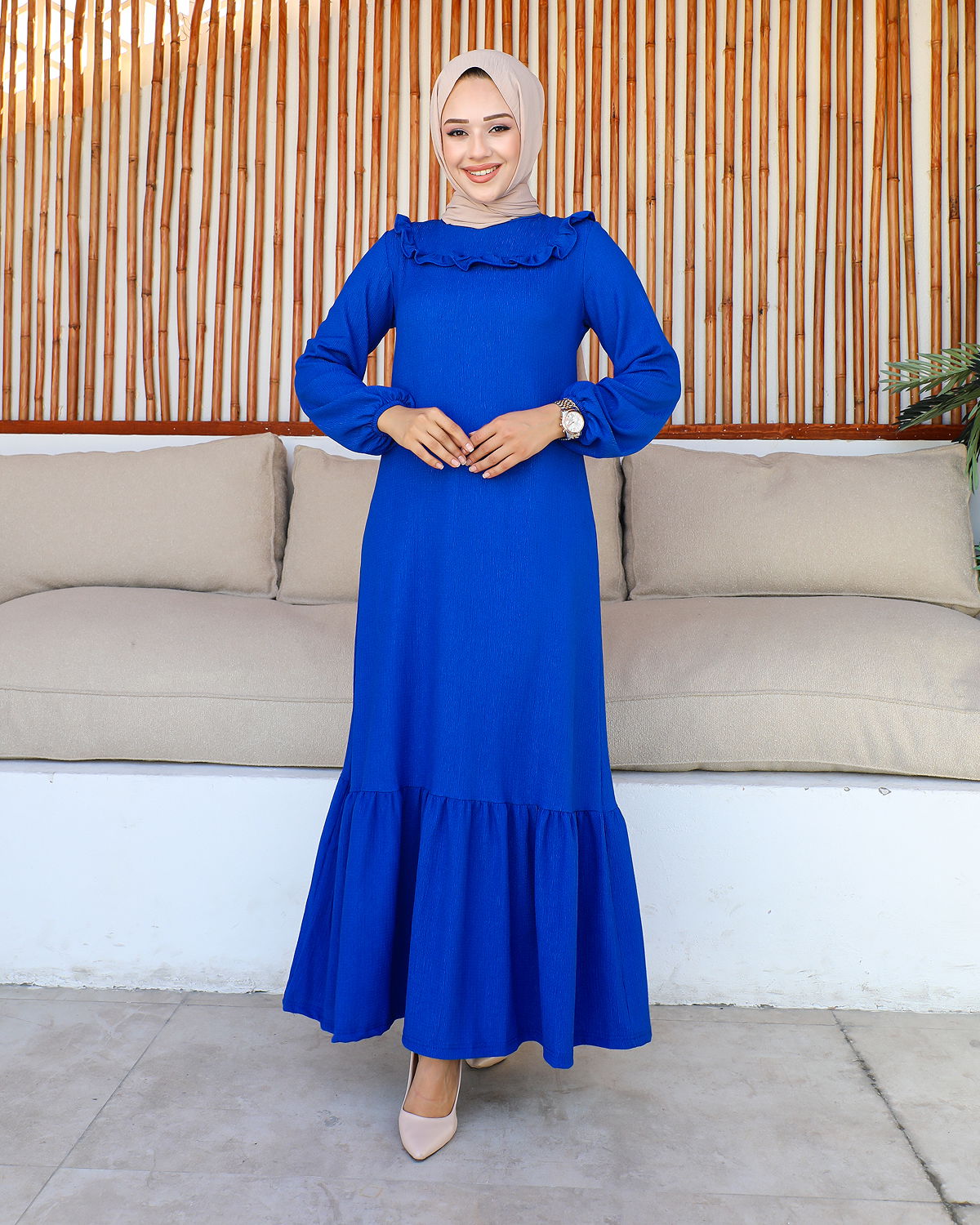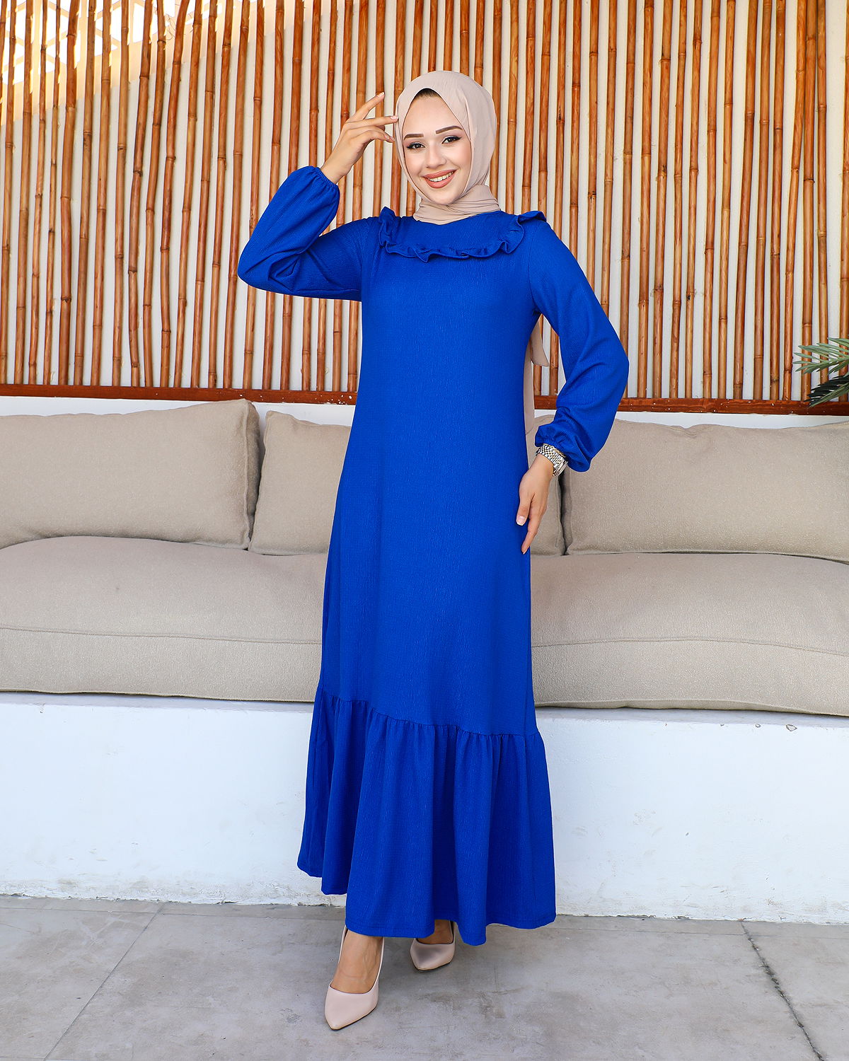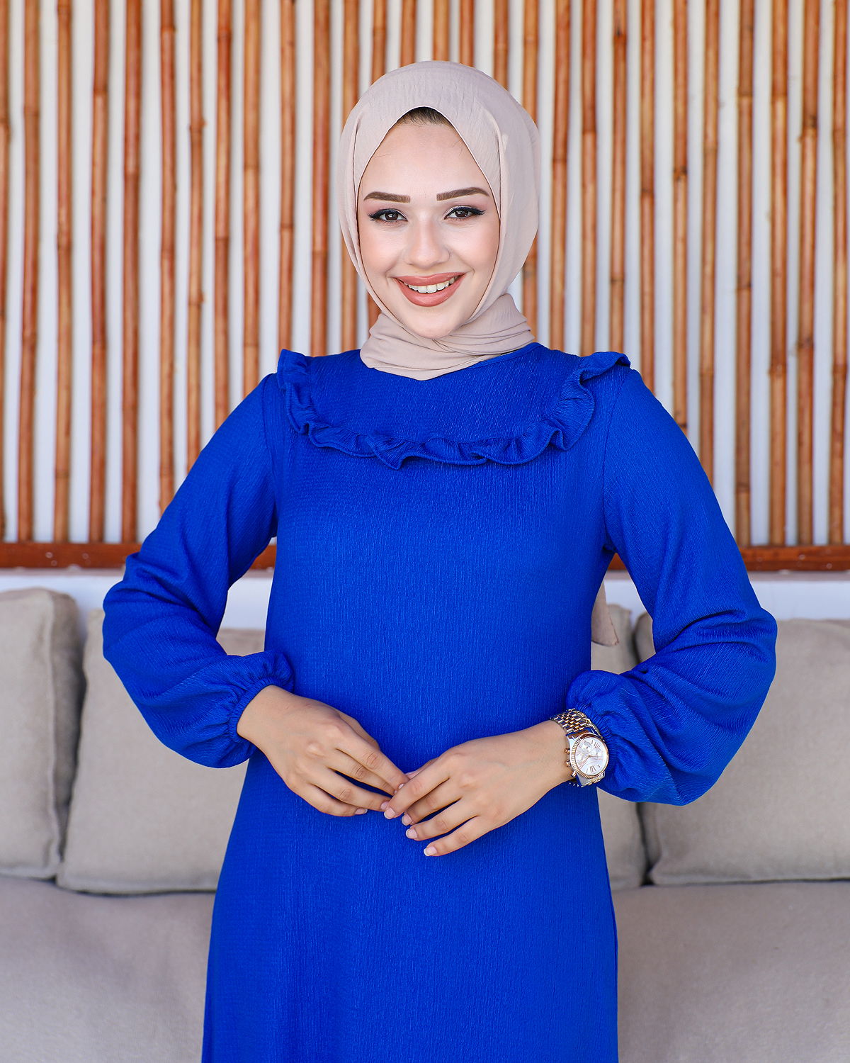Kolu Lastikli Fırfır Detay Tesettür elbise-3161 Saks mavisi
