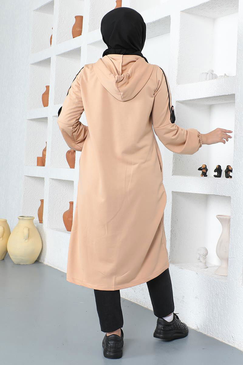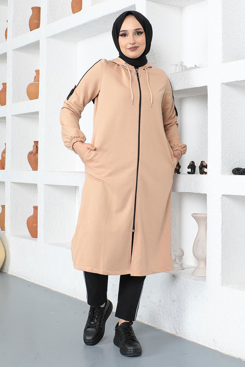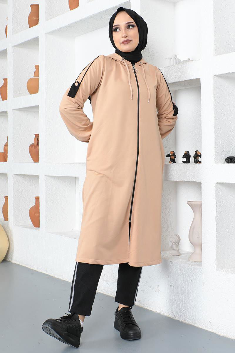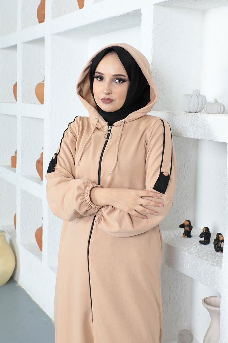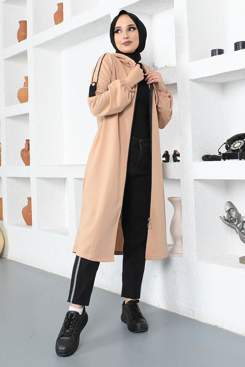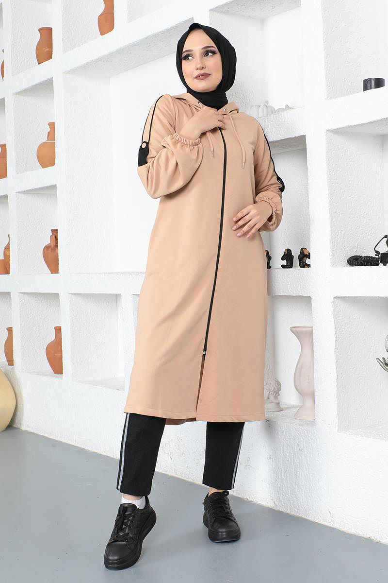 Kolu Lastikli Kapüşonlu Tesettür Kap-3113 Taba