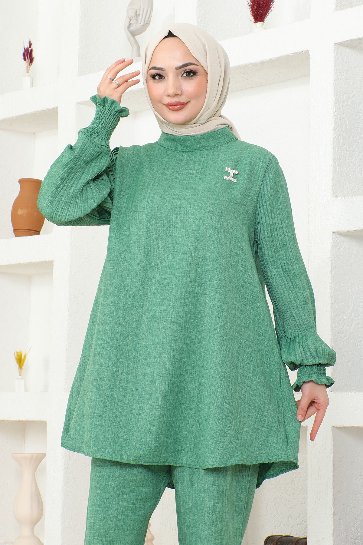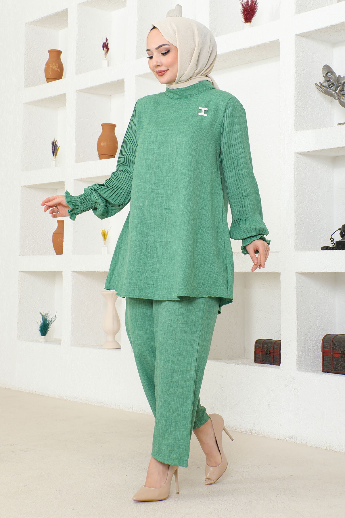 Kolu Piliseli Broşlu Tesettür Takım-3835 Yeşil