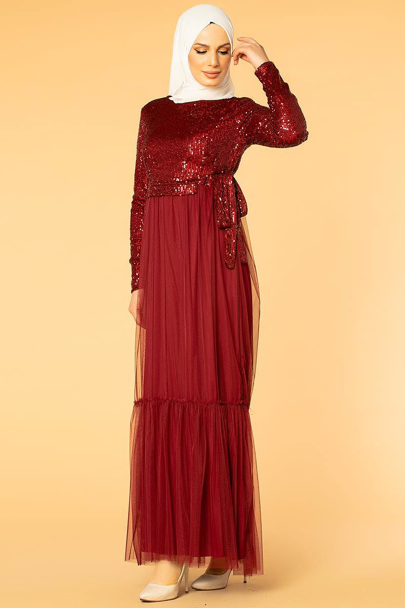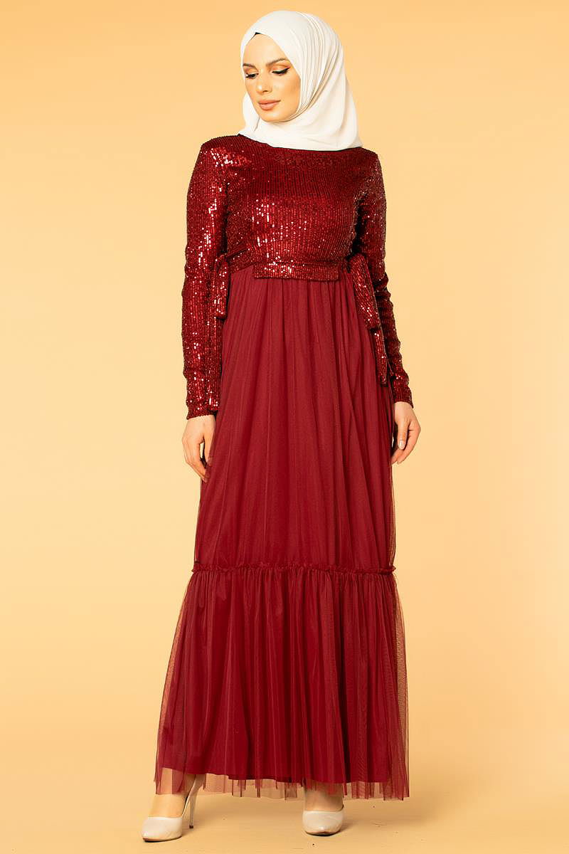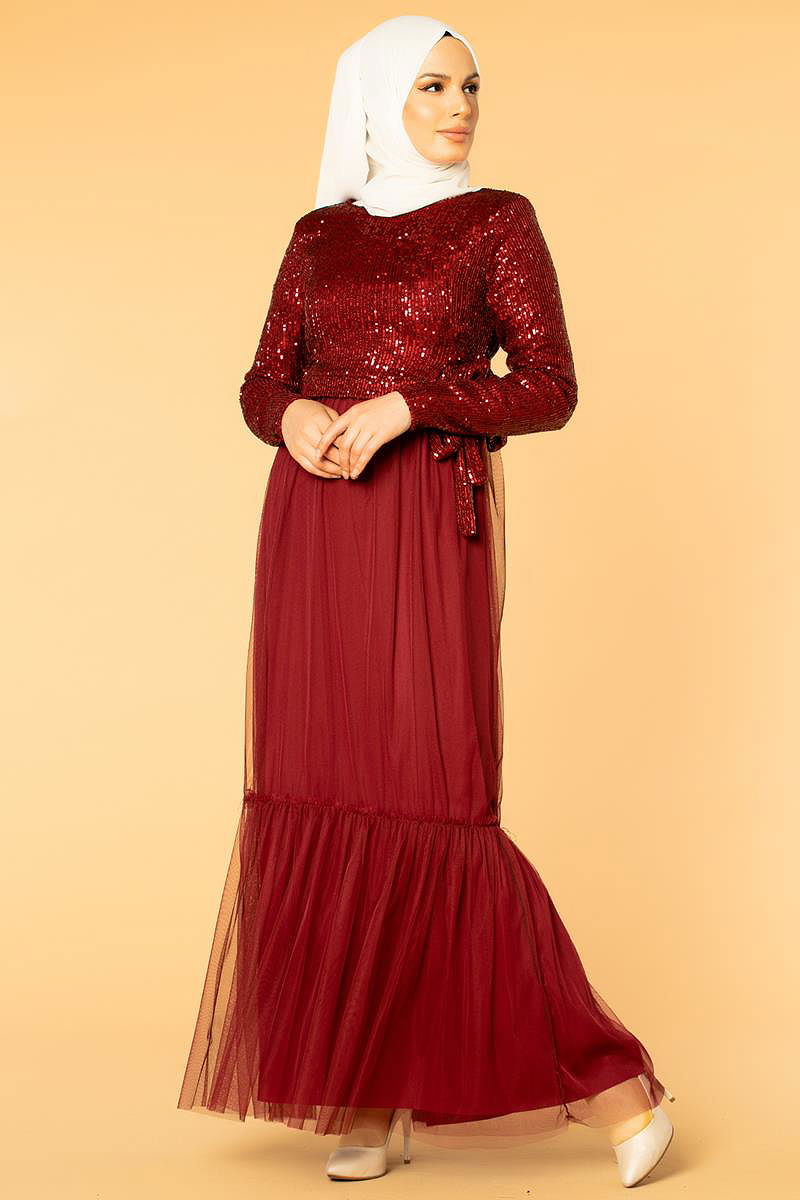 Lina Pulpayetli Tesettür Abiye-1130 Bordo