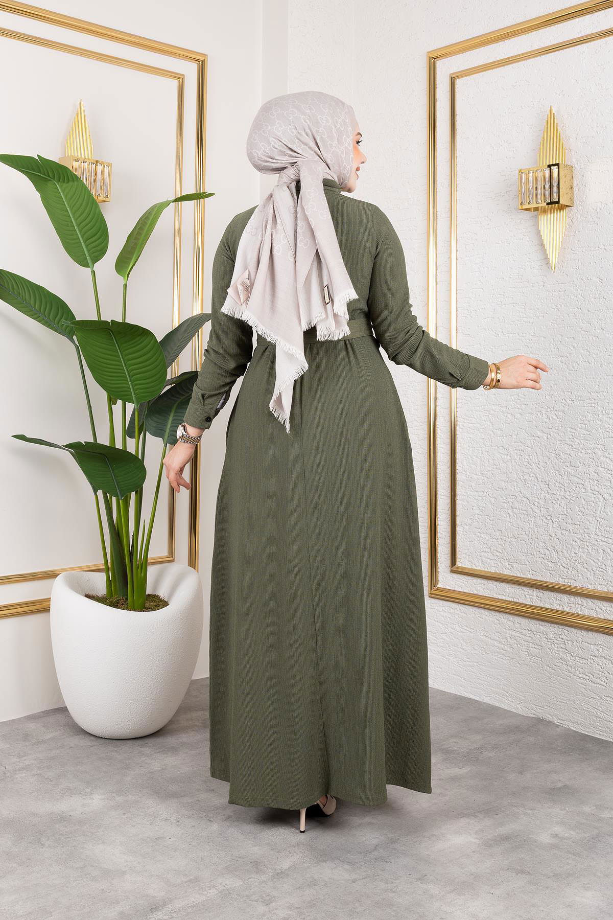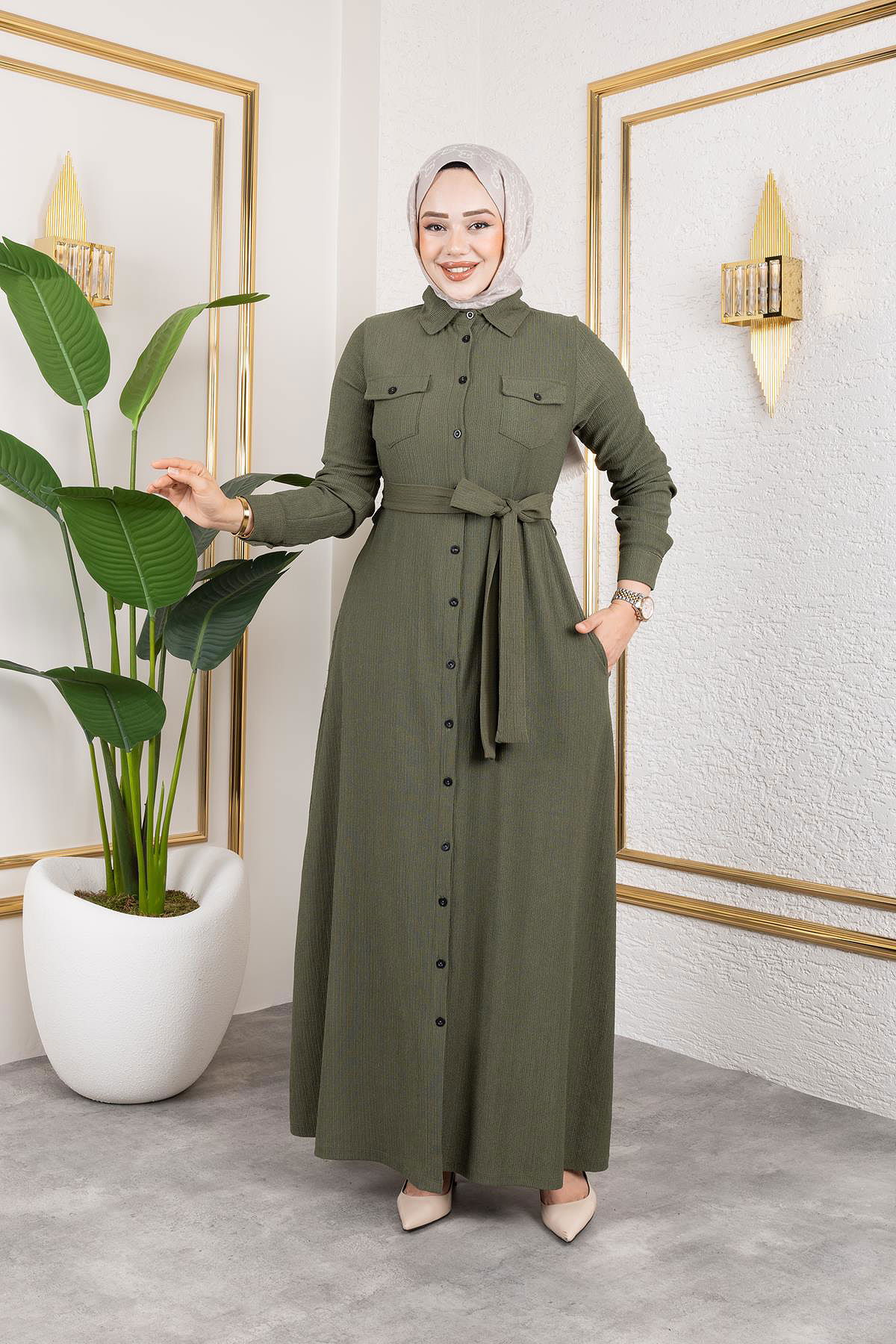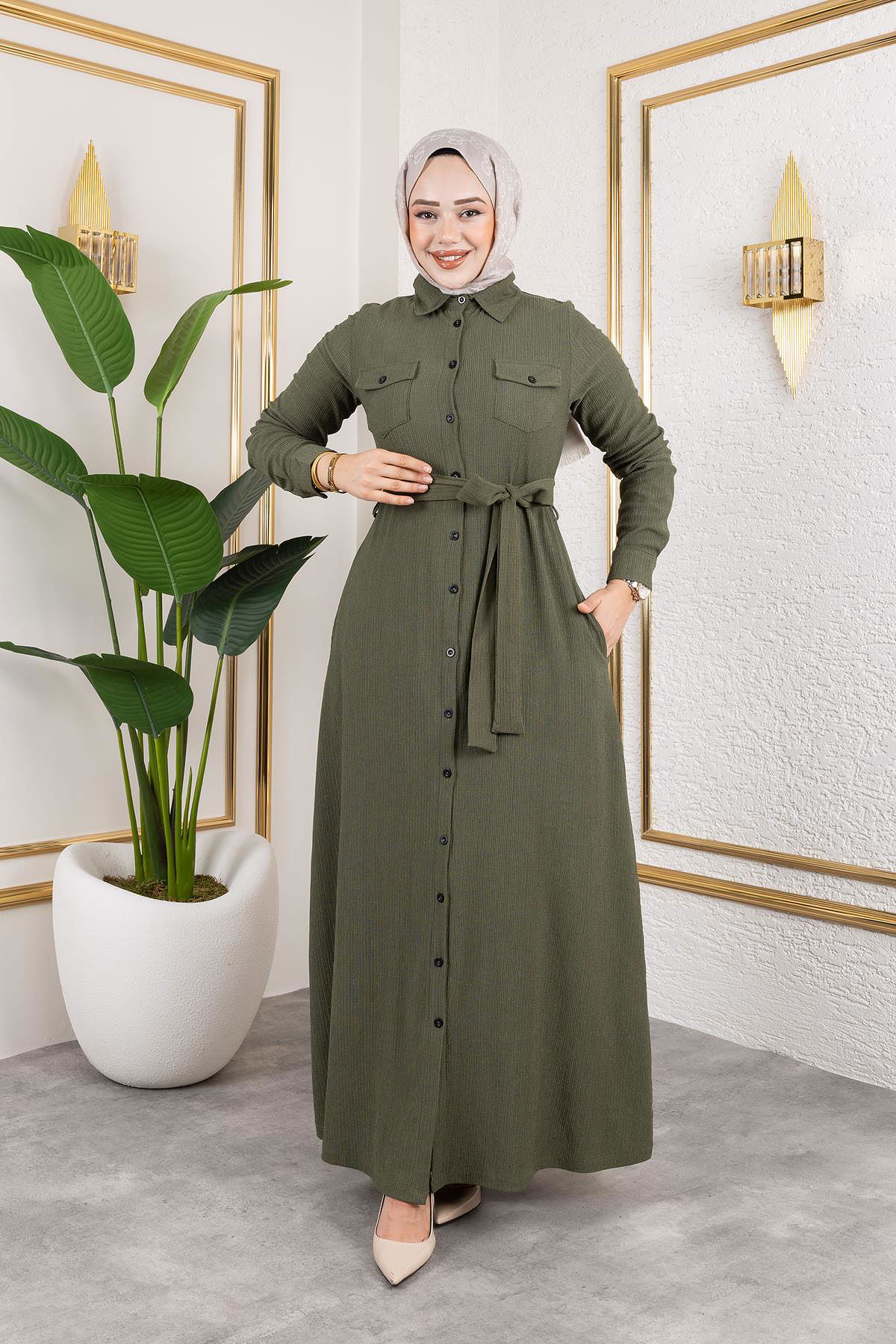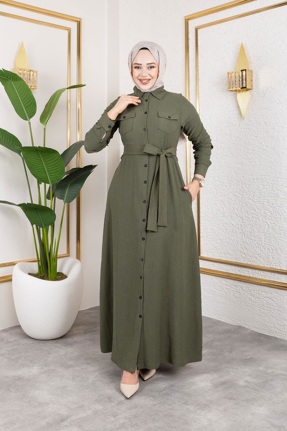 Ön Düğmeli Gizli Cep Detaylı Elbise-5029 Haki yeşili