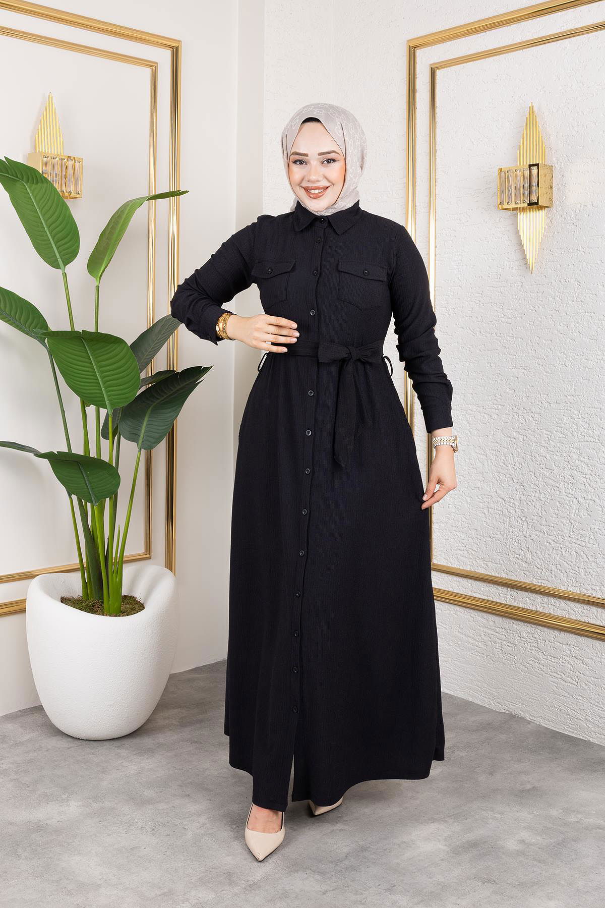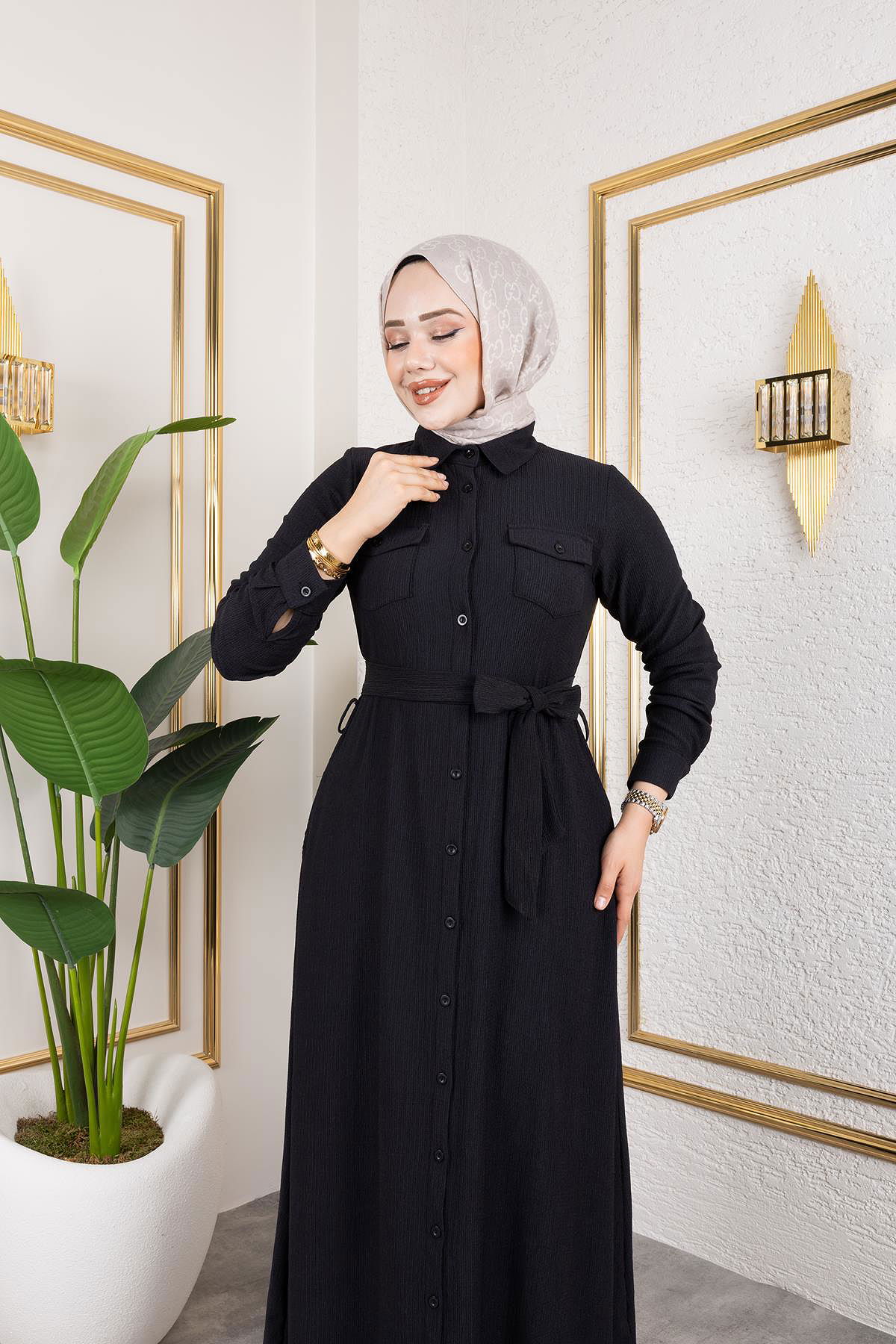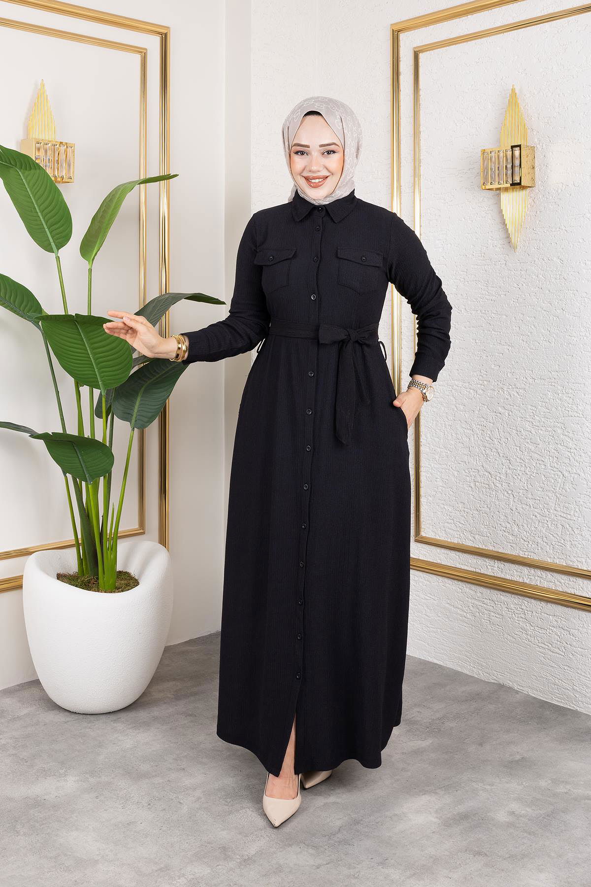 Ön Düğmeli Gizli Cep Detaylı Elbise-5029 Siyah