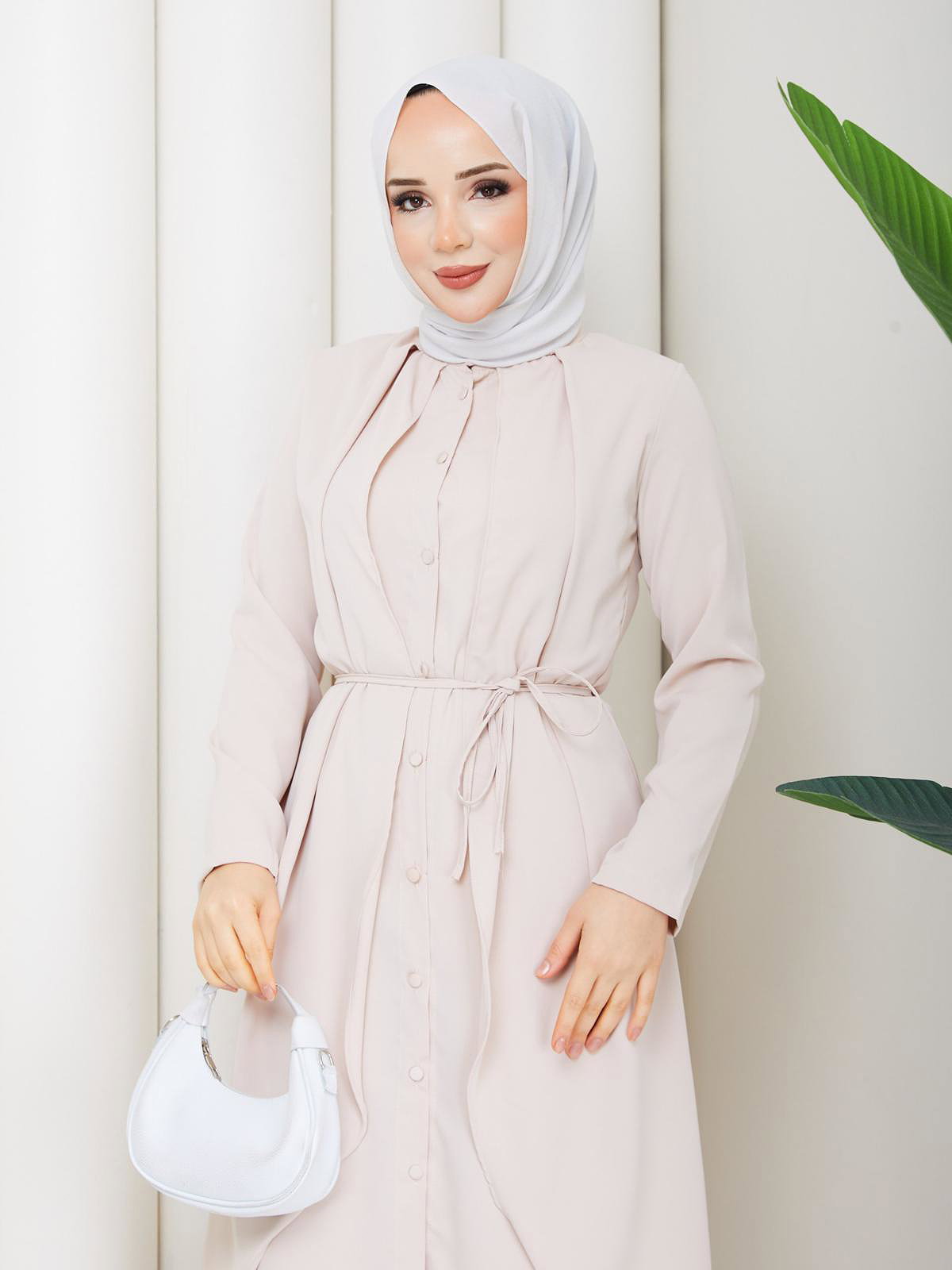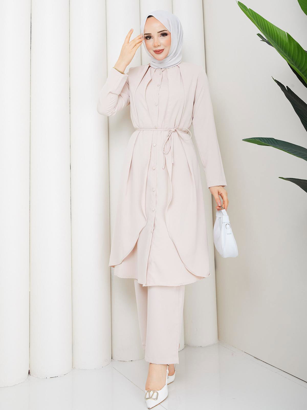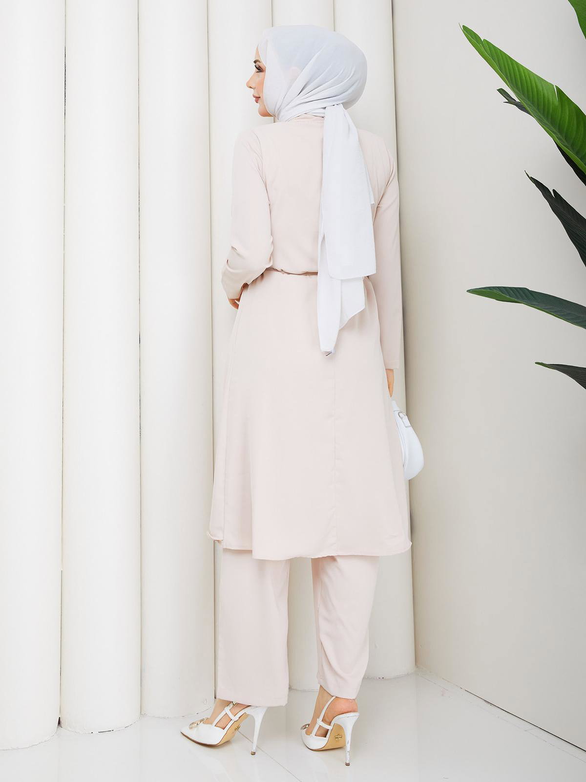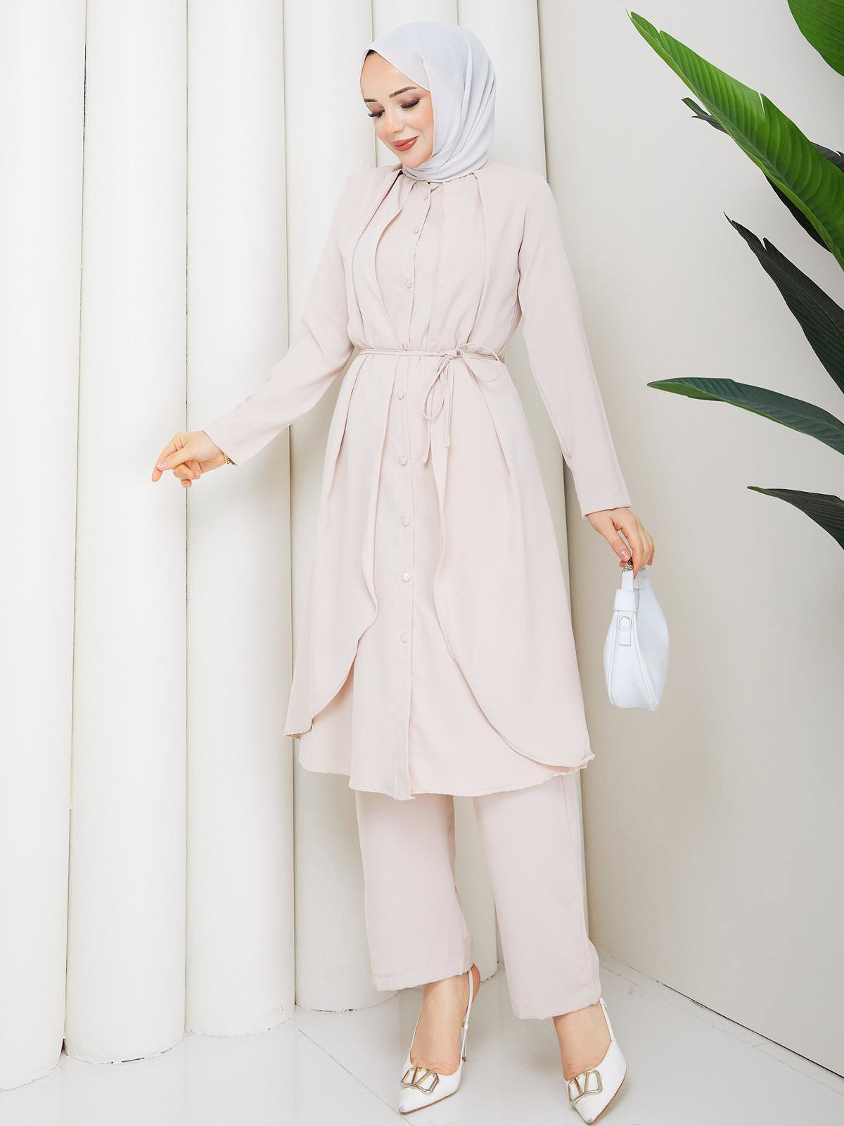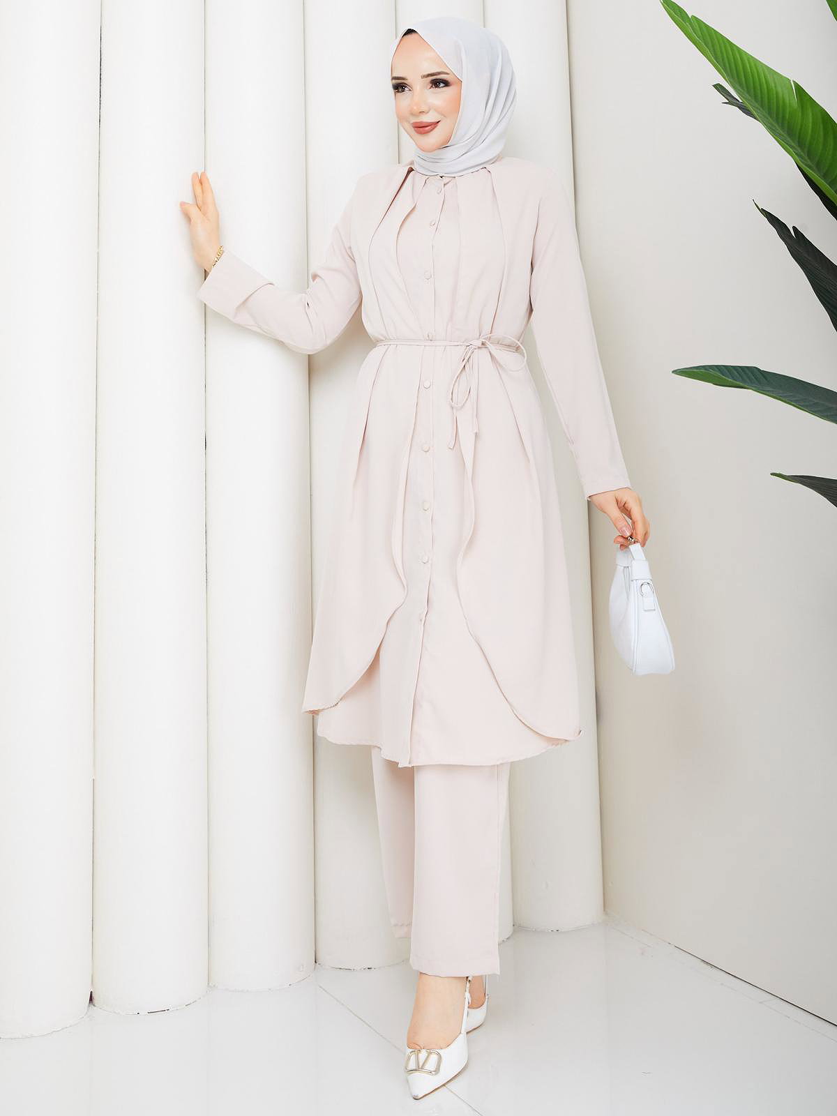 Önden Düğmeli İkili Tesettür Takım-5182 Krem