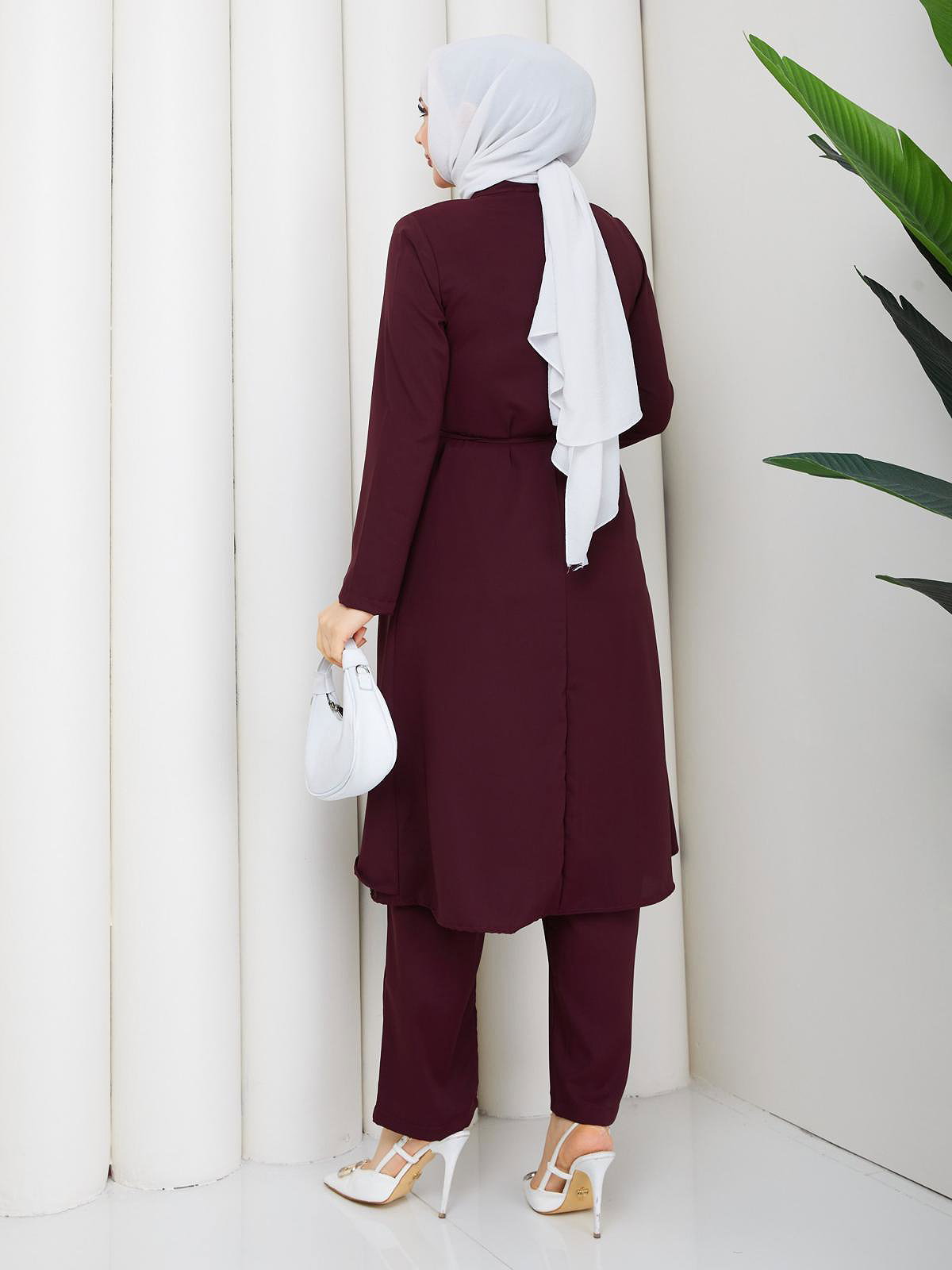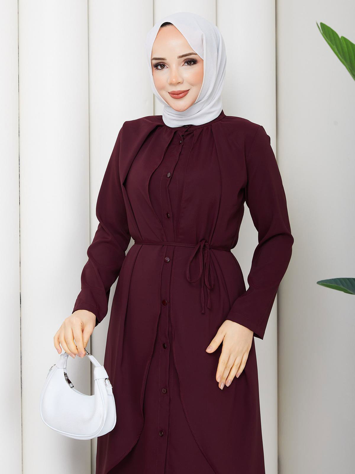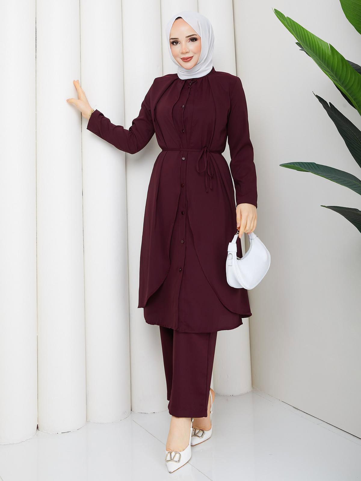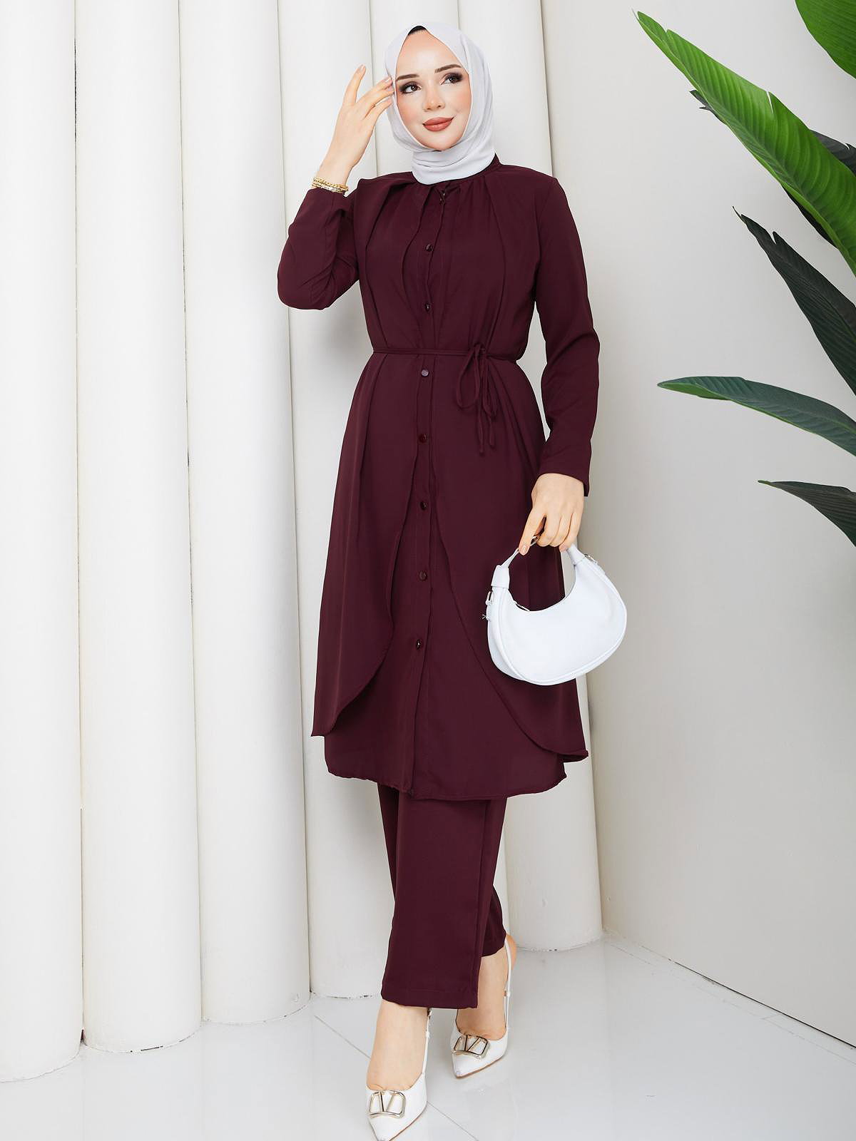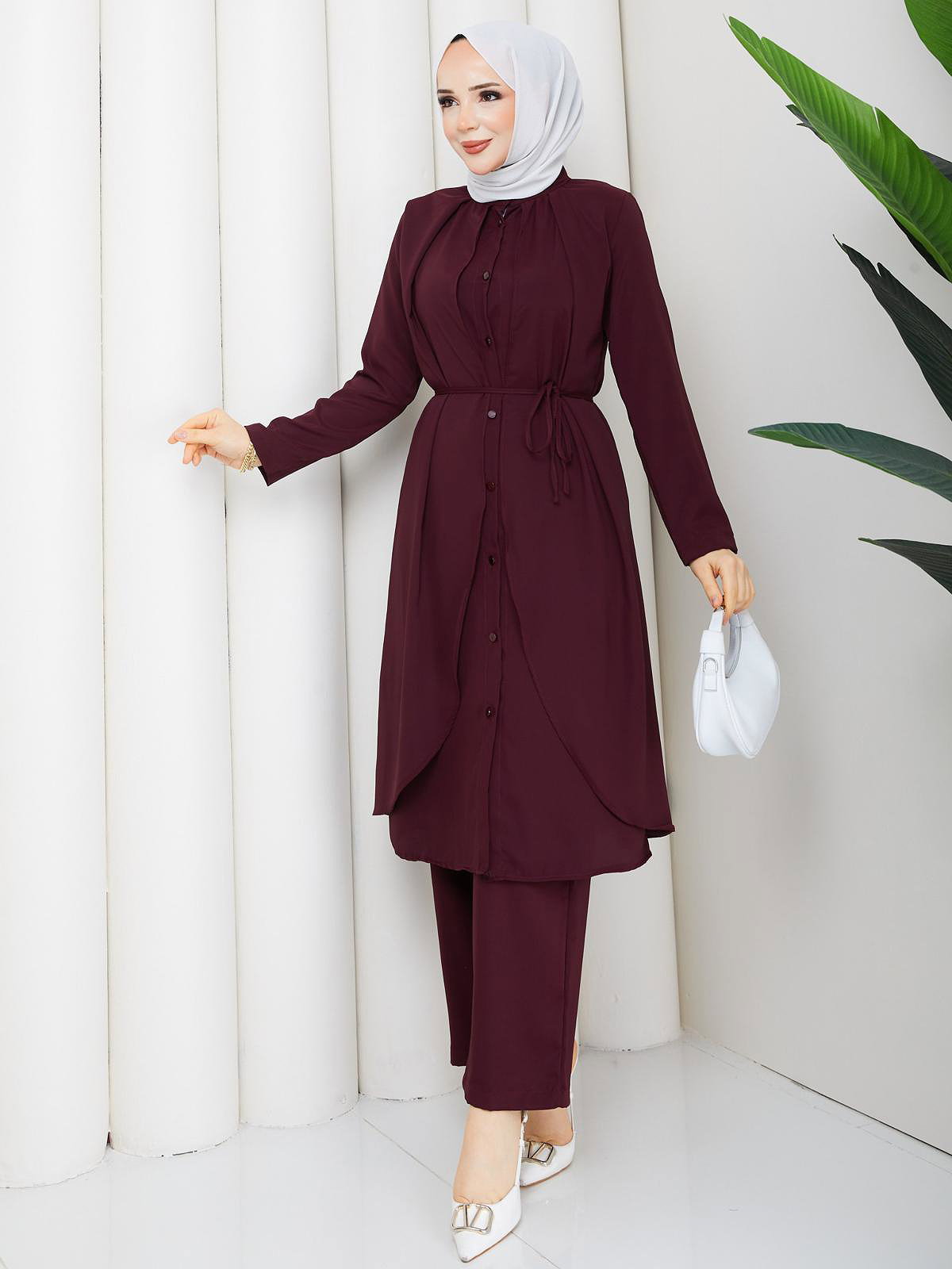 Önden Düğmeli İkili Tesettür Takım-5182 Mürdüm