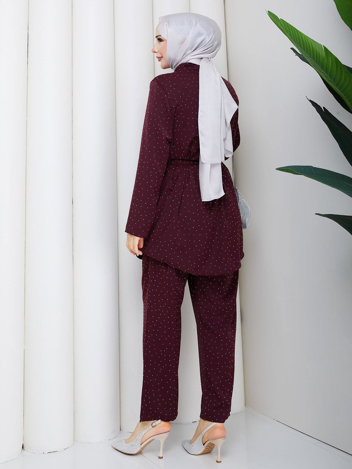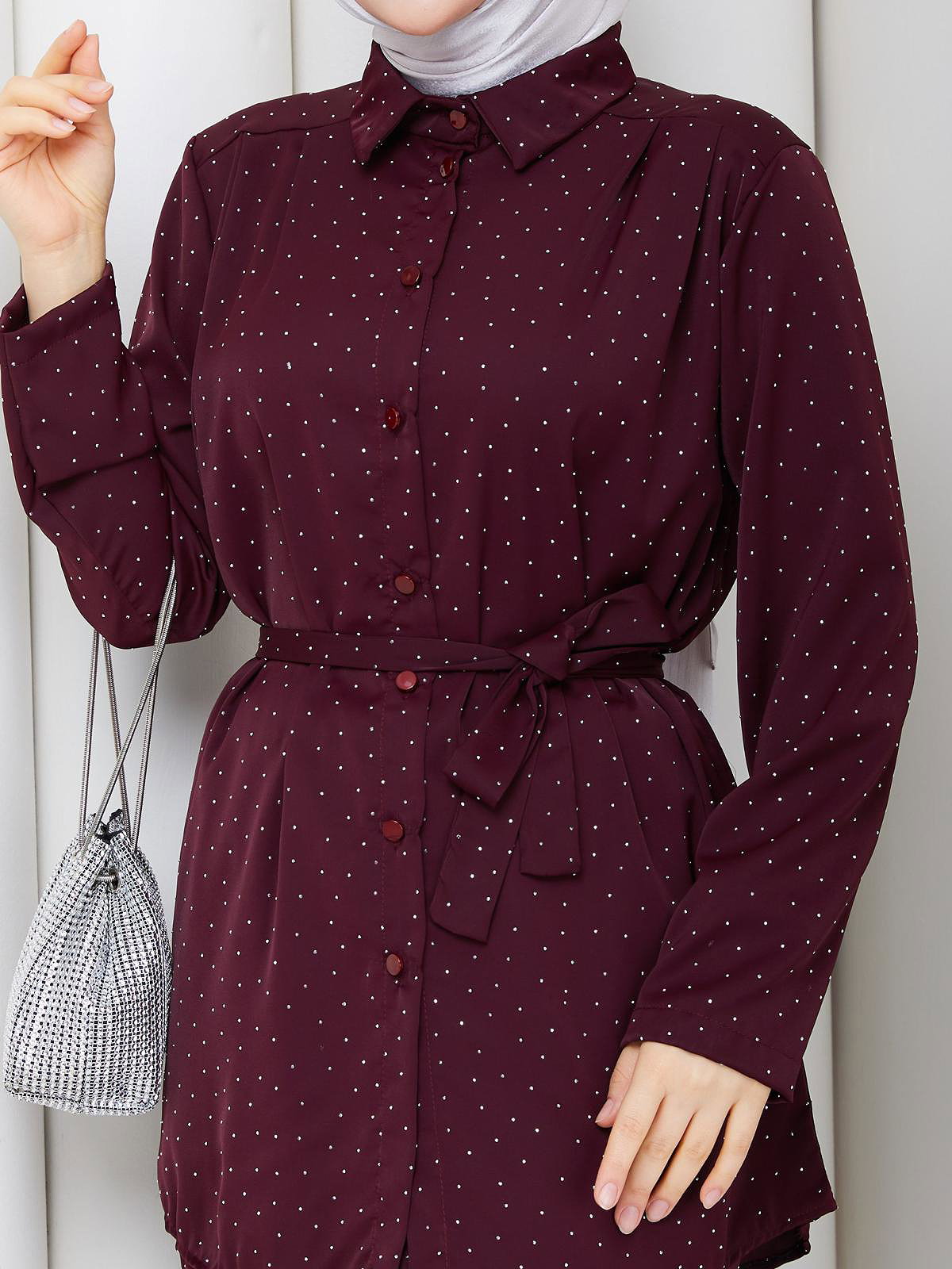 Önden Düğmeli Taşlı İkili Takım-5192 Bordo