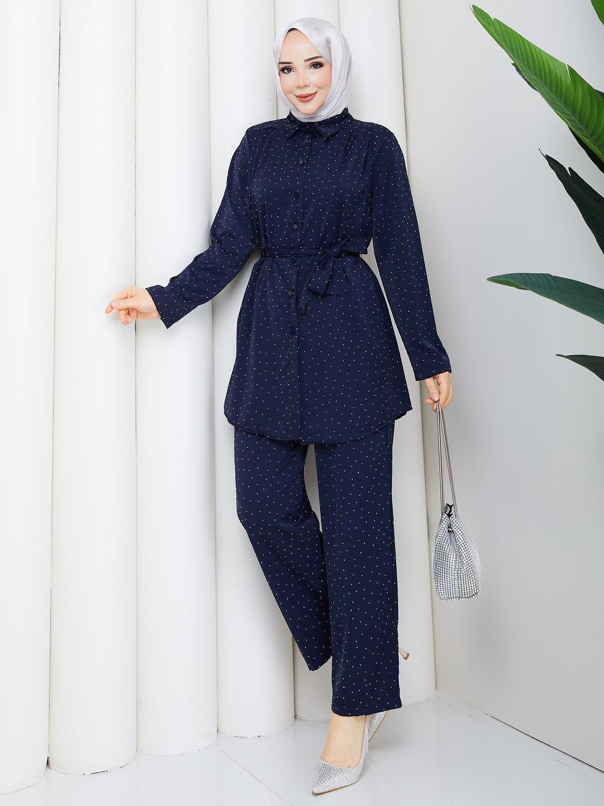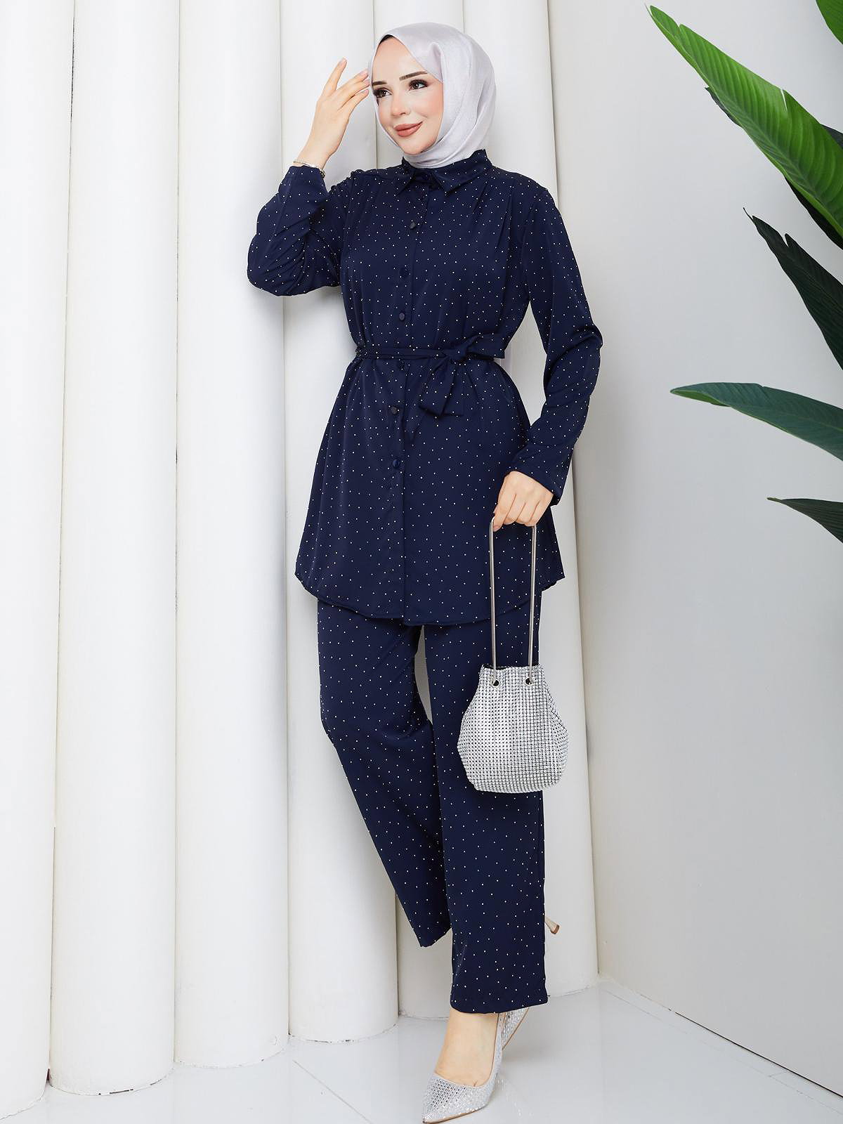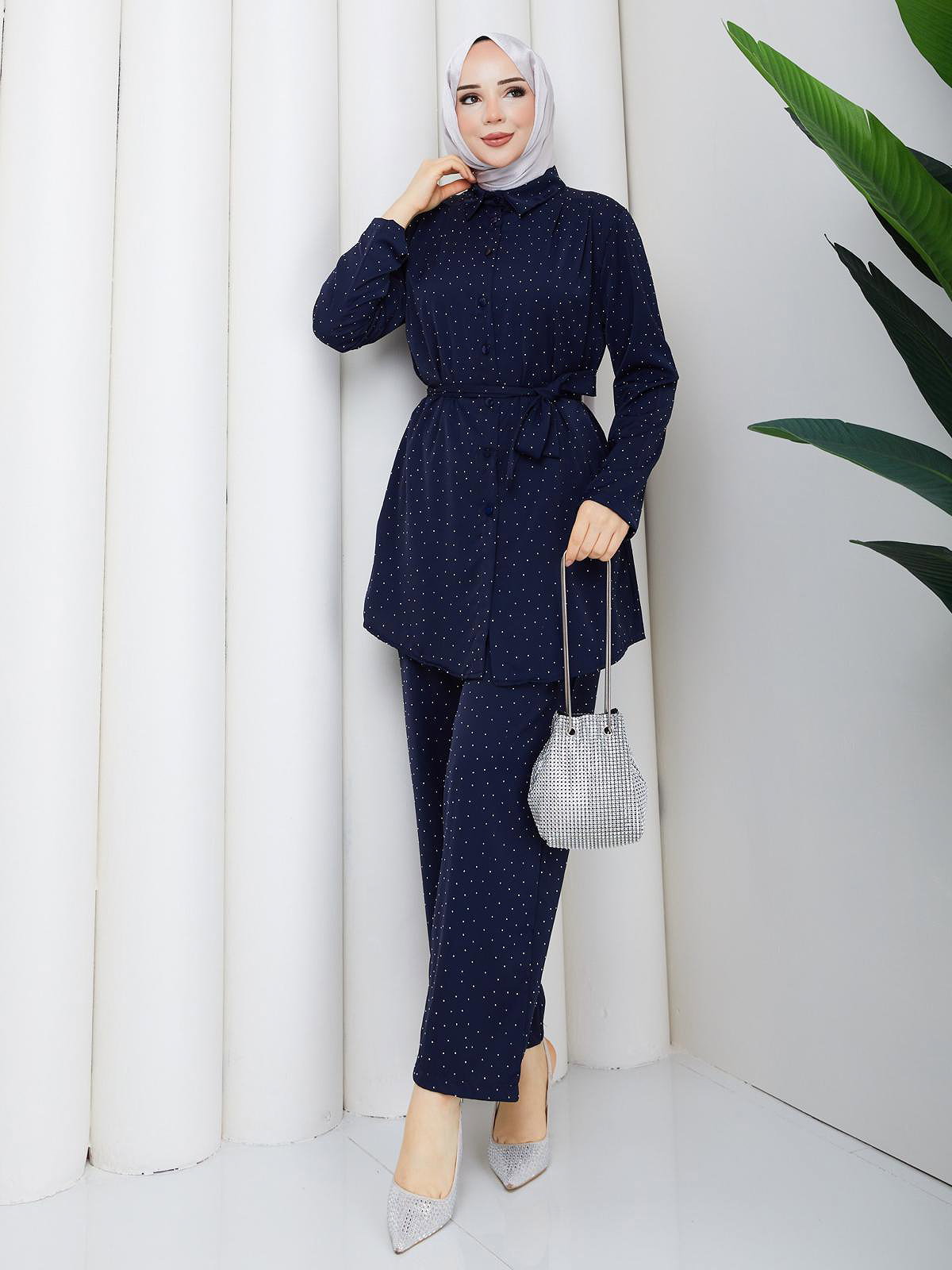 Önden Düğmeli Taşlı İkili Takım-5192 Lacivert