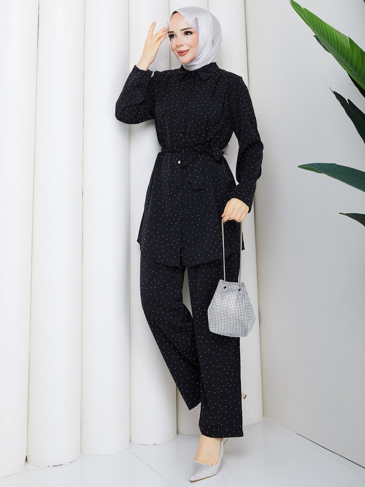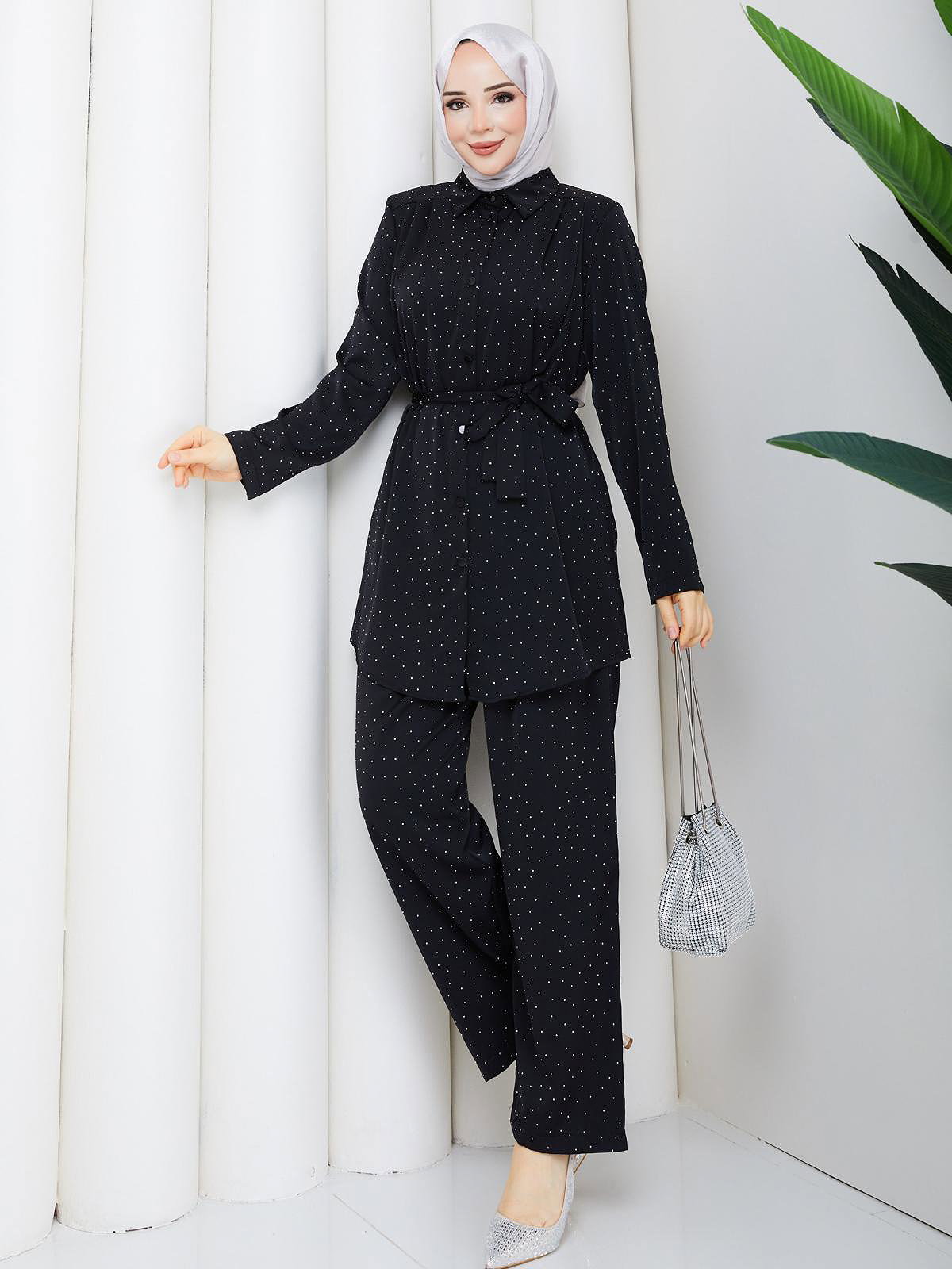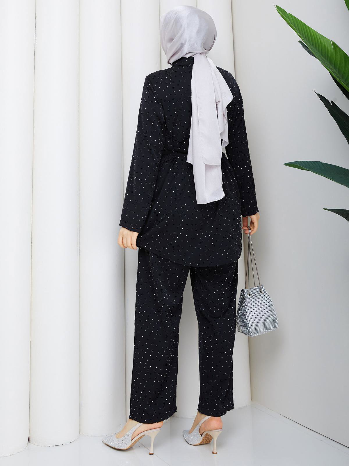 Önden Düğmeli Taşlı İkili Takım-5192 Siyah