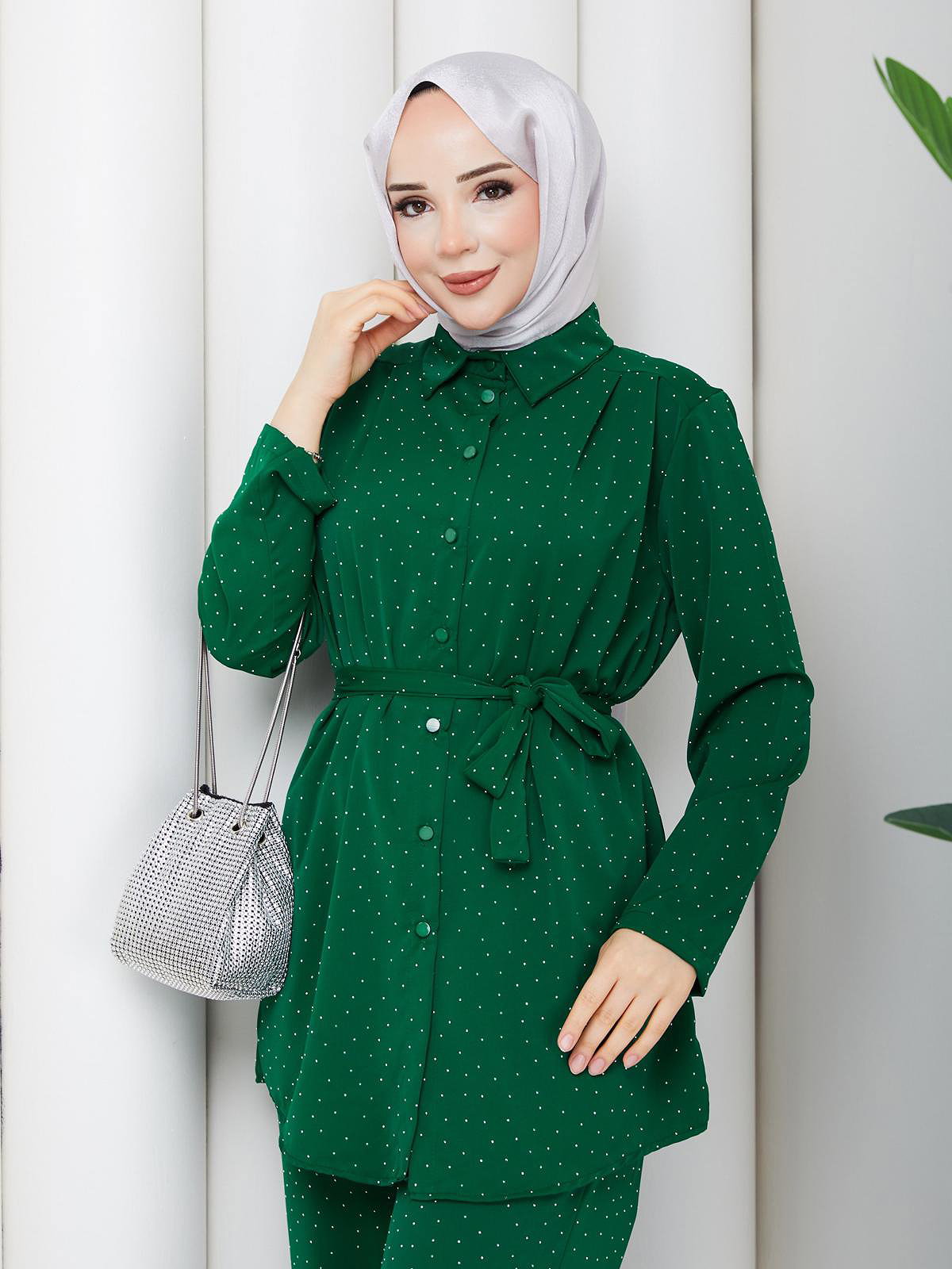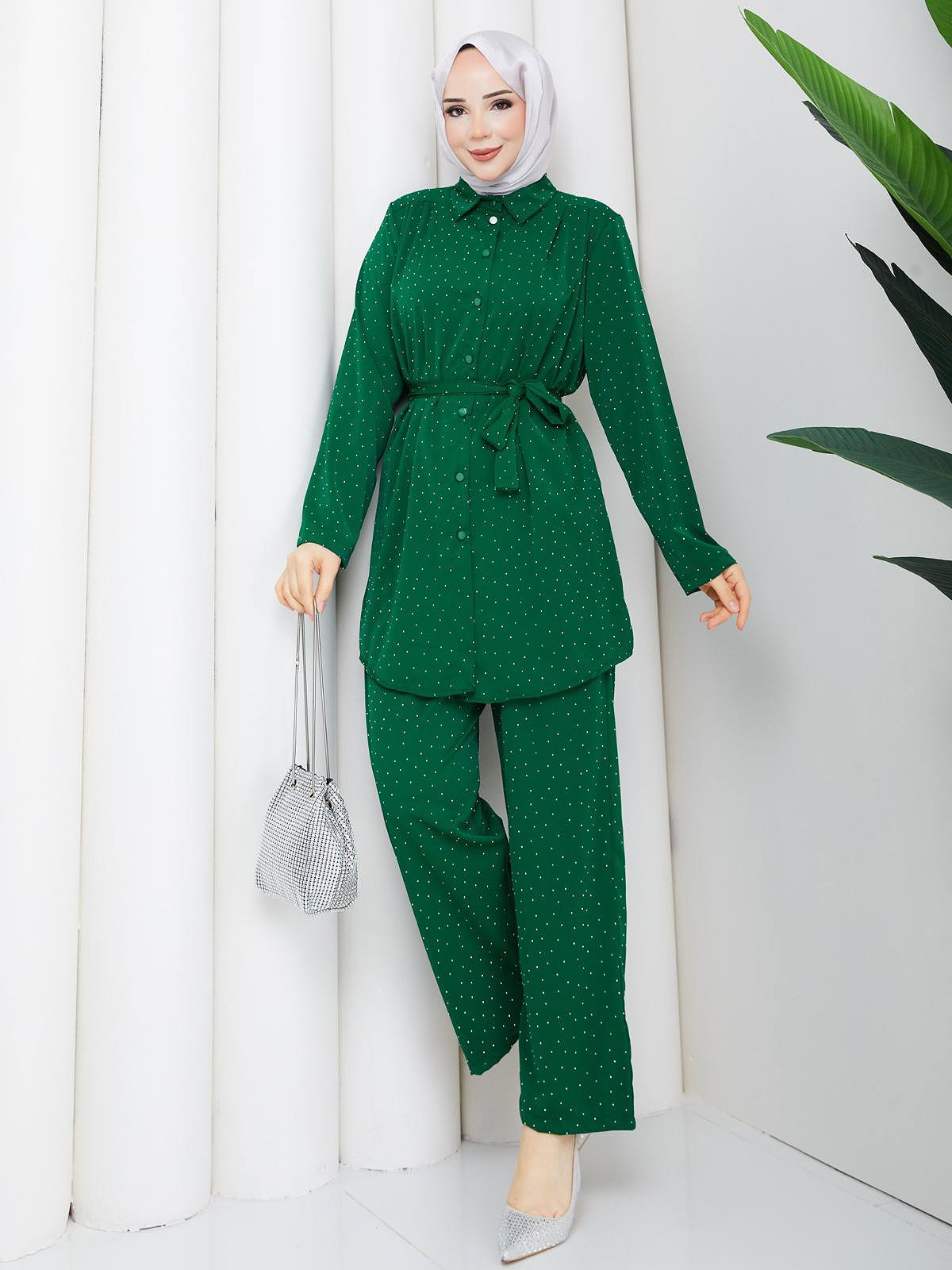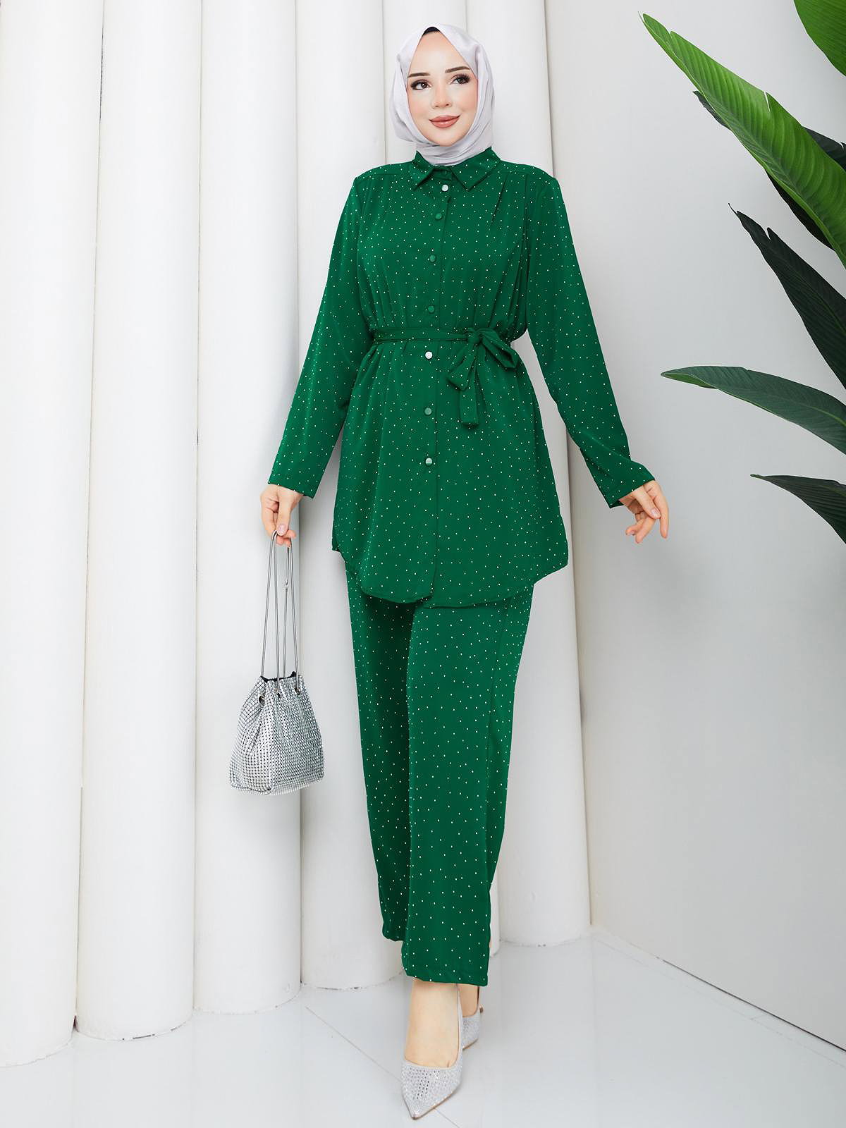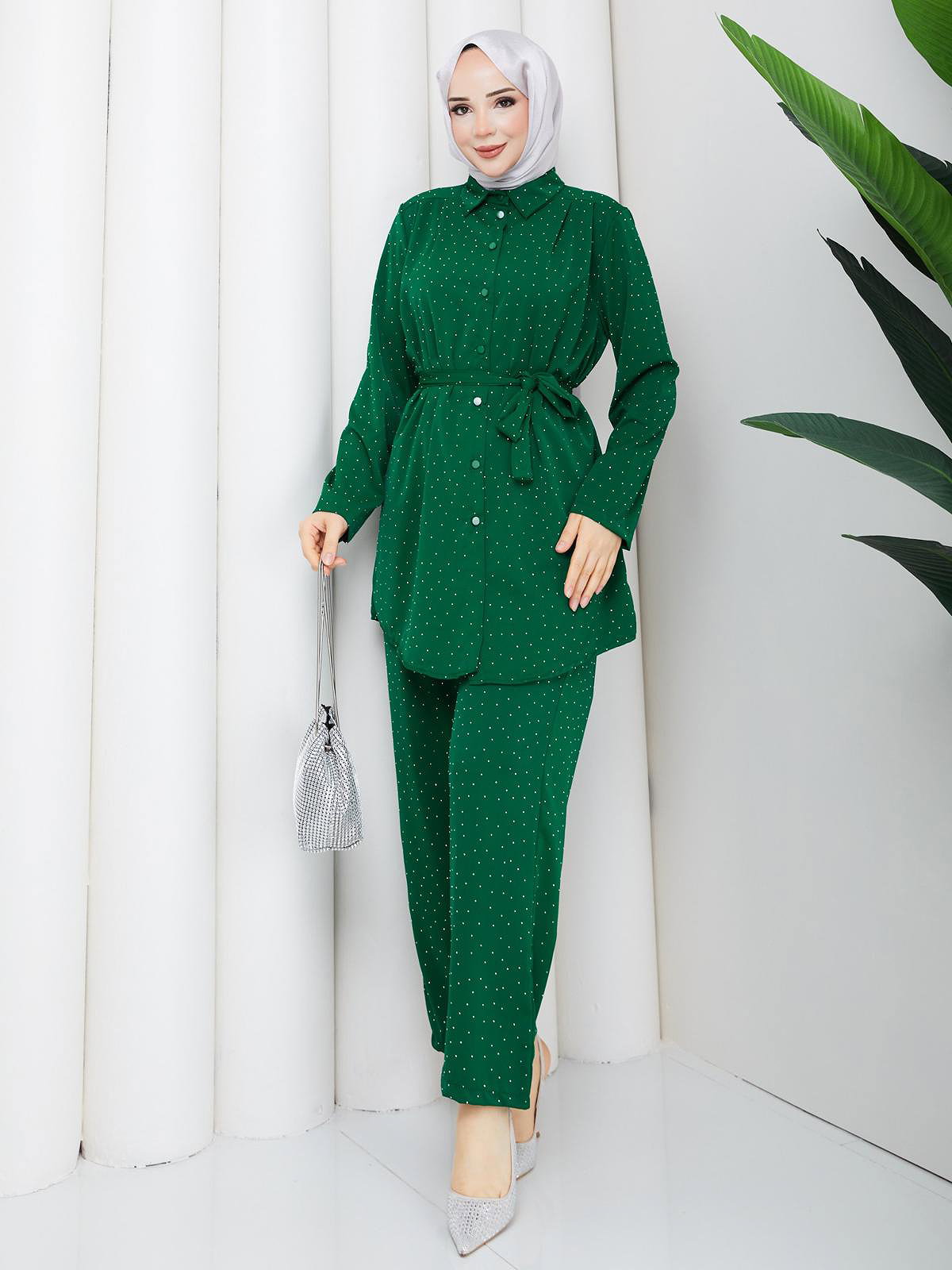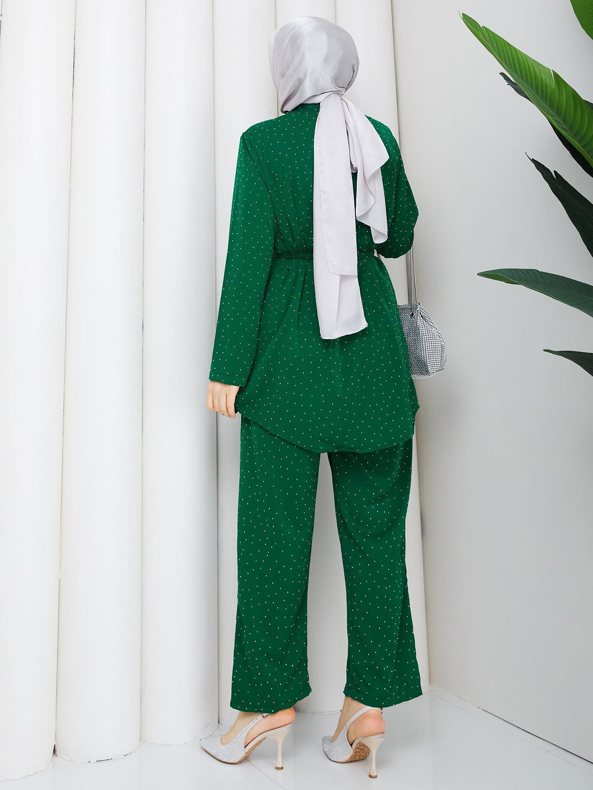 Önden Düğmeli Taşlı İkili Takım-5192 Yeşil