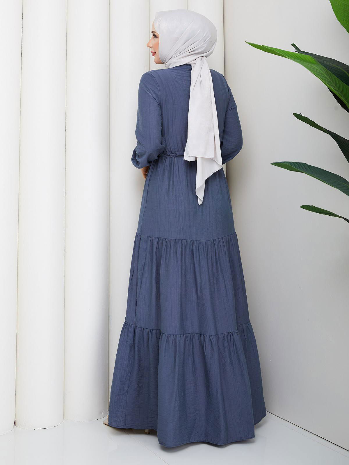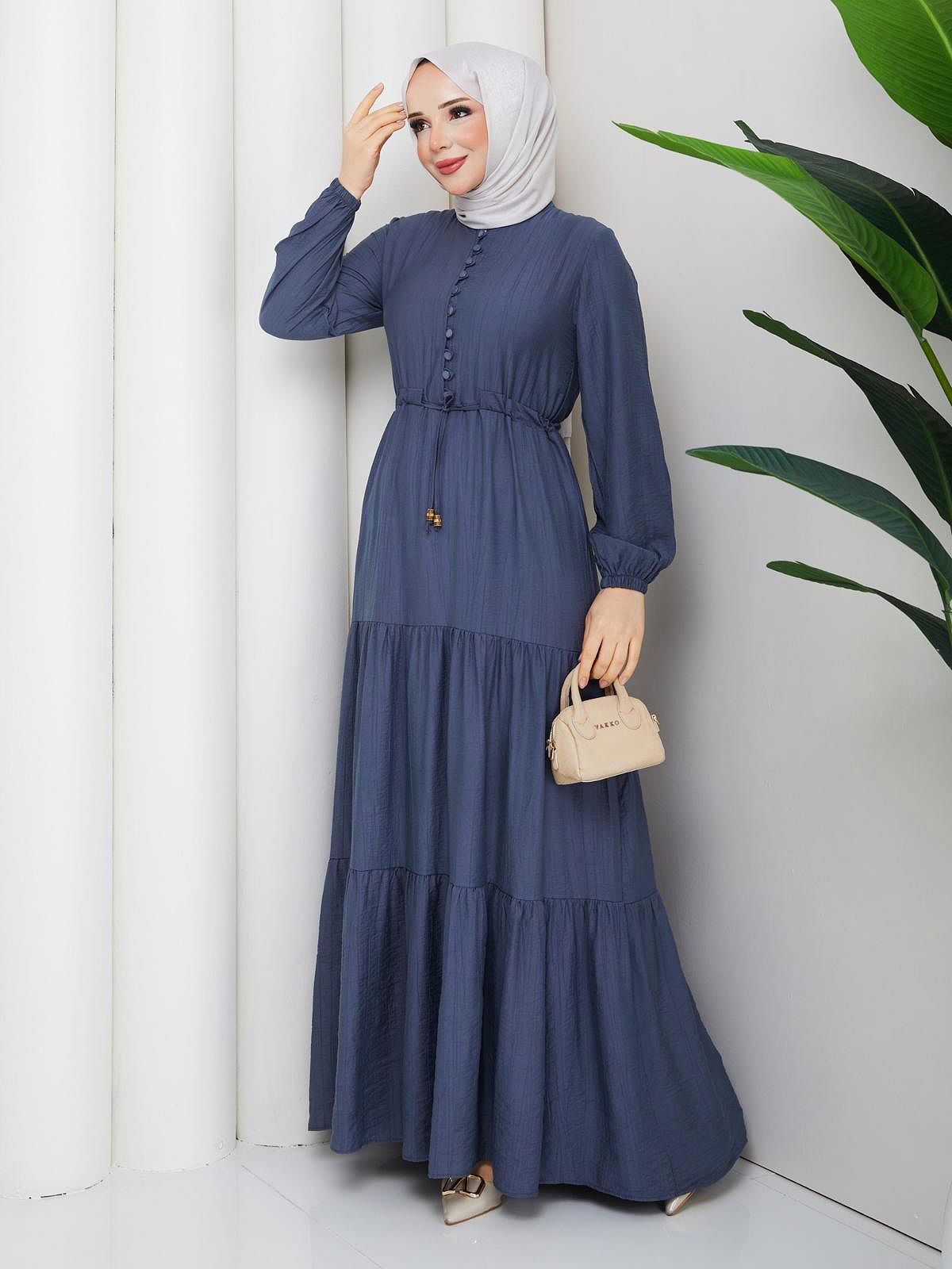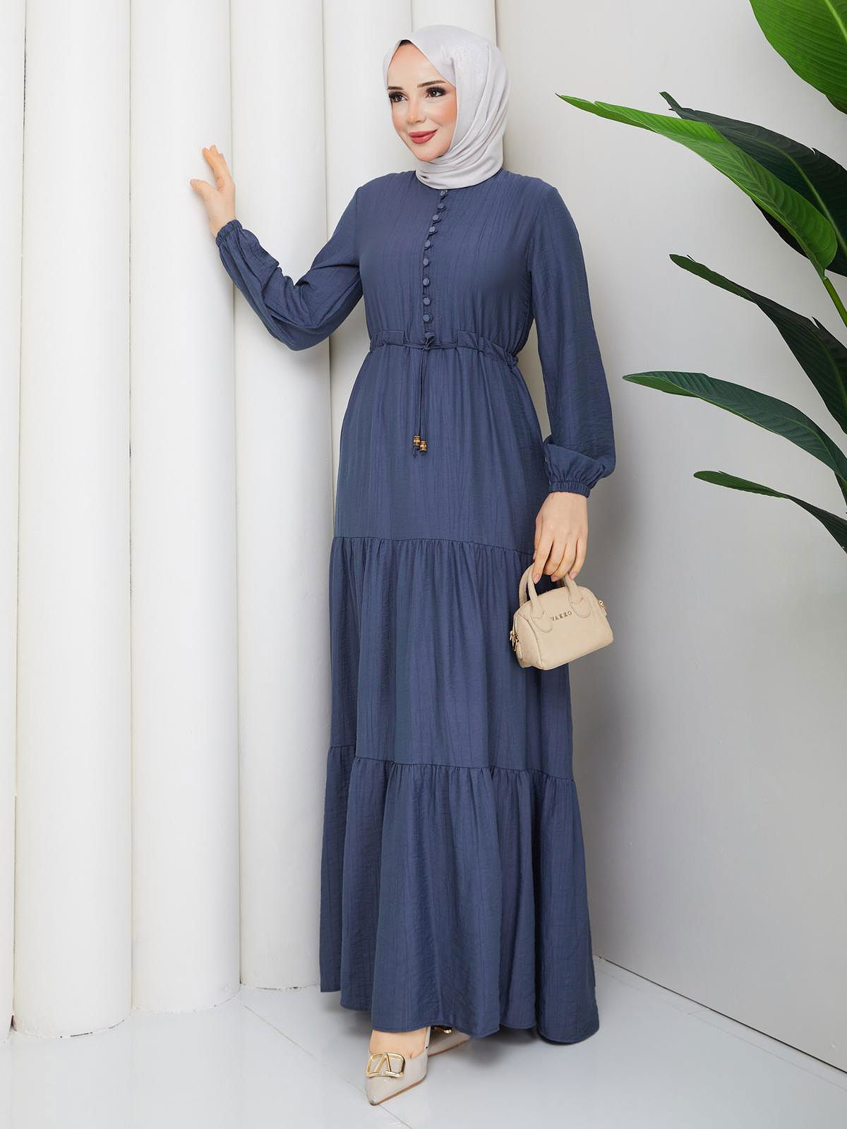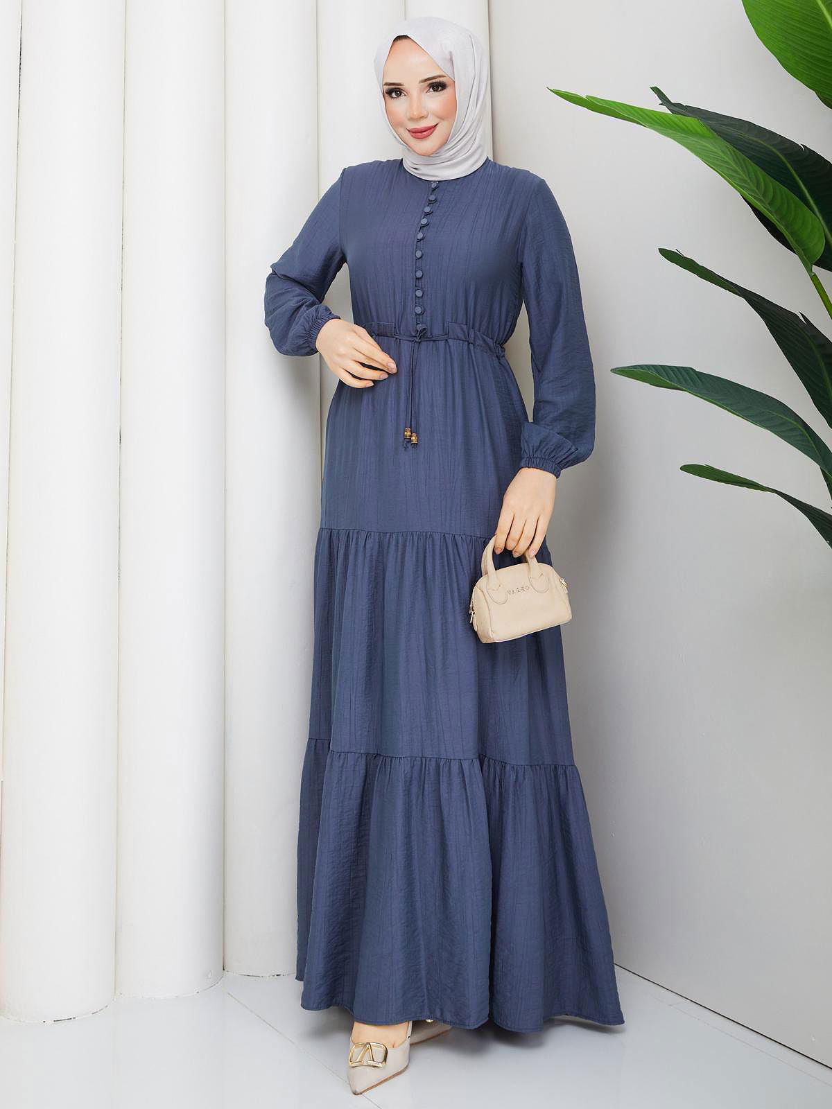 Önden Düğmeli Tesettür Elbise-5140 İndigo