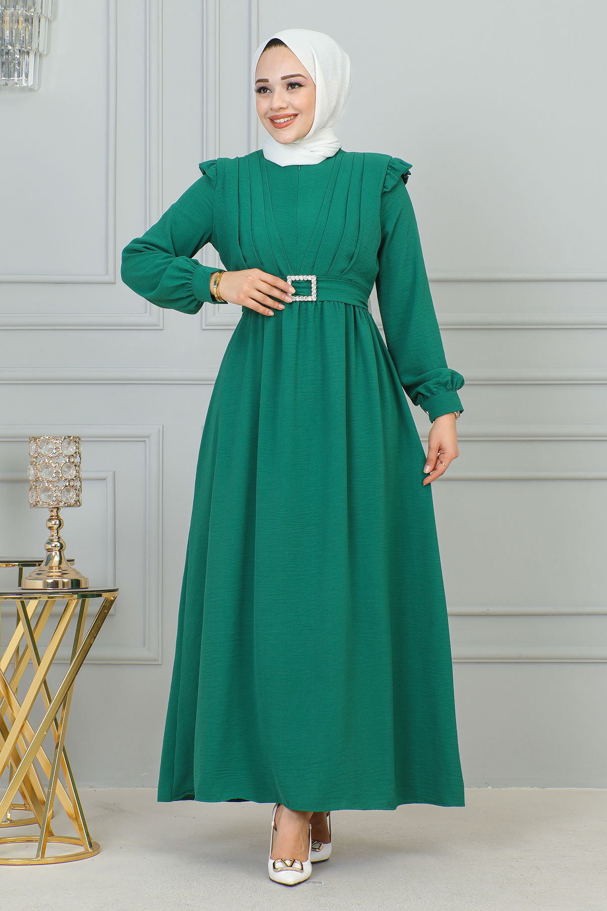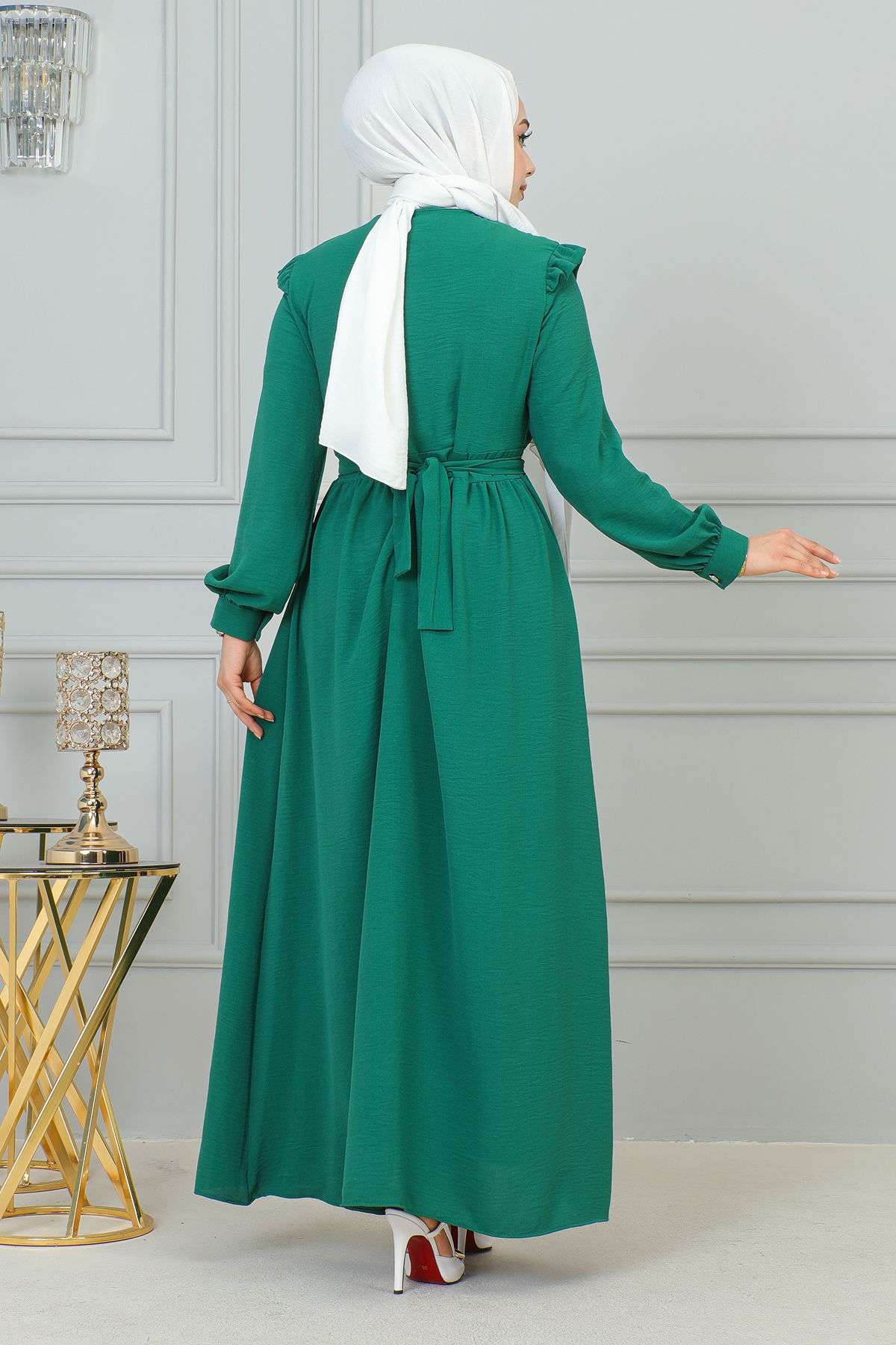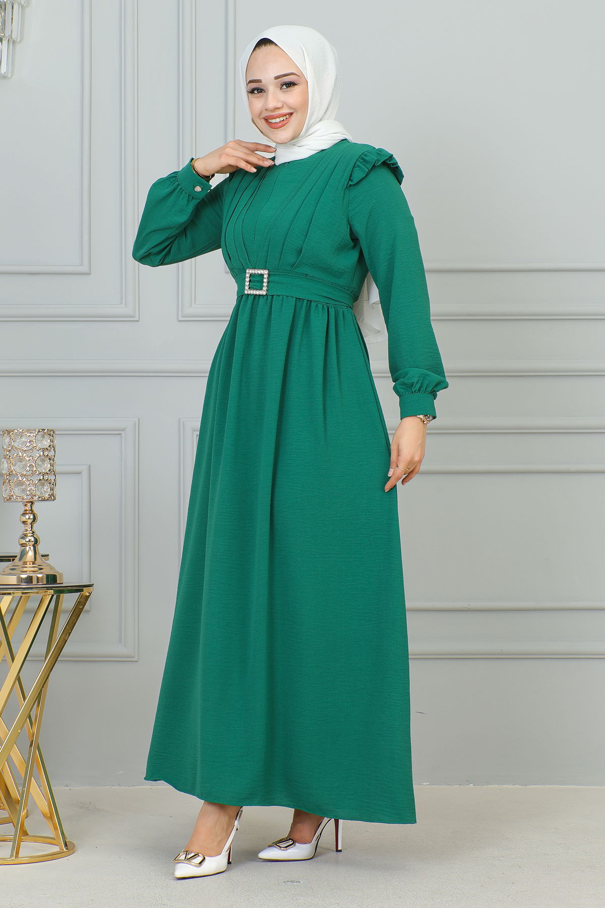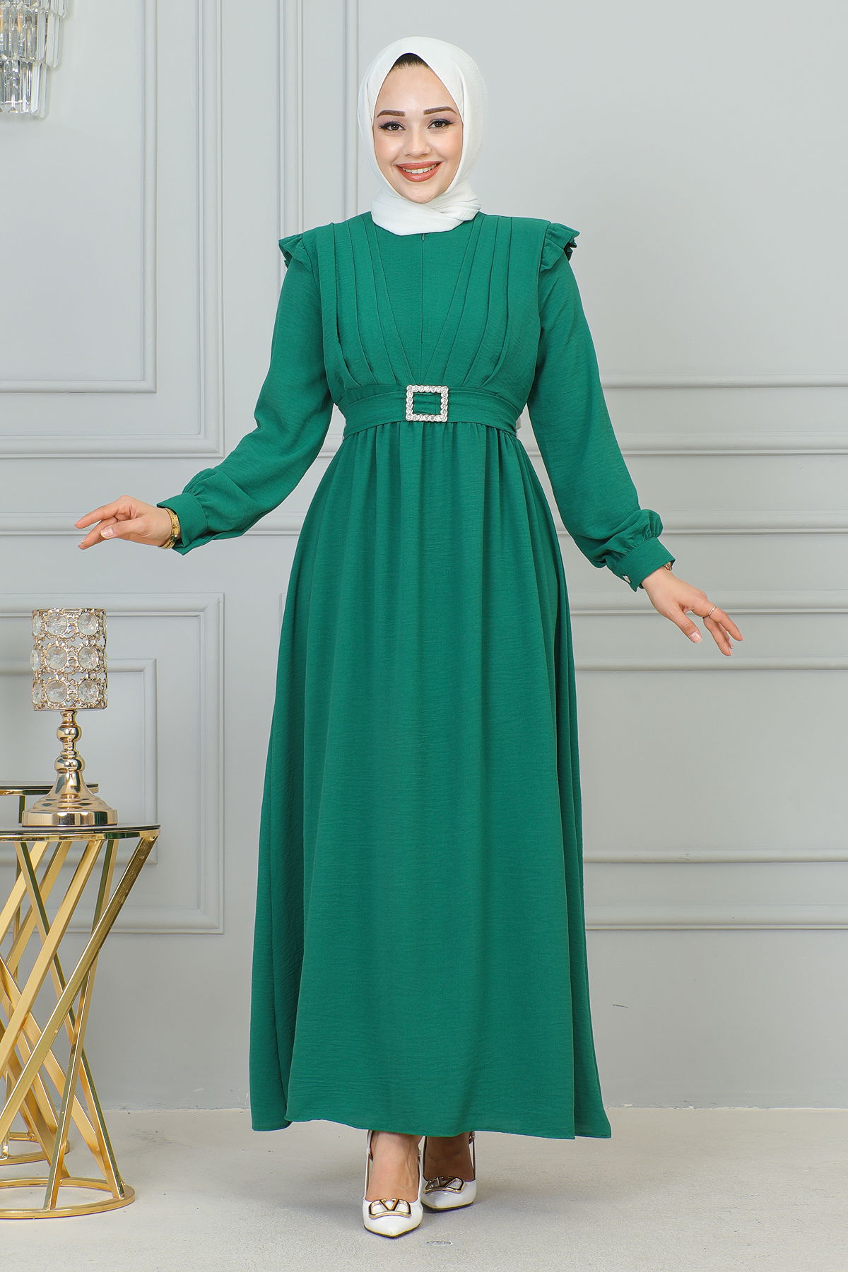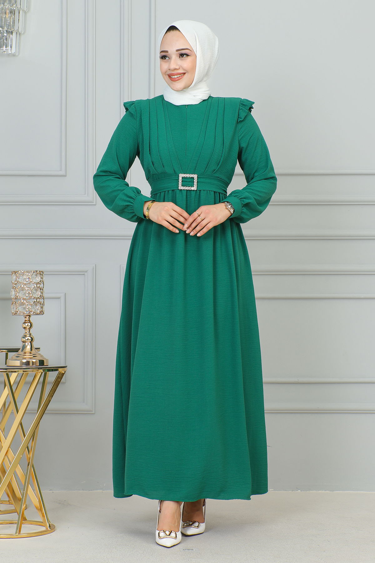 Önden Fermuarlı Kemerli Tesettür Elbise-3184 Yeşil