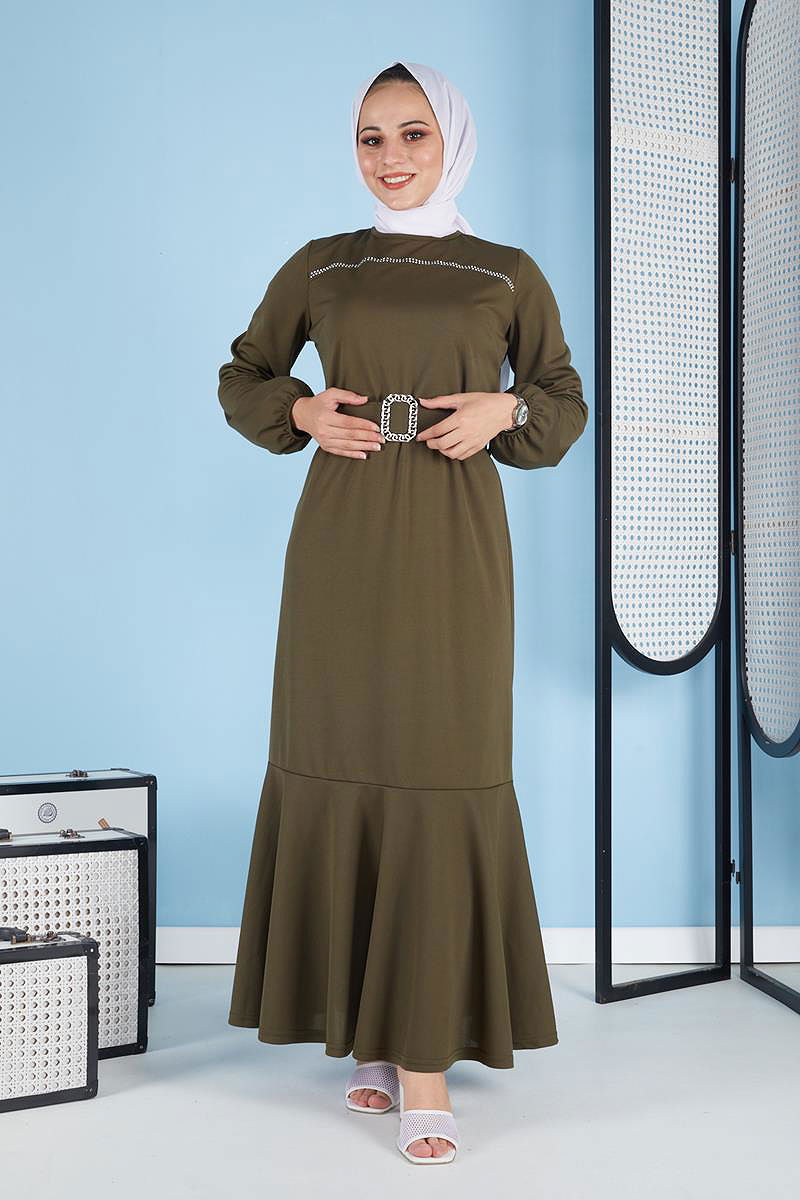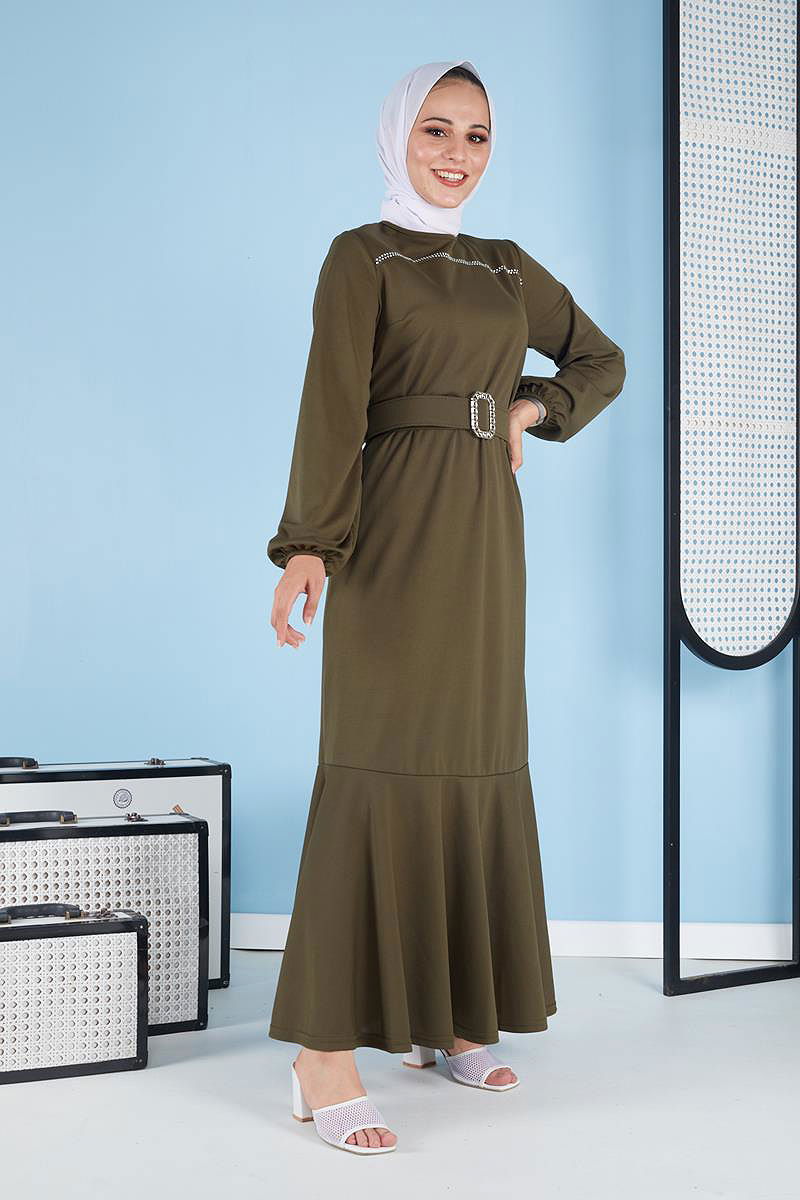 Taş Detaylı Kemerli Tesettür Elbise-3092 Hakiyeşil