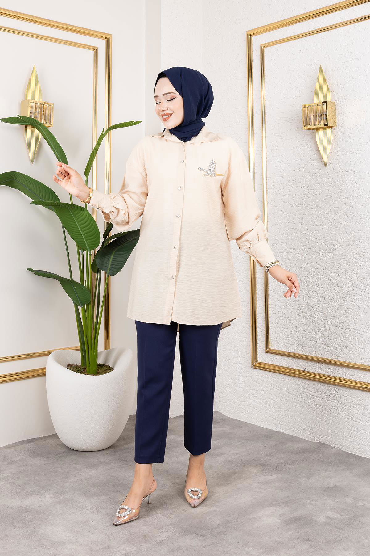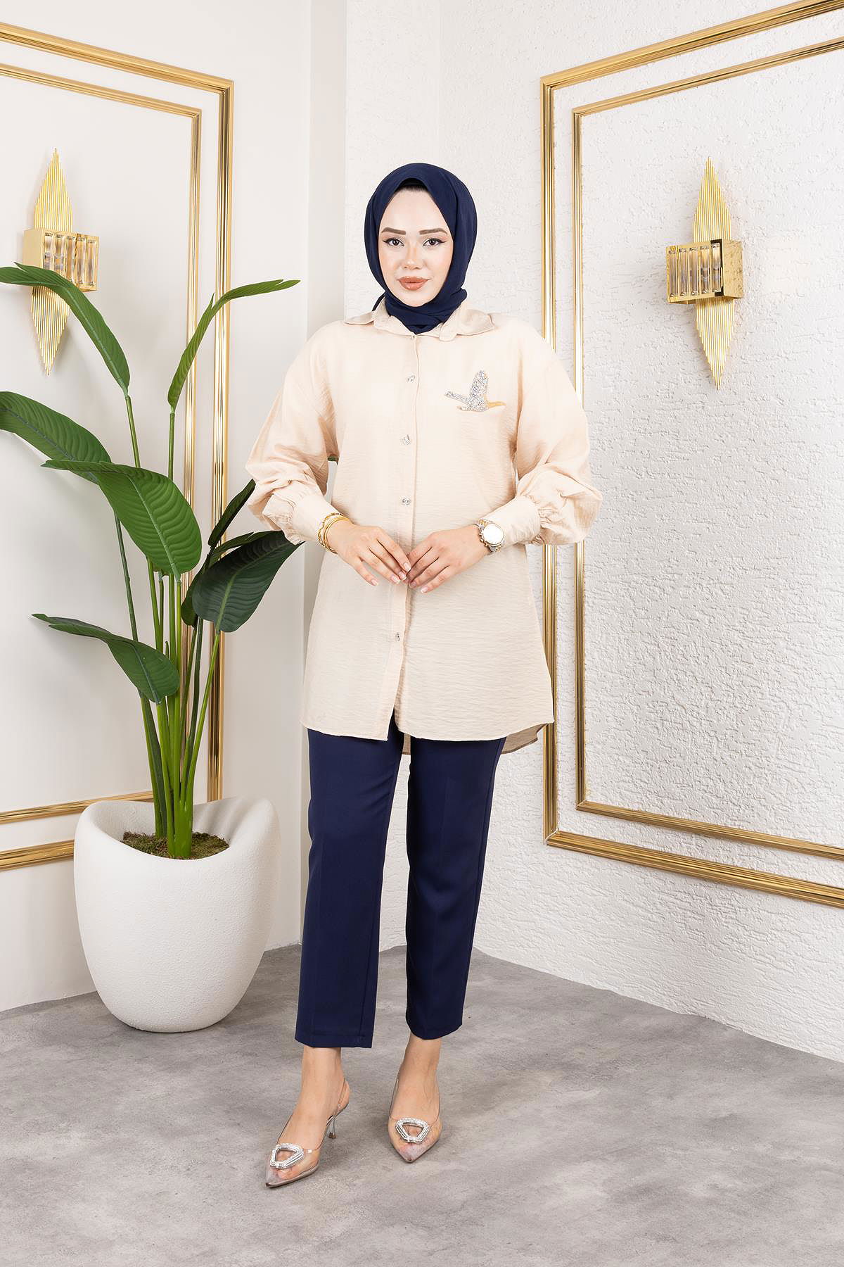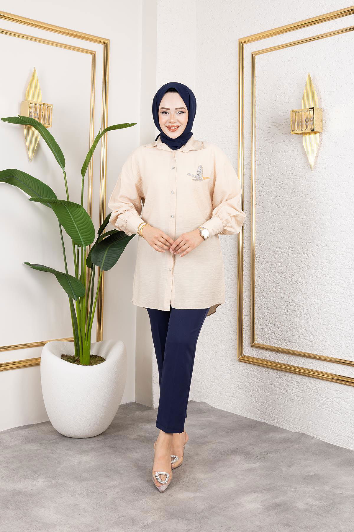 Taş Ve Düğme Detaylı Tunik-5263 Vizon