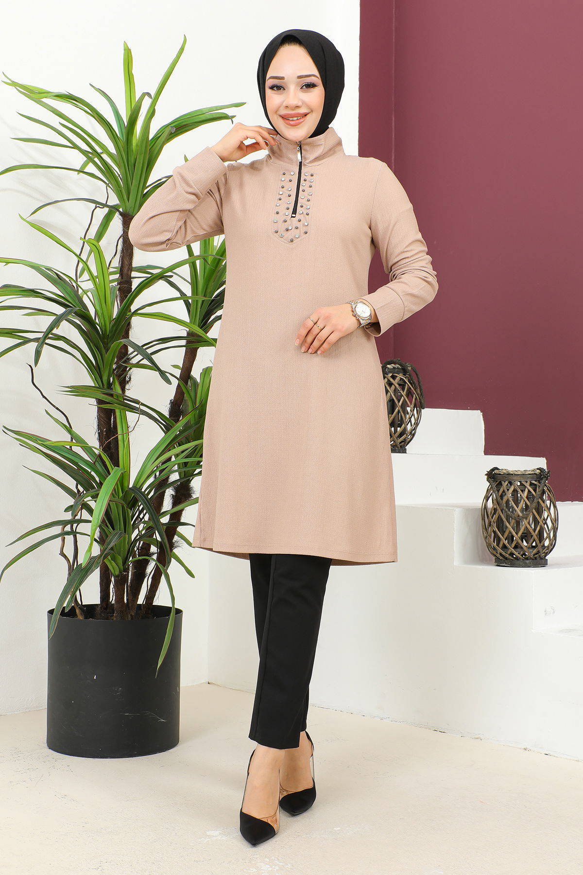 Taş Ve İnci Detaylı Tesettür Tunik-3162 Vizon