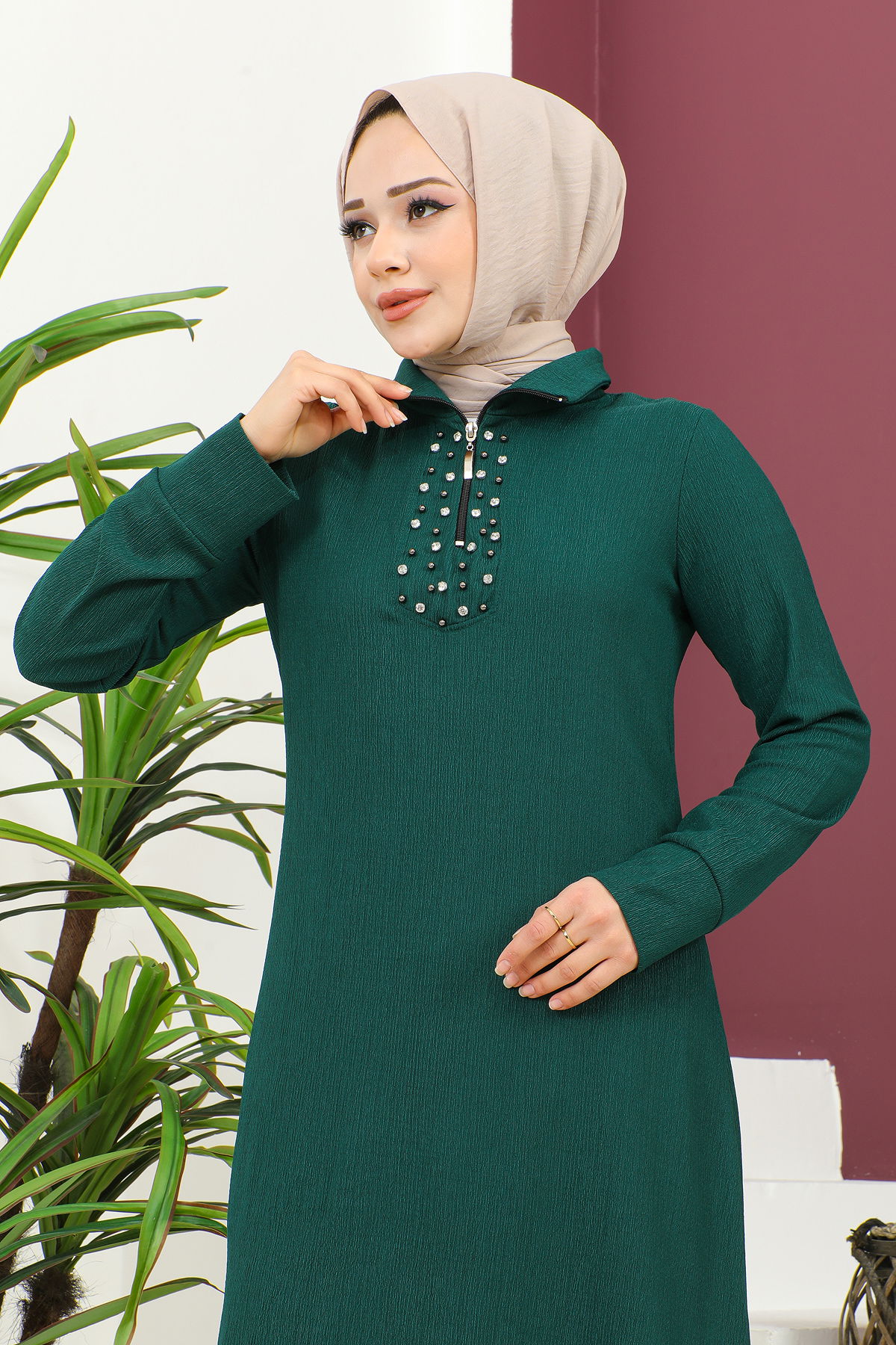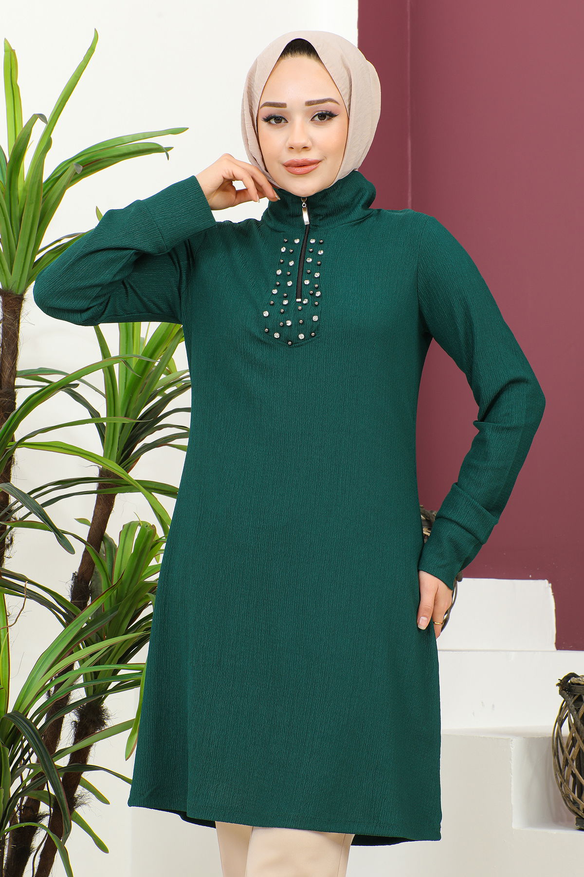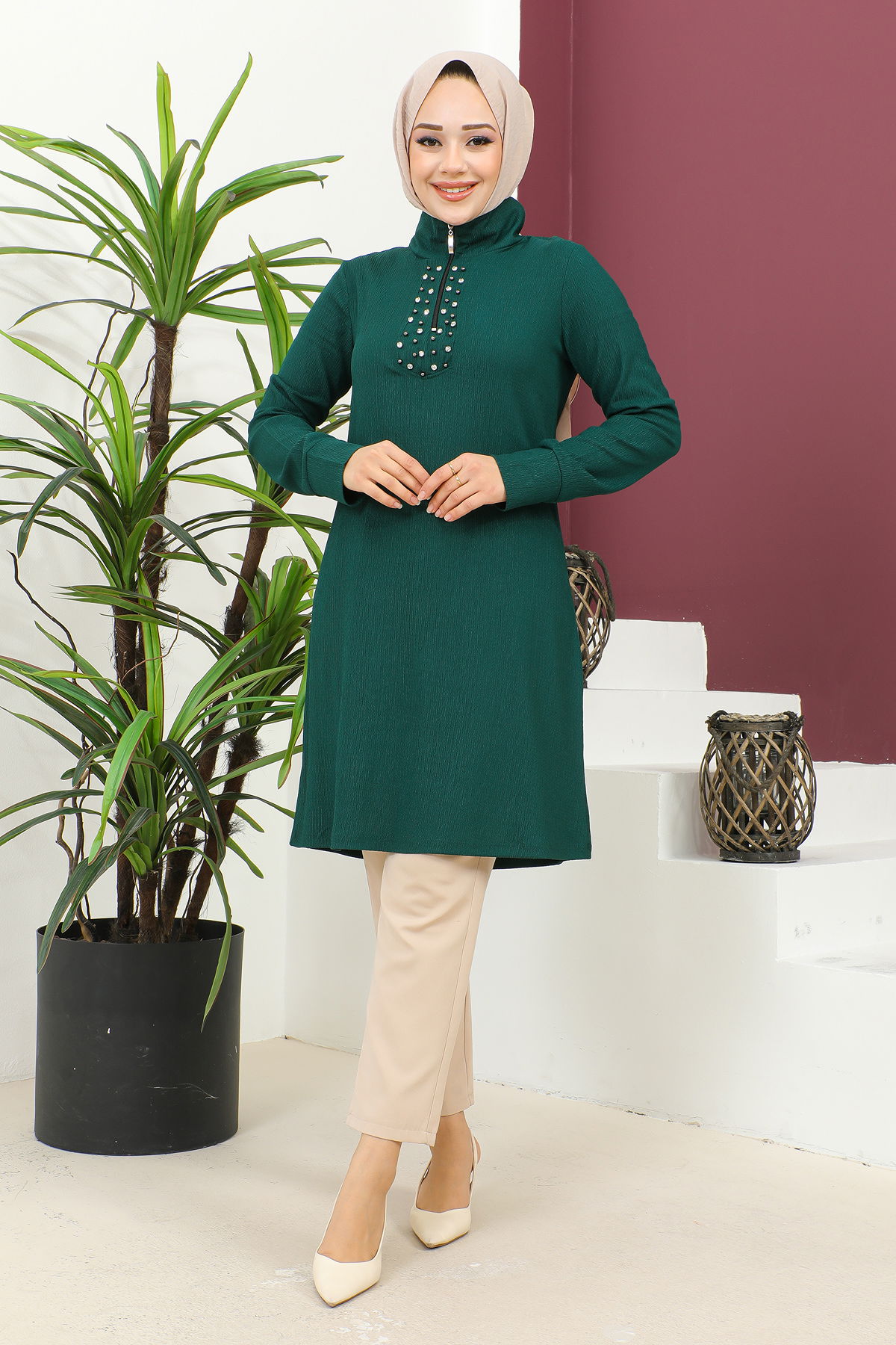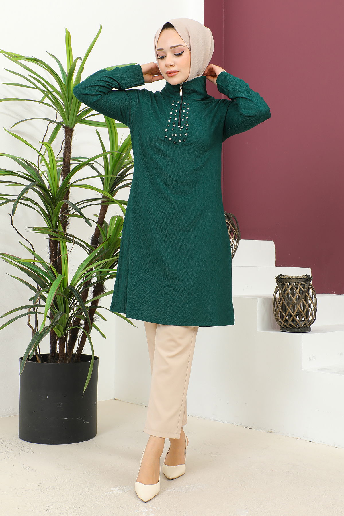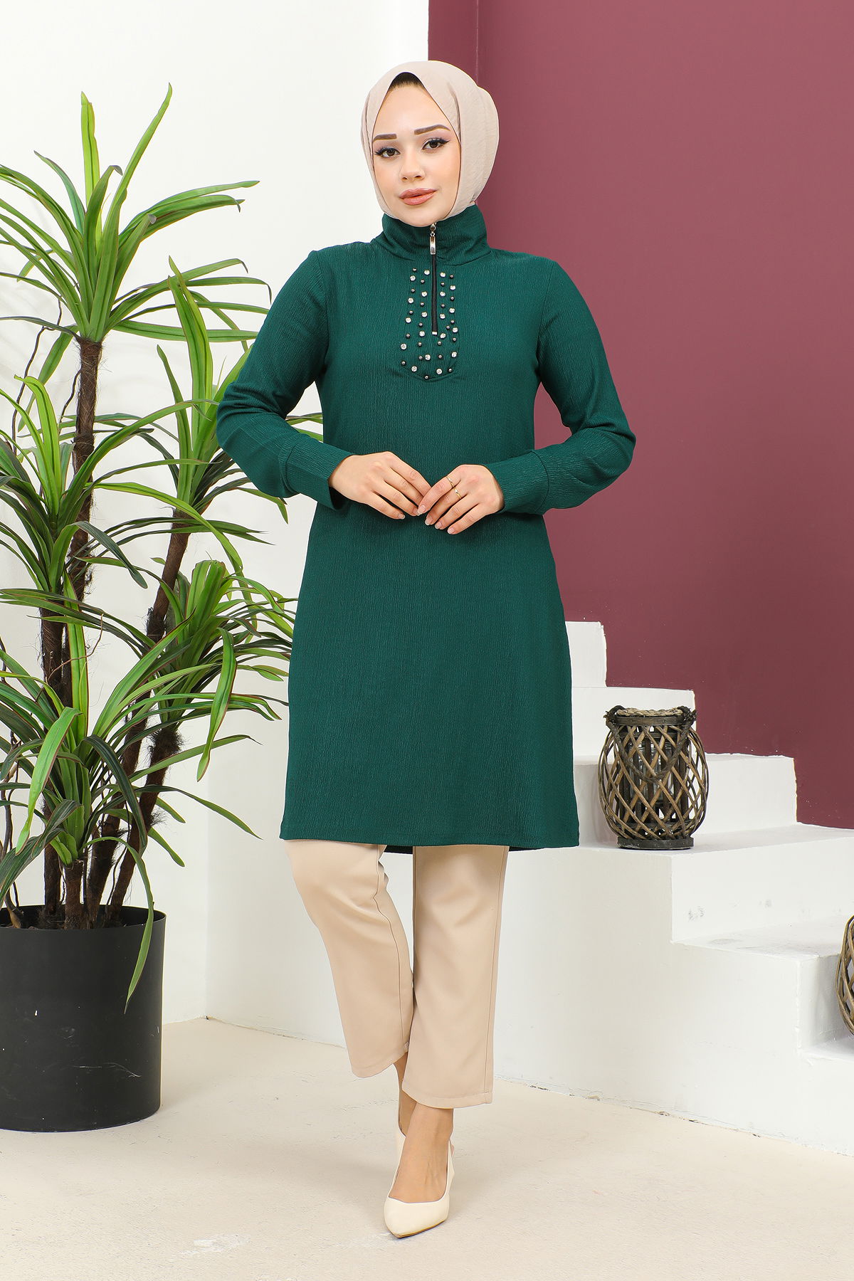 Taş Ve İnci Detaylı Tesettür Tunik-3162 Zümrüt yeşili