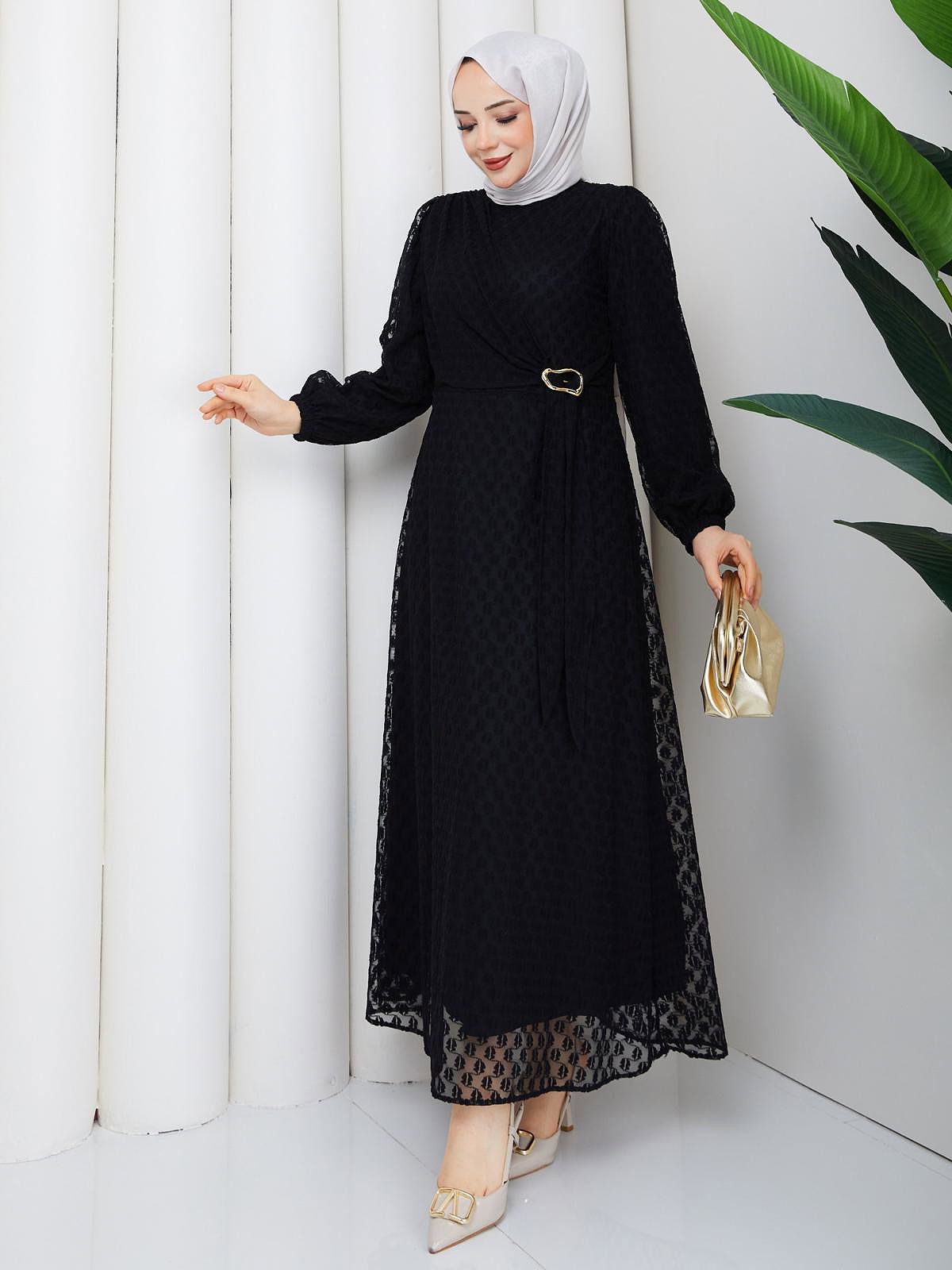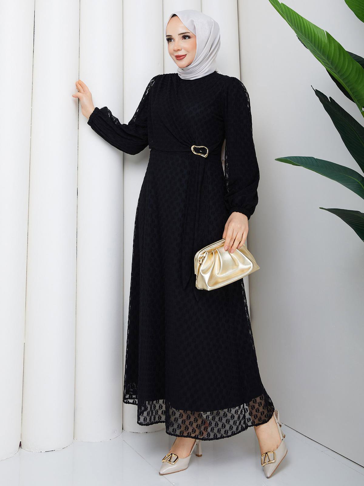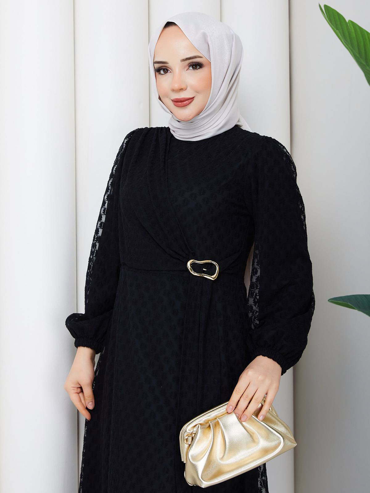 Toka Detaylı Dantel Elbise-5185 Siyah