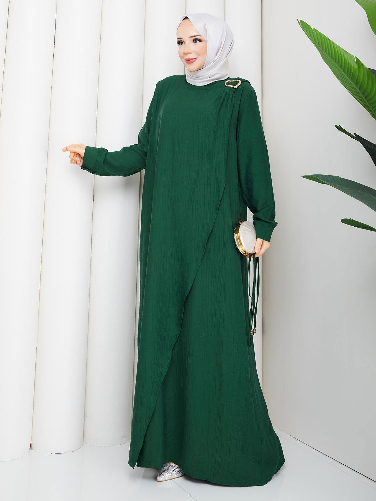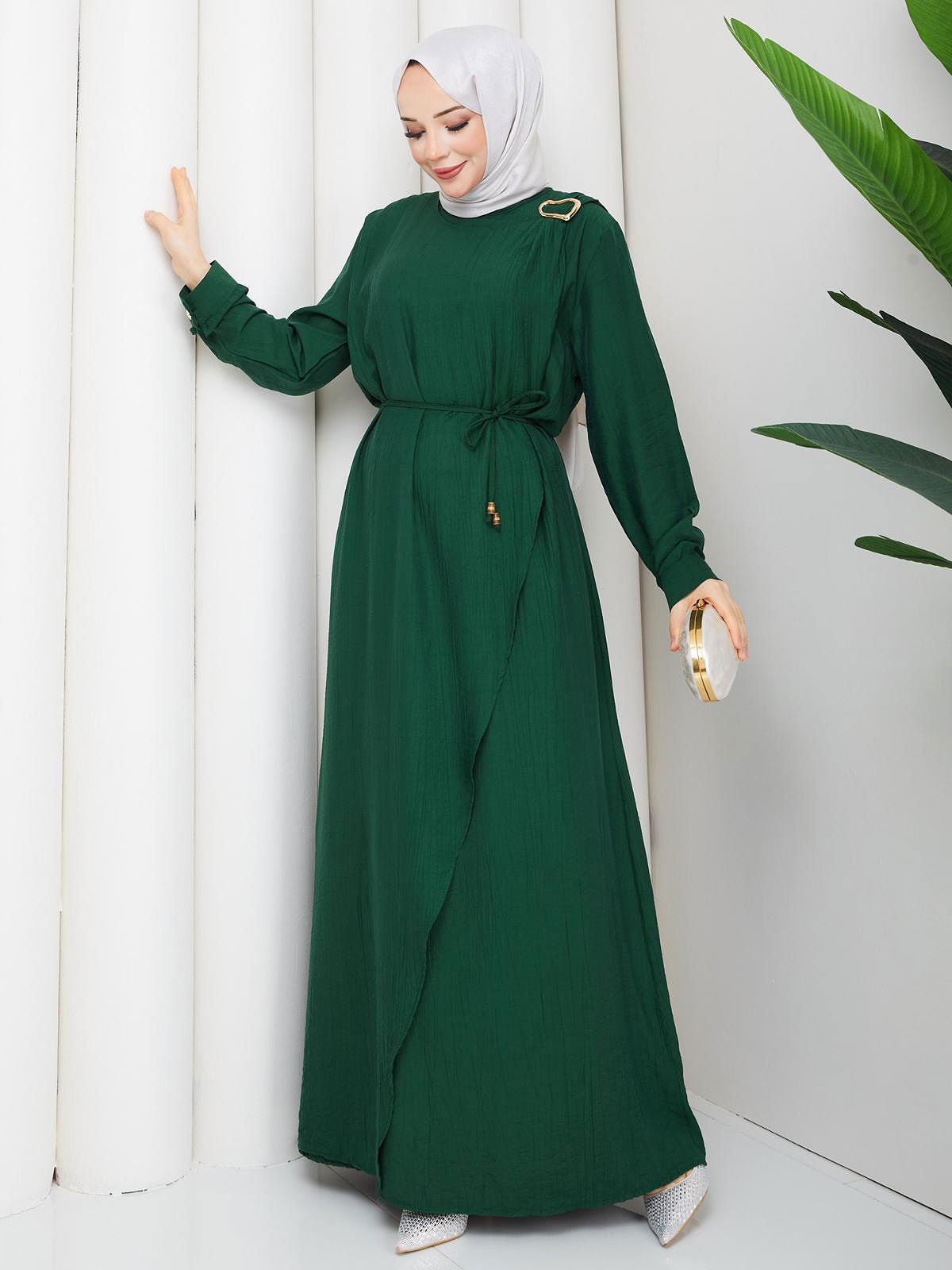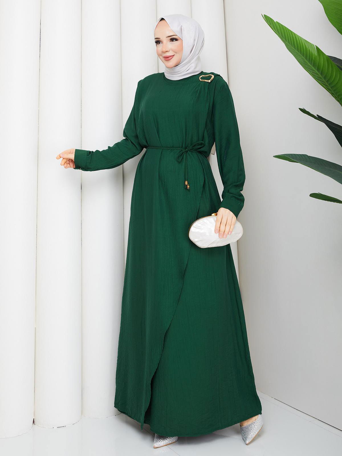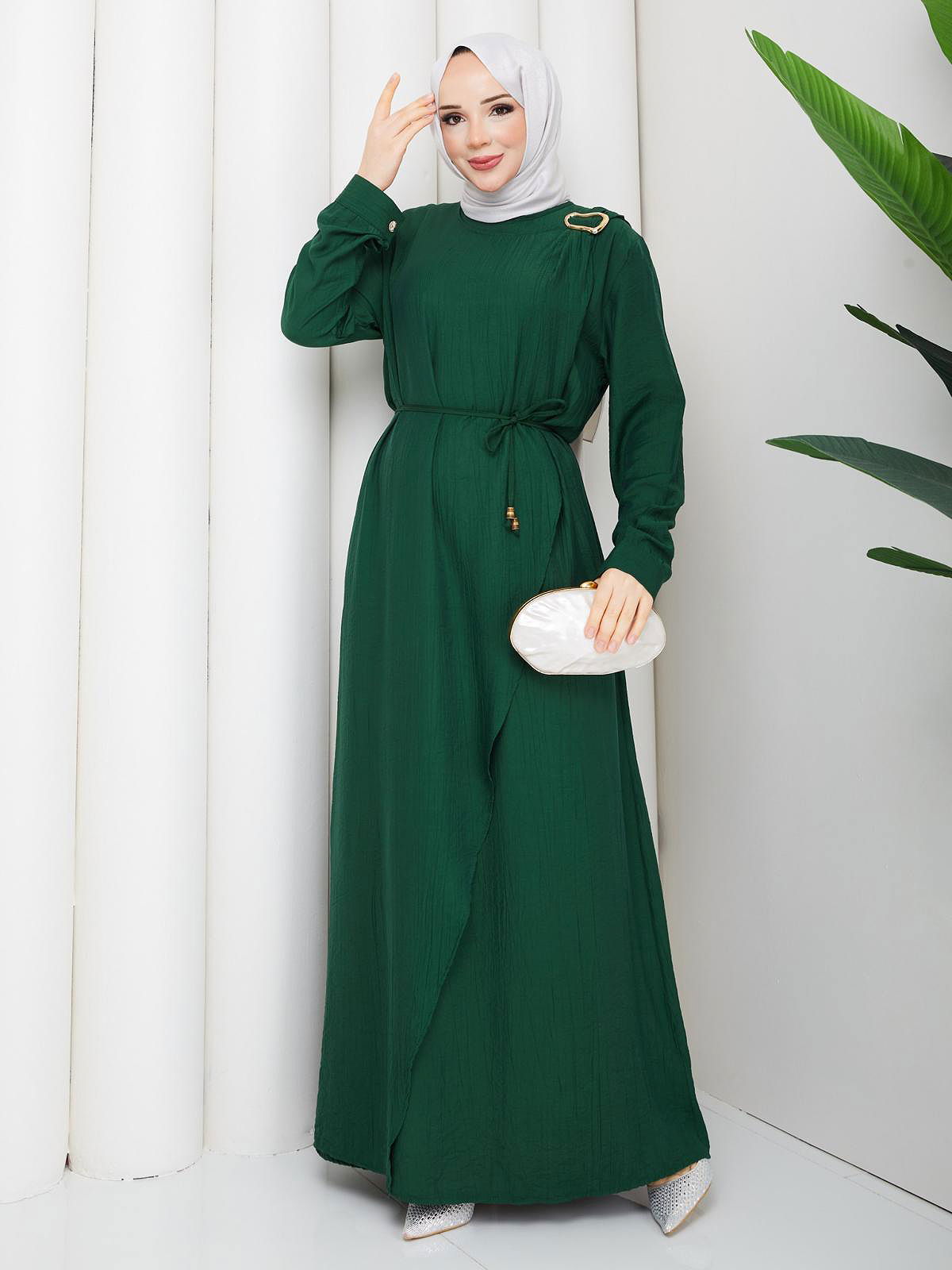 Toka Detaylı Tesettür Elbise-5145 Zümrüt yeşili