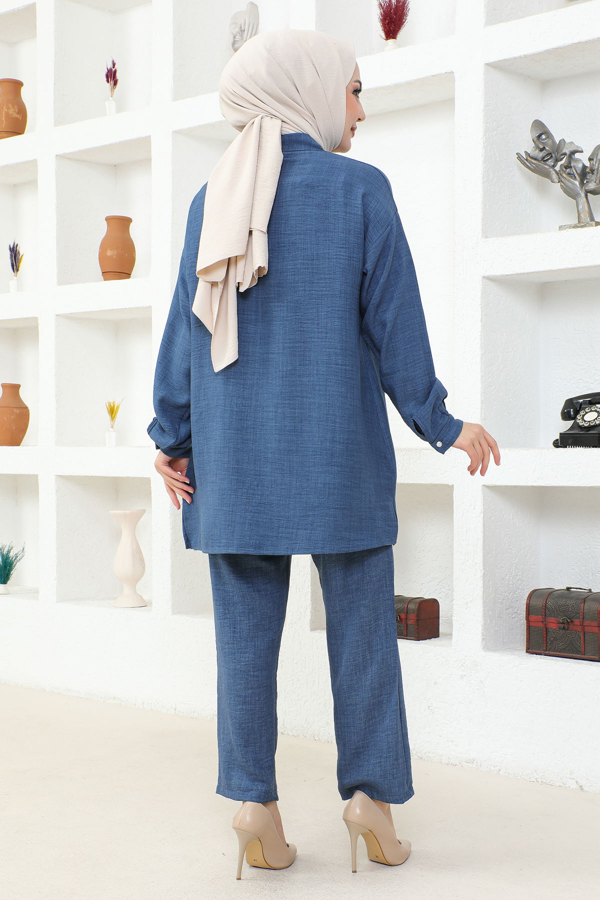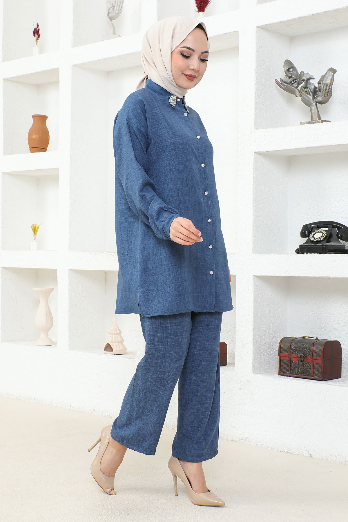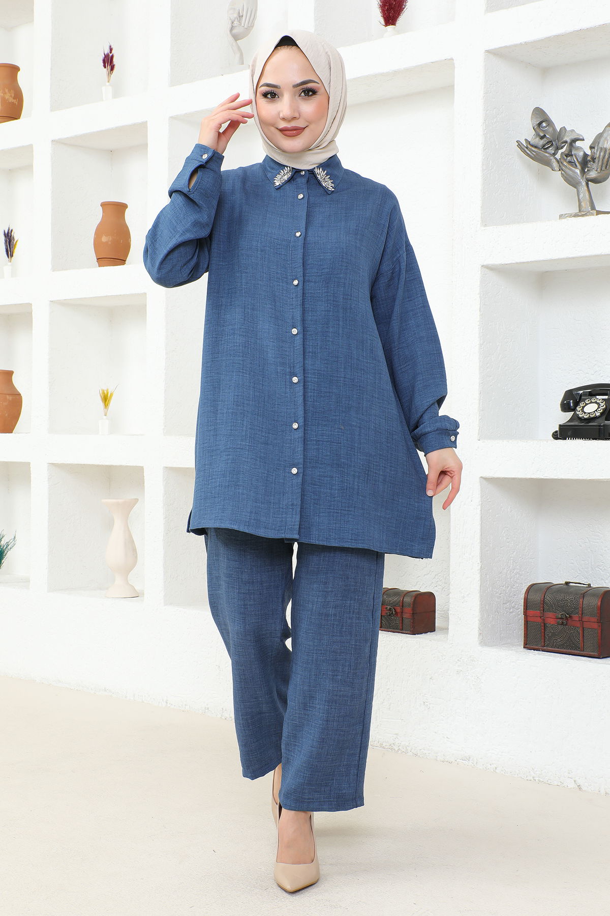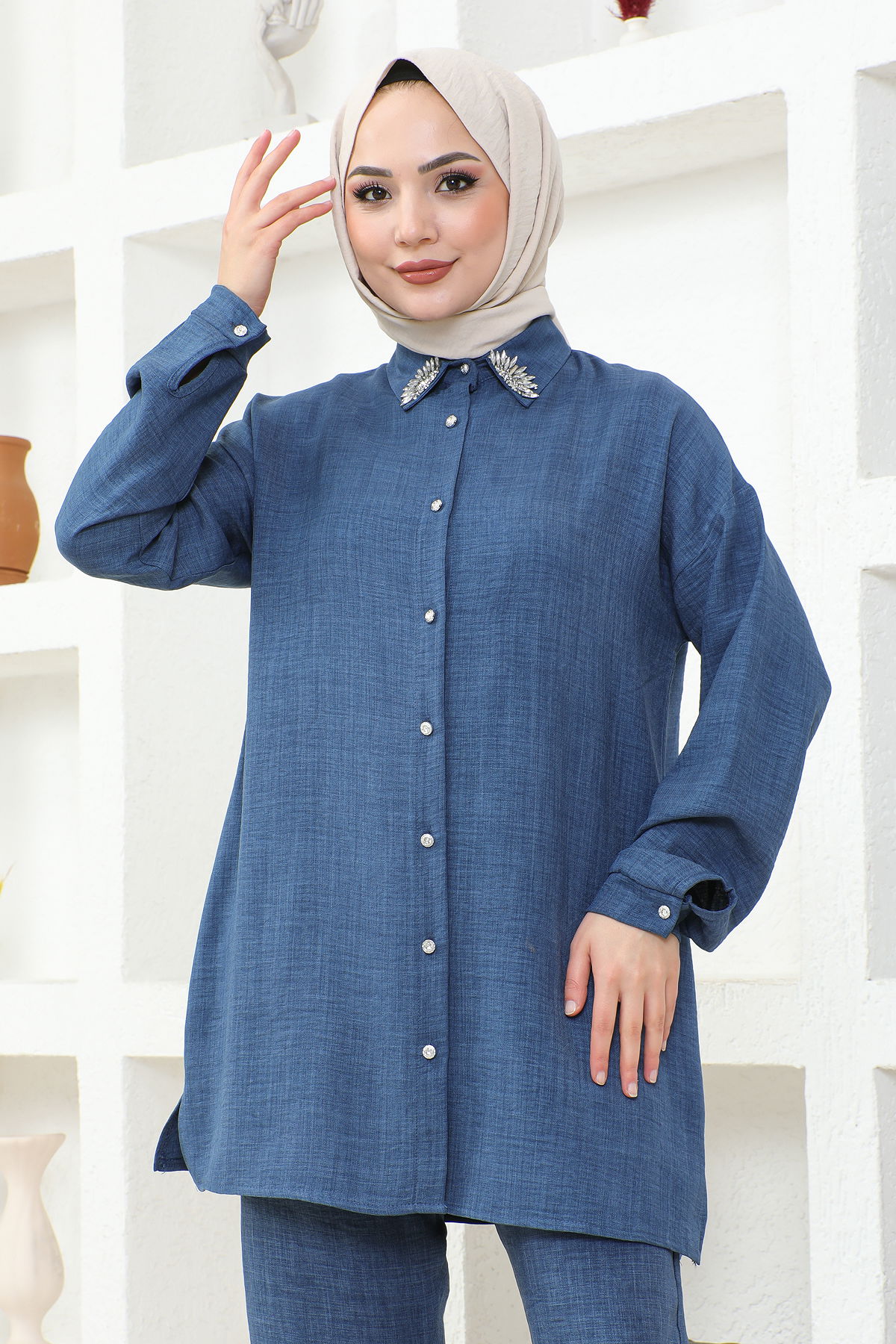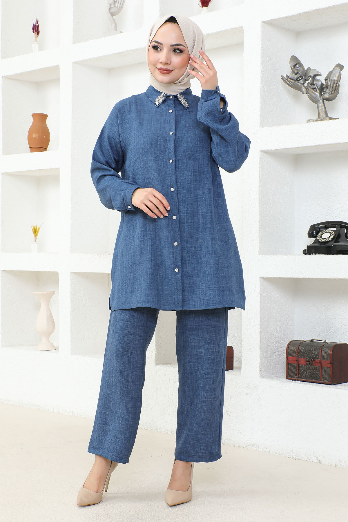 Yaka Taşlı İkili Tesettür Takım-3358 İndigo