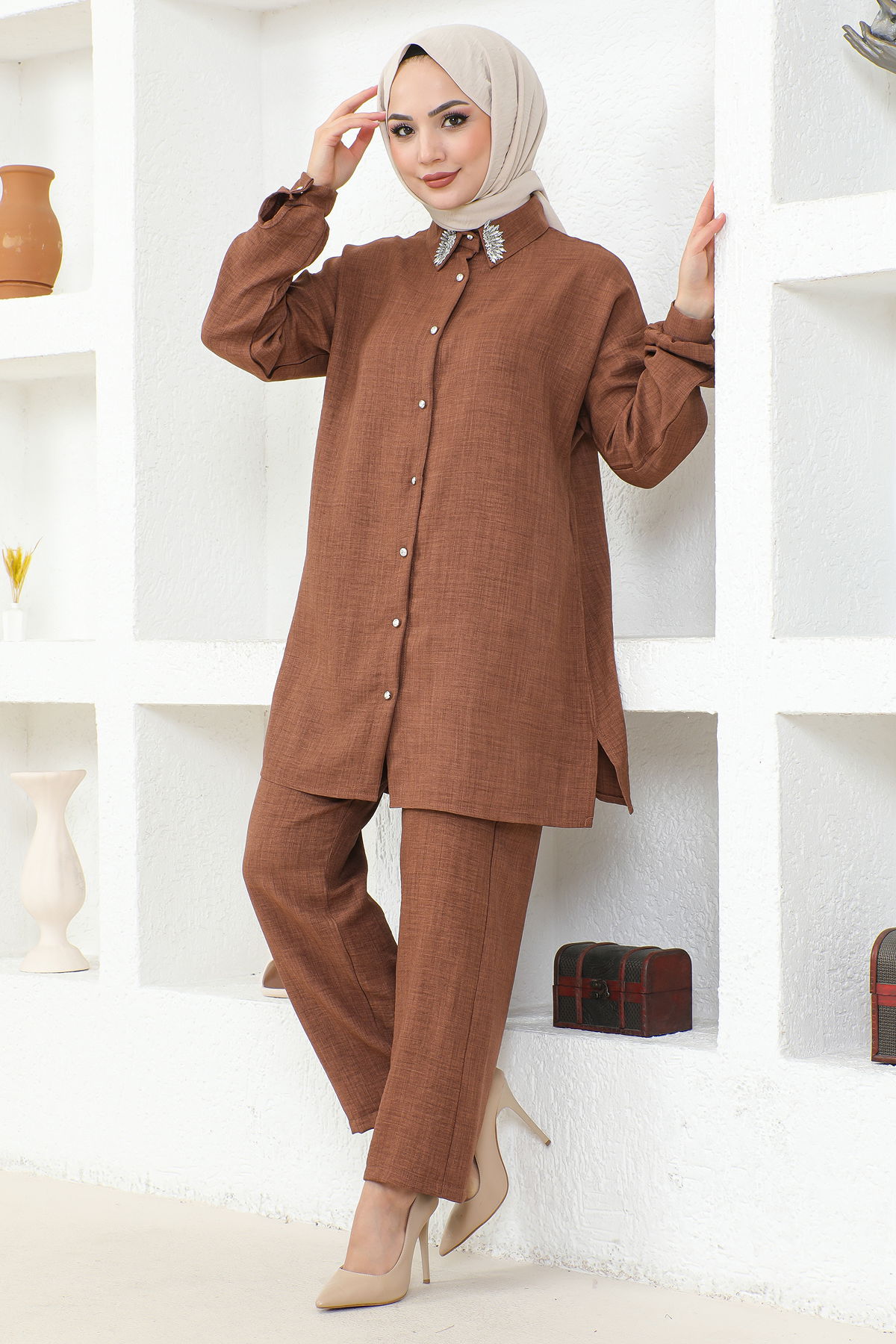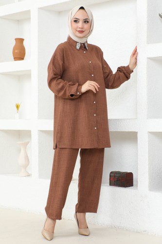 Yaka Taşlı İkili Tesettür Takım-3358 Kahve